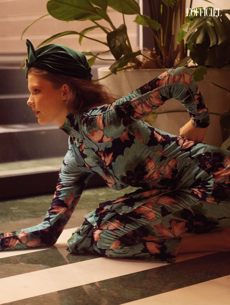 Бархатное платье Kenzo, бархатный тюрбан Yuri Ahn