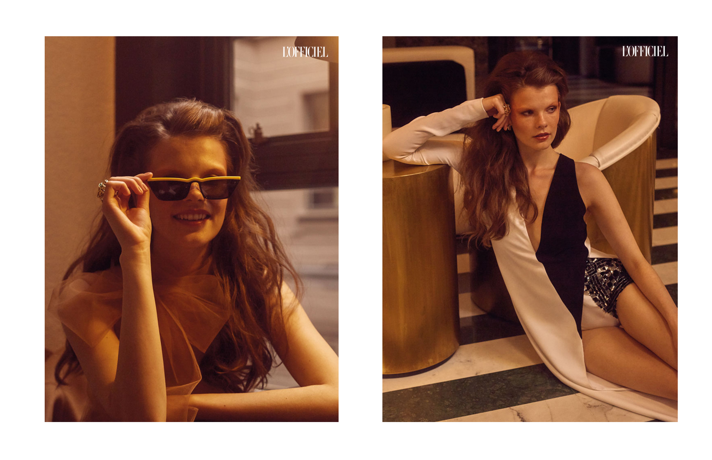 Слева: Платье из тюля и очки из ацетата Prada, золотое кольцо с гранатами и ониксом Cartier. Справа: Шелковый комбинезон Genny, золотое кольцо с гранатами и ониксом Cartier