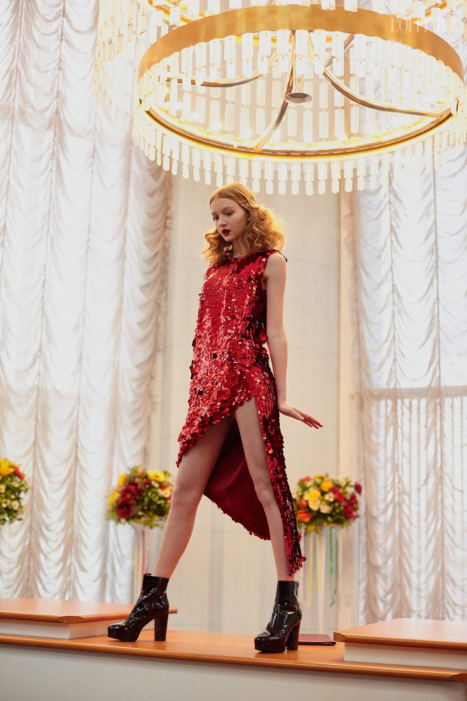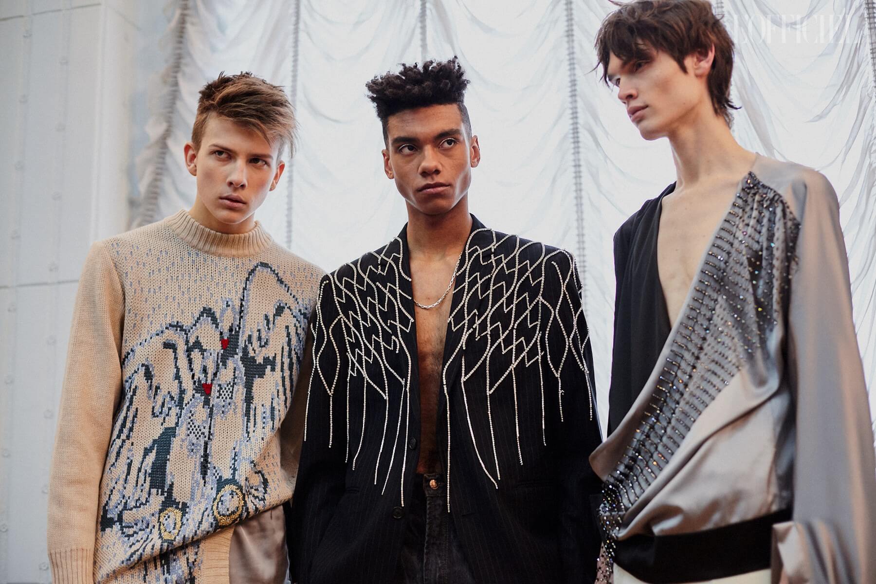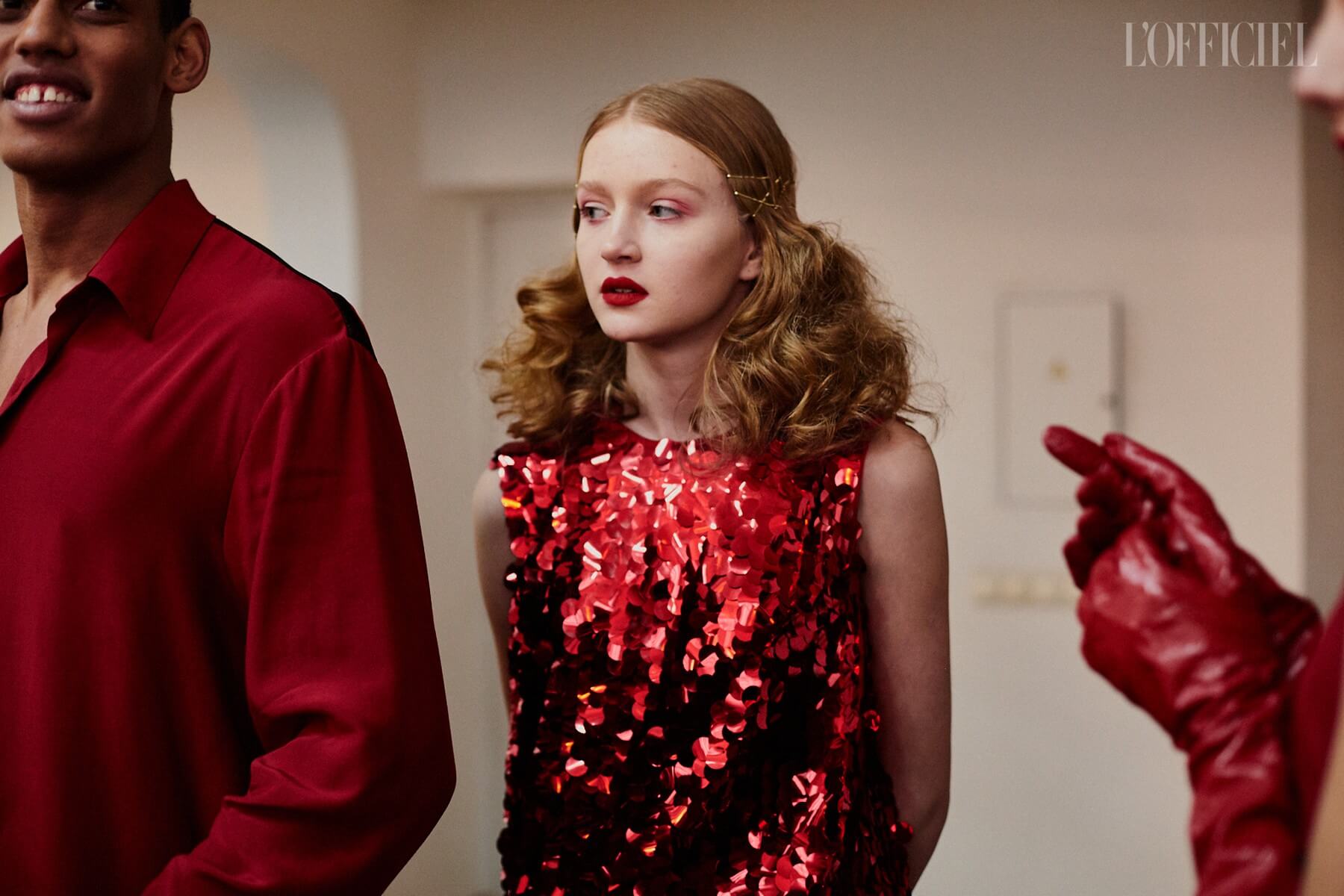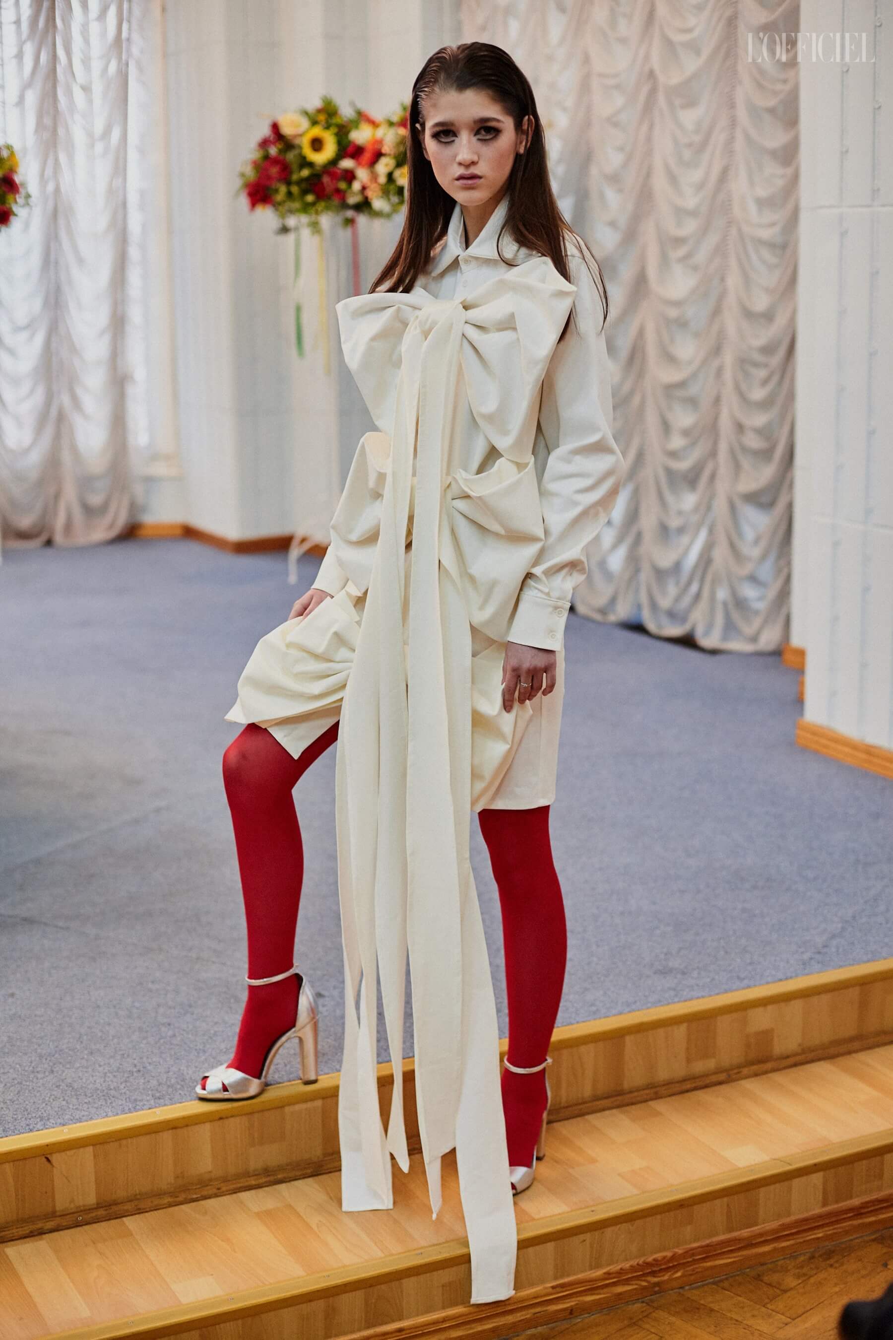 Для девушек Жан создал целый гардероб "подружки невесты": костюмы и платья из пайеток, шелковые асимметричные платья, — дополнив образы перчатками, объёмными бантами и летящими шлейфами.
