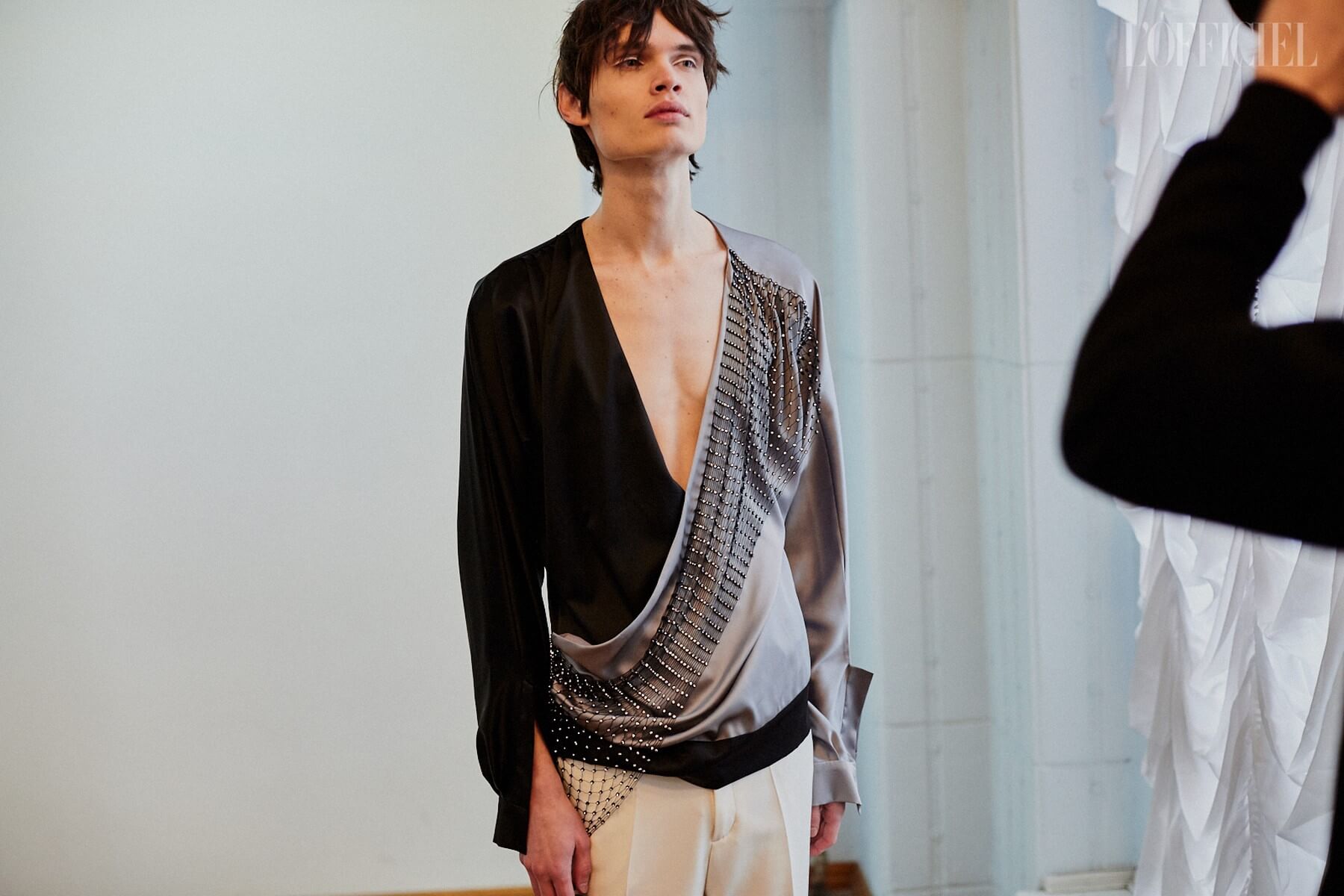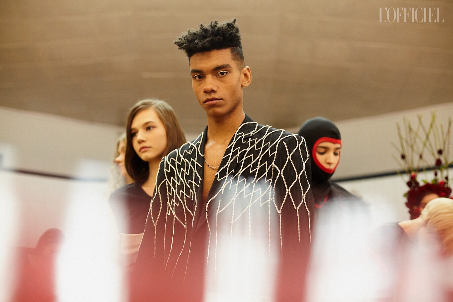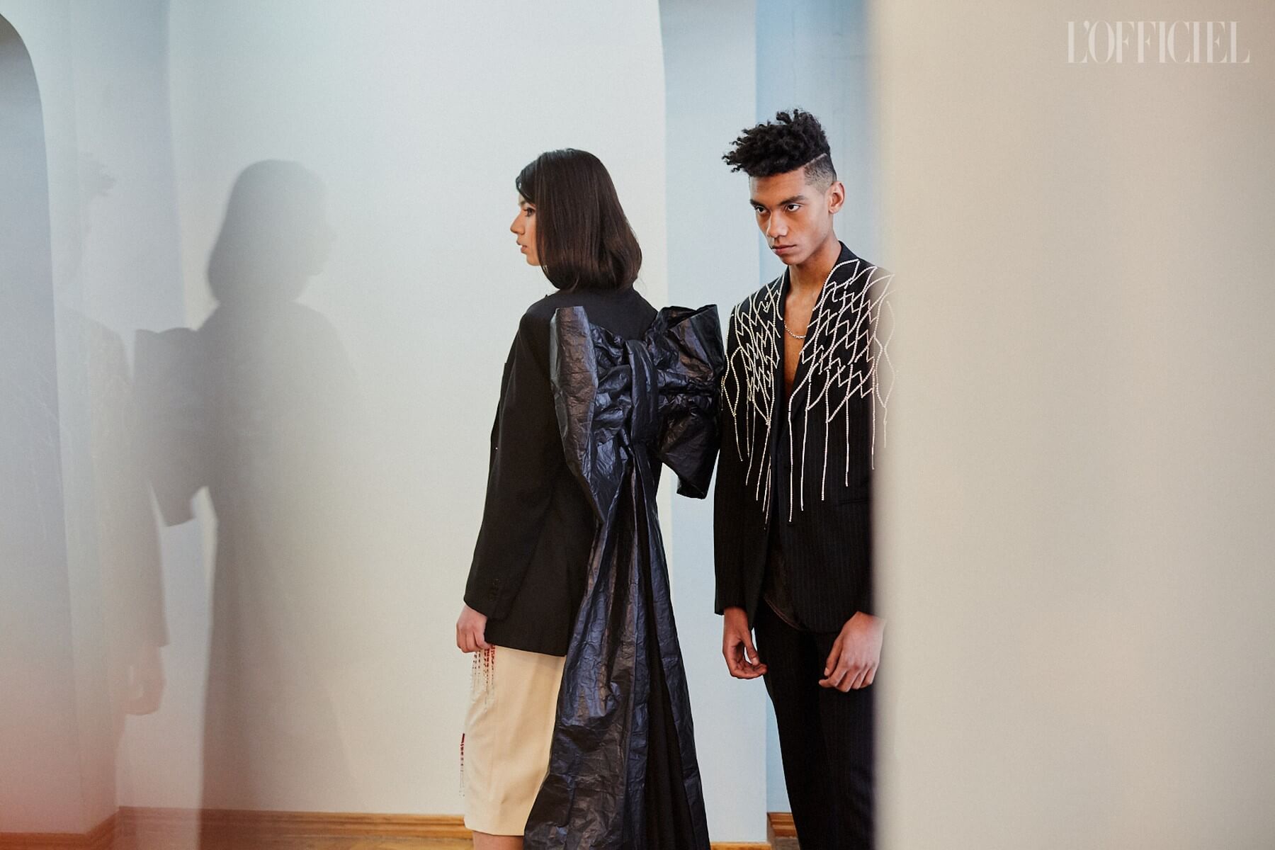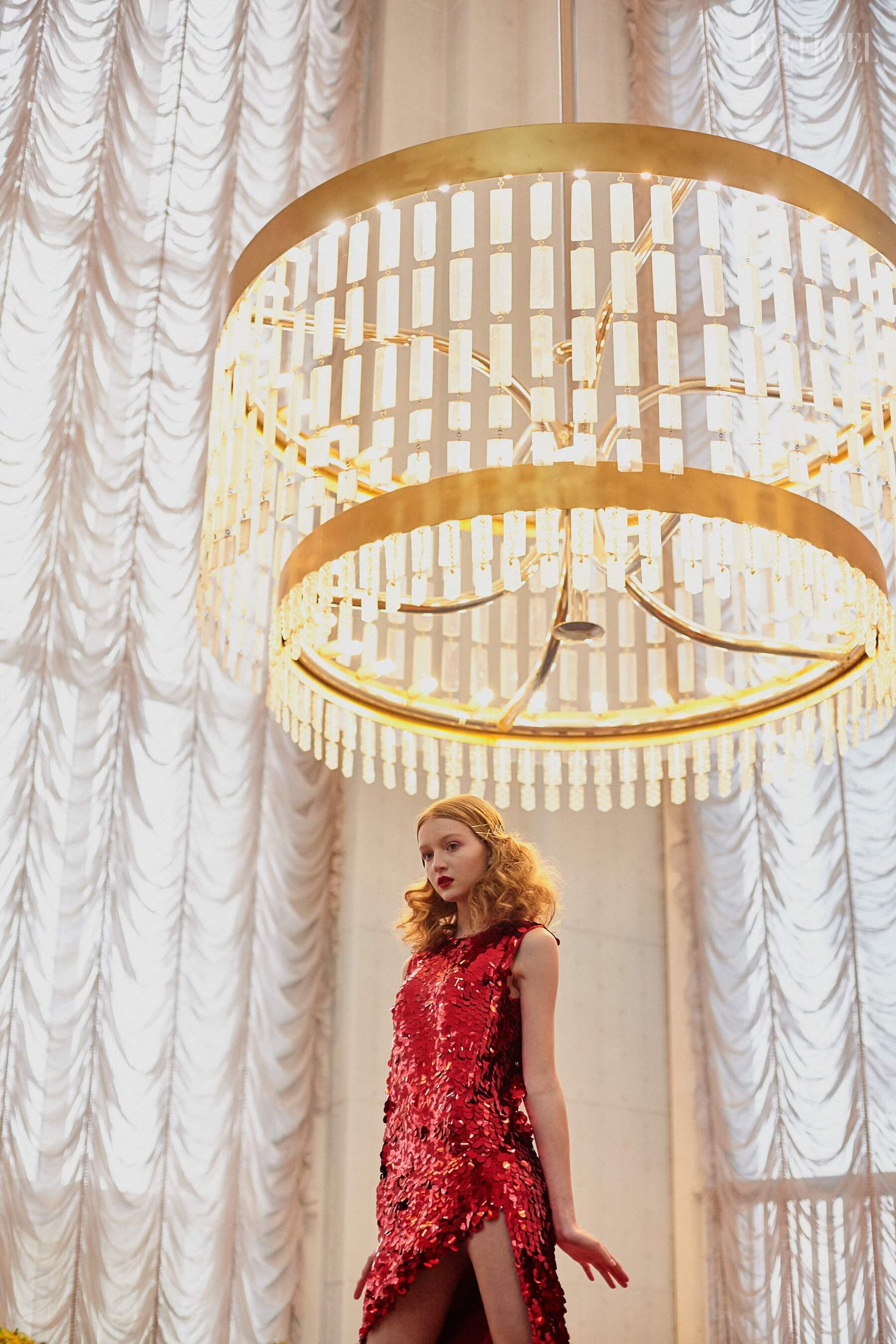 Для девушек Жан создал целый гардероб "подружки невесты": костюмы и платья из пайеток, шелковые асимметричные платья, — дополнив образы перчатками, объёмными бантами и летящими шлейфами.