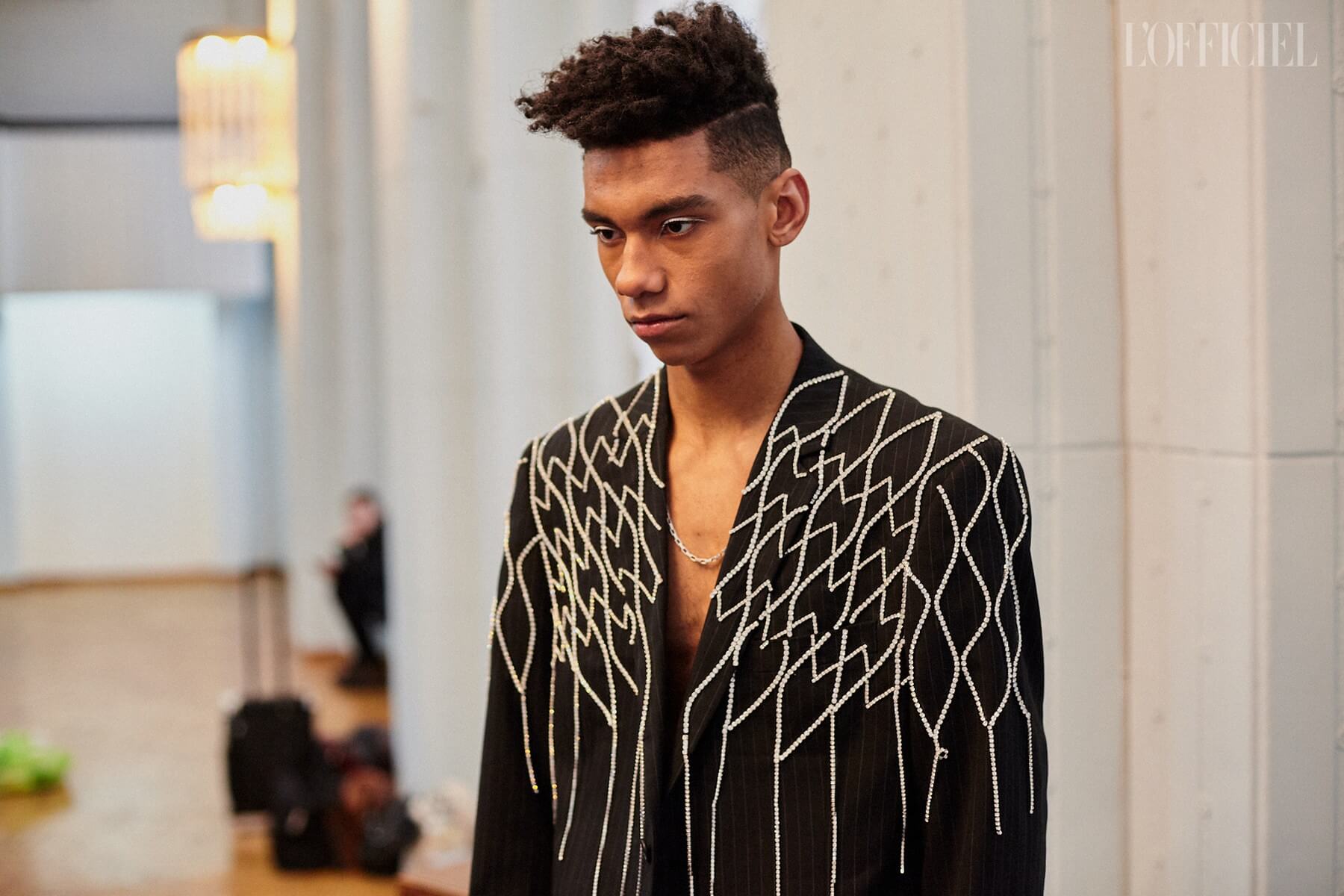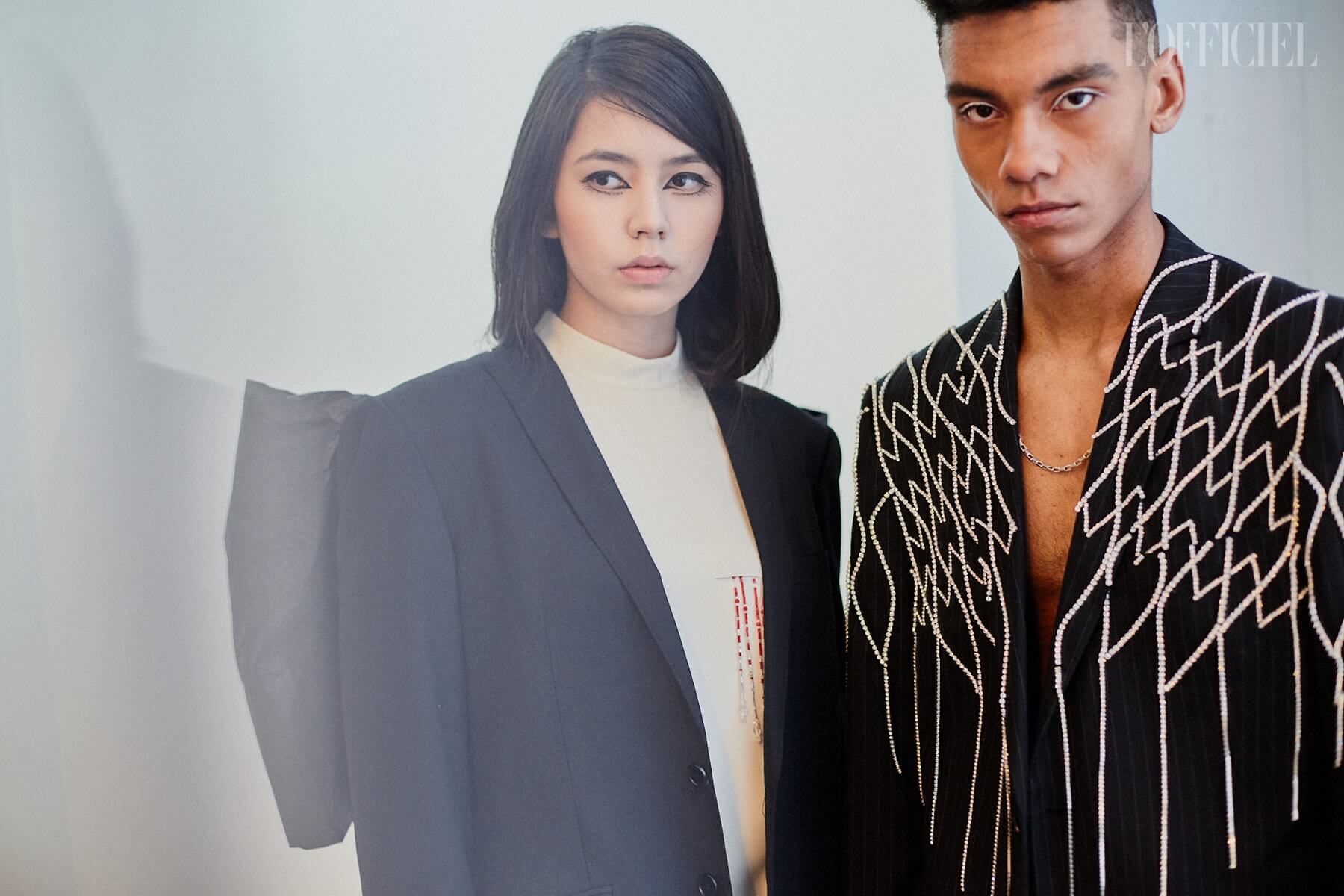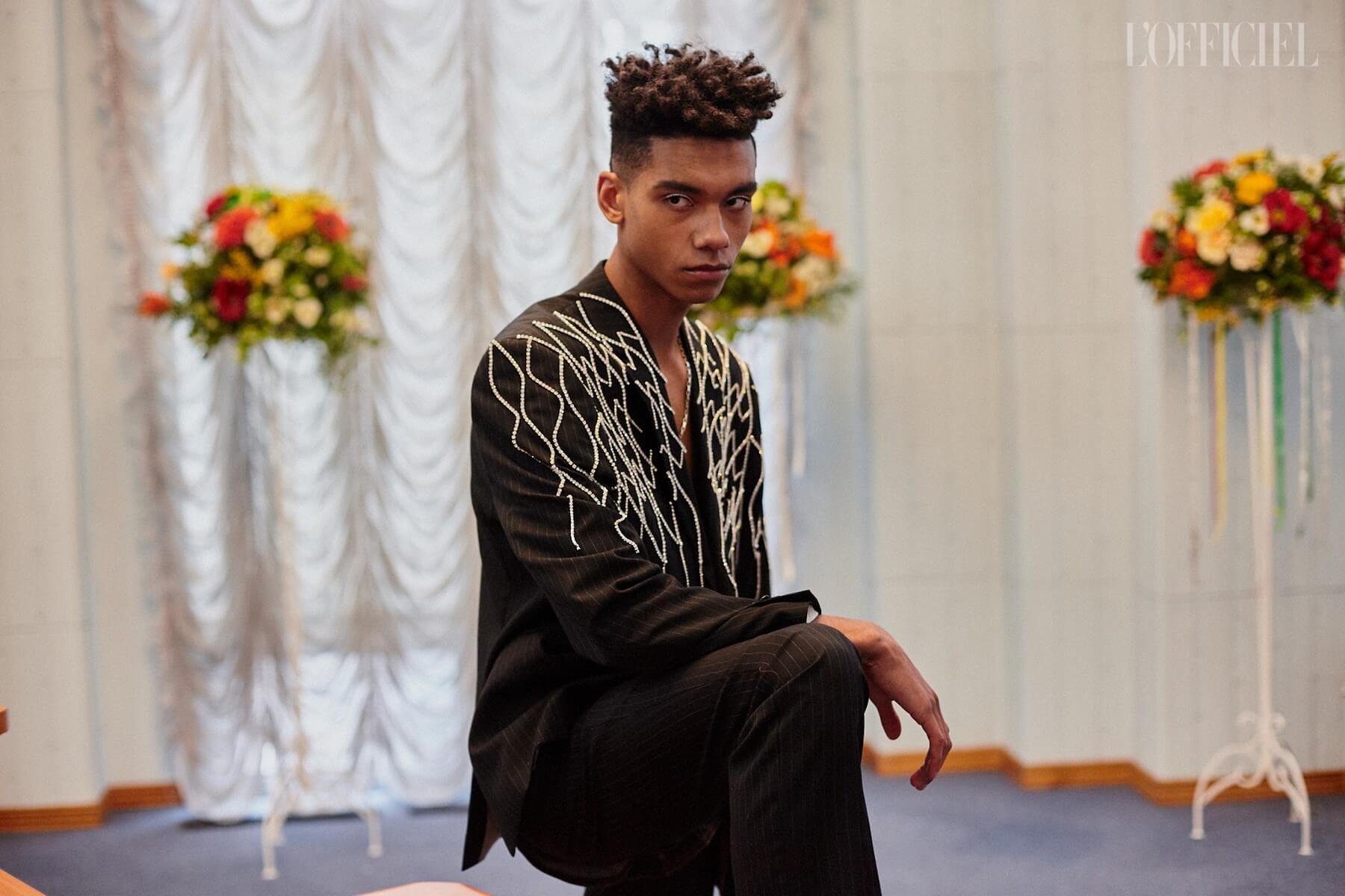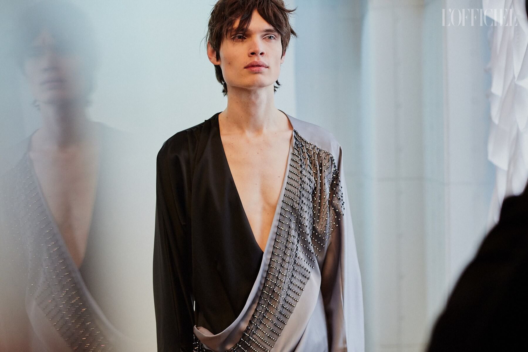 Для девушек Жан создал целый гардероб "подружки невесты": костюмы и платья из пайеток, шелковые асимметричные платья, — дополнив образы перчатками, объёмными бантами и летящими шлейфами.