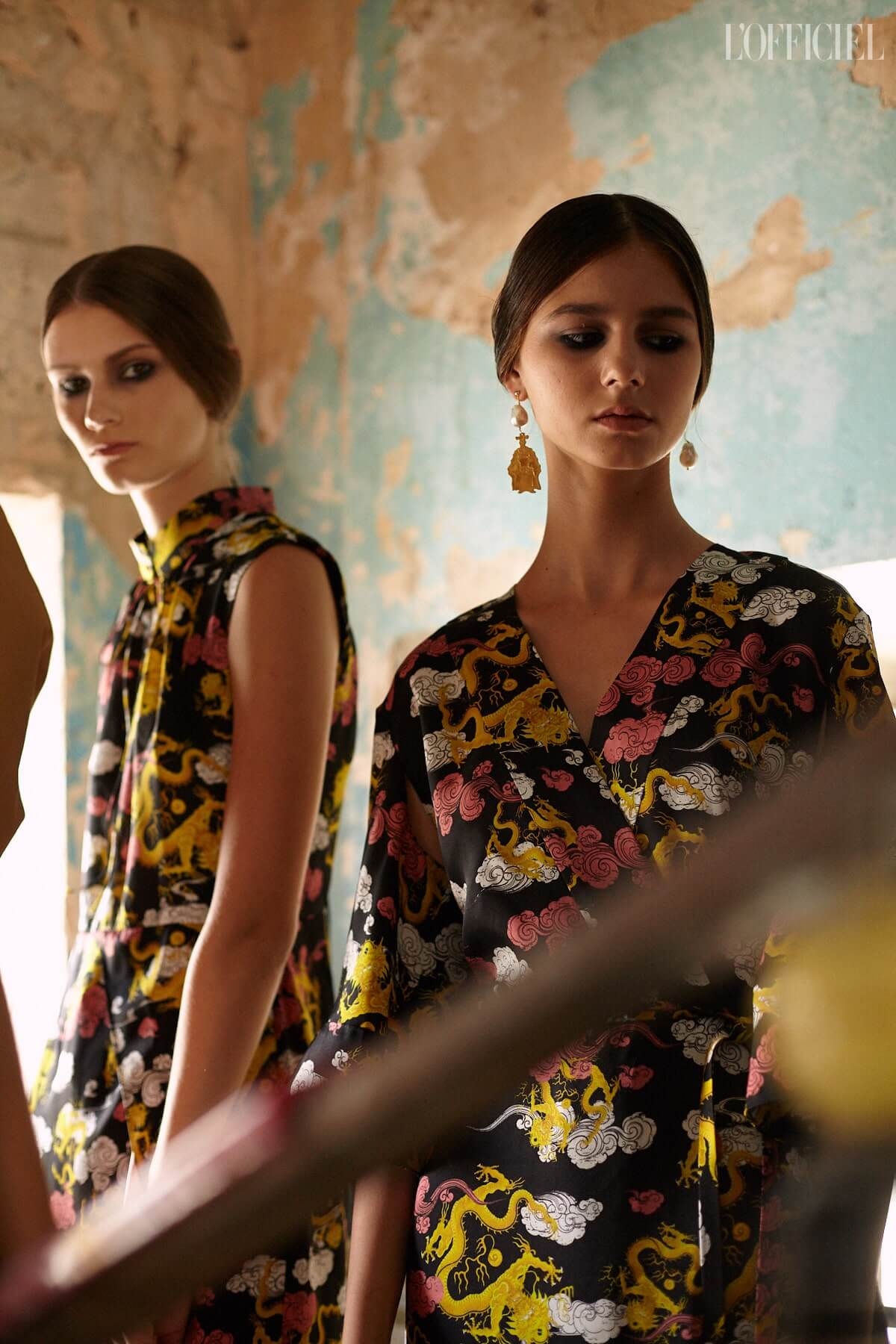 Дизайнеры Олеся Кононова и Анастасия Рябоконь продолжают исследовать Восток, с его философией, эстетикой и канонами искусства, вот уже второй сезон подряд. Аутентичные азиатские мотивы интегрированы в коллекцию и в виде принтов огненно-желтых драконов в белых облаках, как на фарфоровых вазах Китая 14 века, и фигур самураев разных рангов.