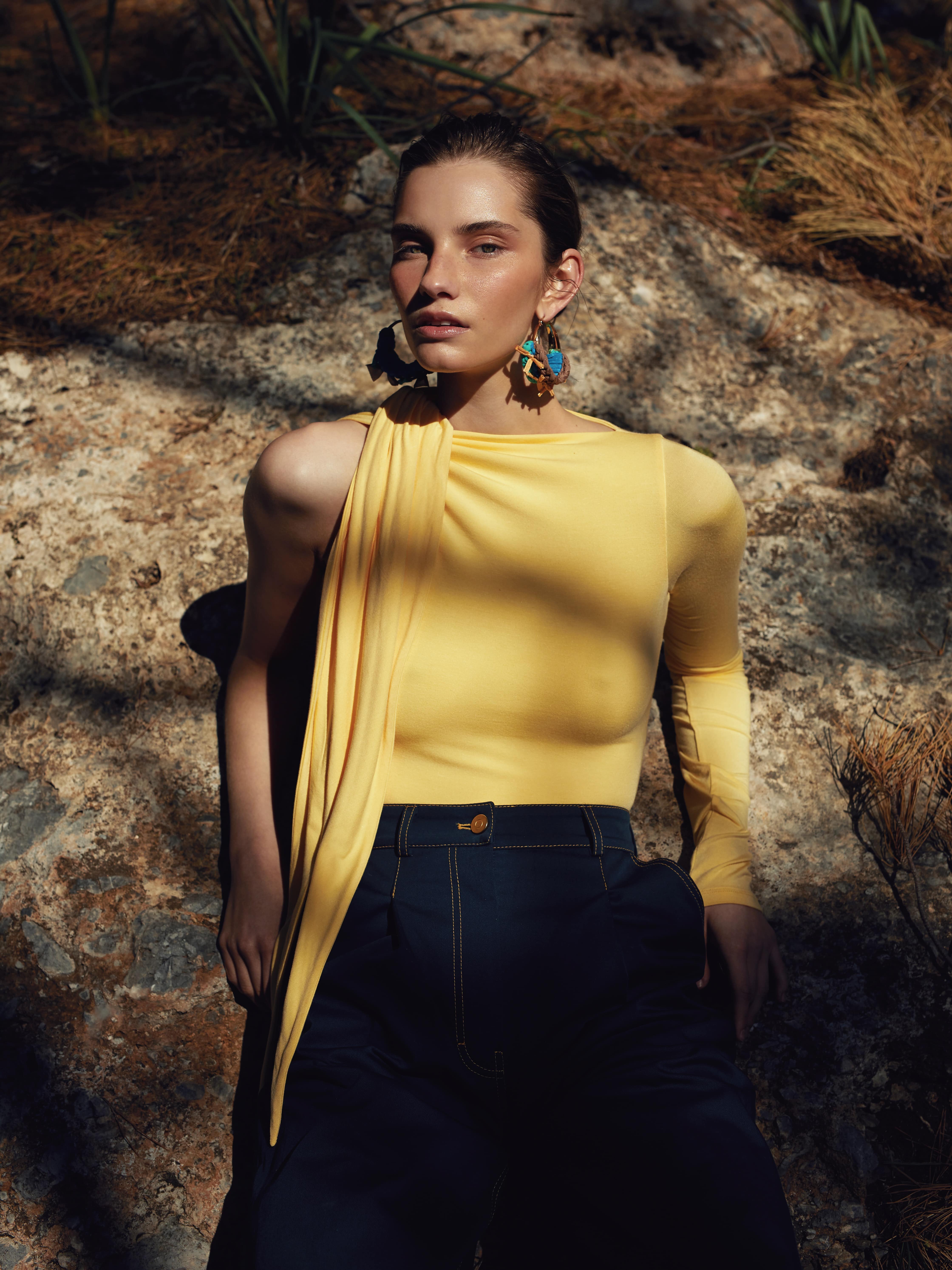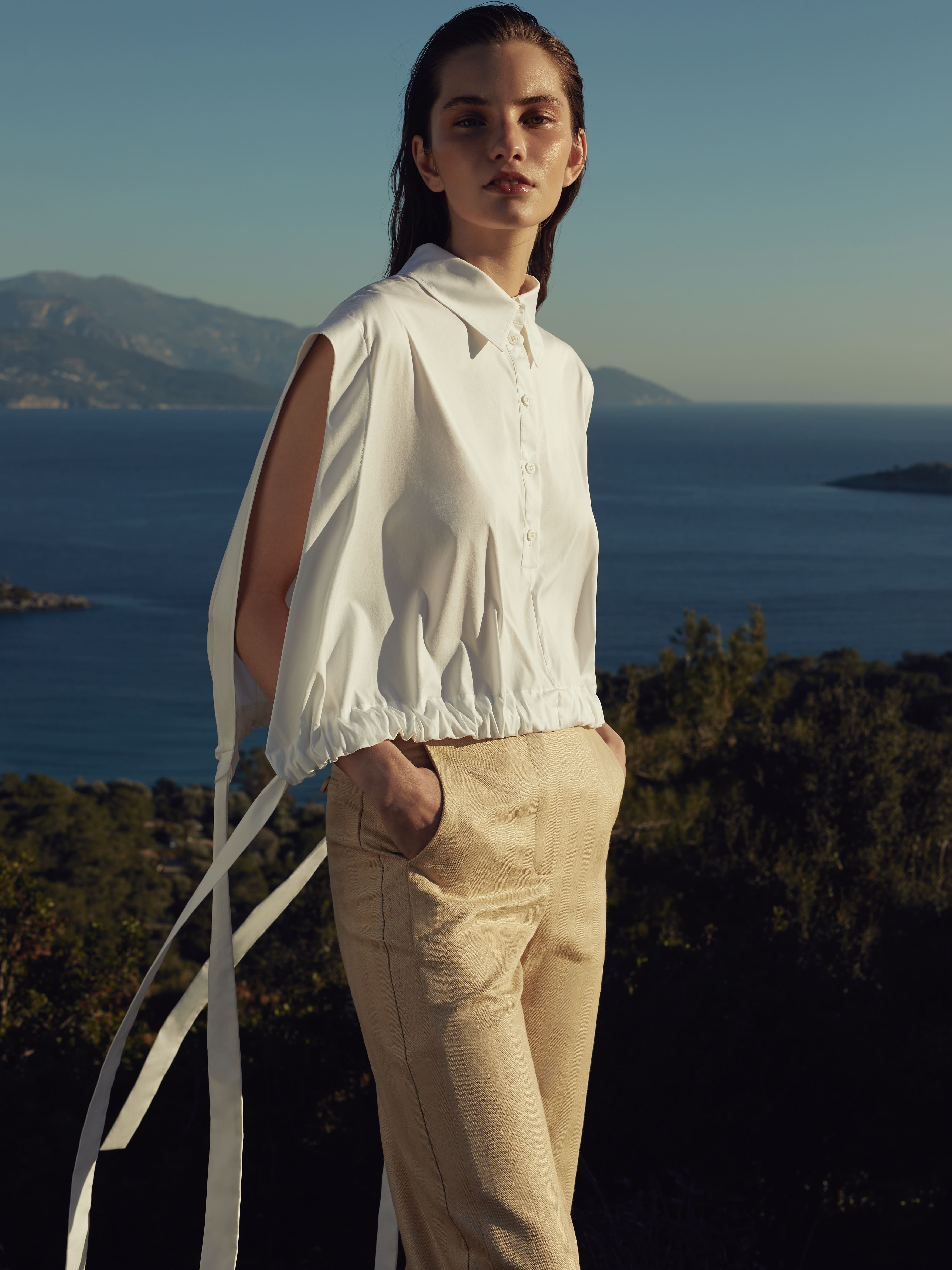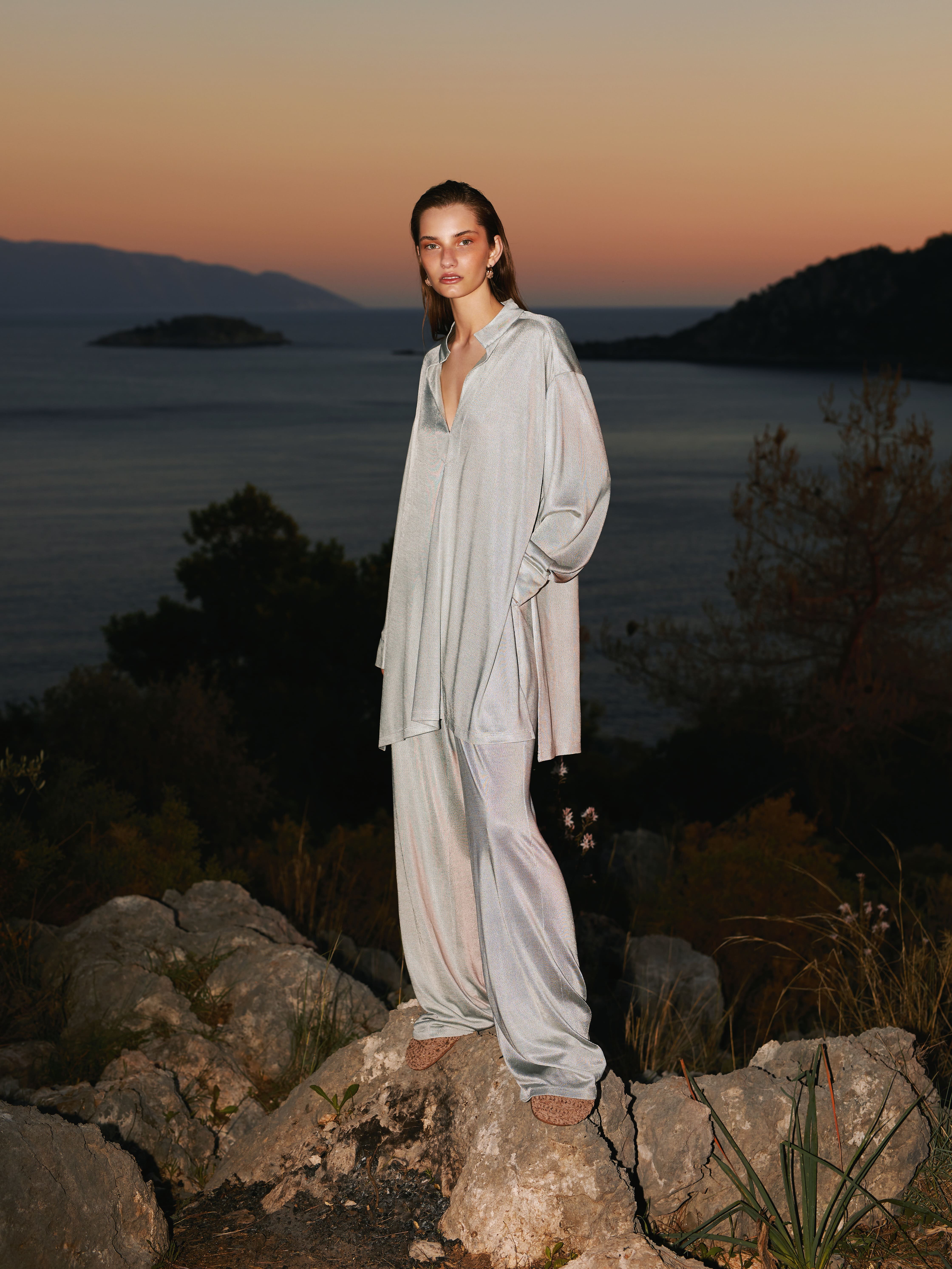 Трикотаж — основной материал, выбранный брендом для летних путешествий. Свободные брючные двойки, мягкие расслабленные силуэты платьев, джемперы из вискозы, хлопка и шелка как будто созданы для уединения и созерцания волшебных закатов. В коллекцию также вошли купальники, топы и сарафаны с чувственными акцентами — обнаженным плечом или тонкими прорезями в районе ключиц.