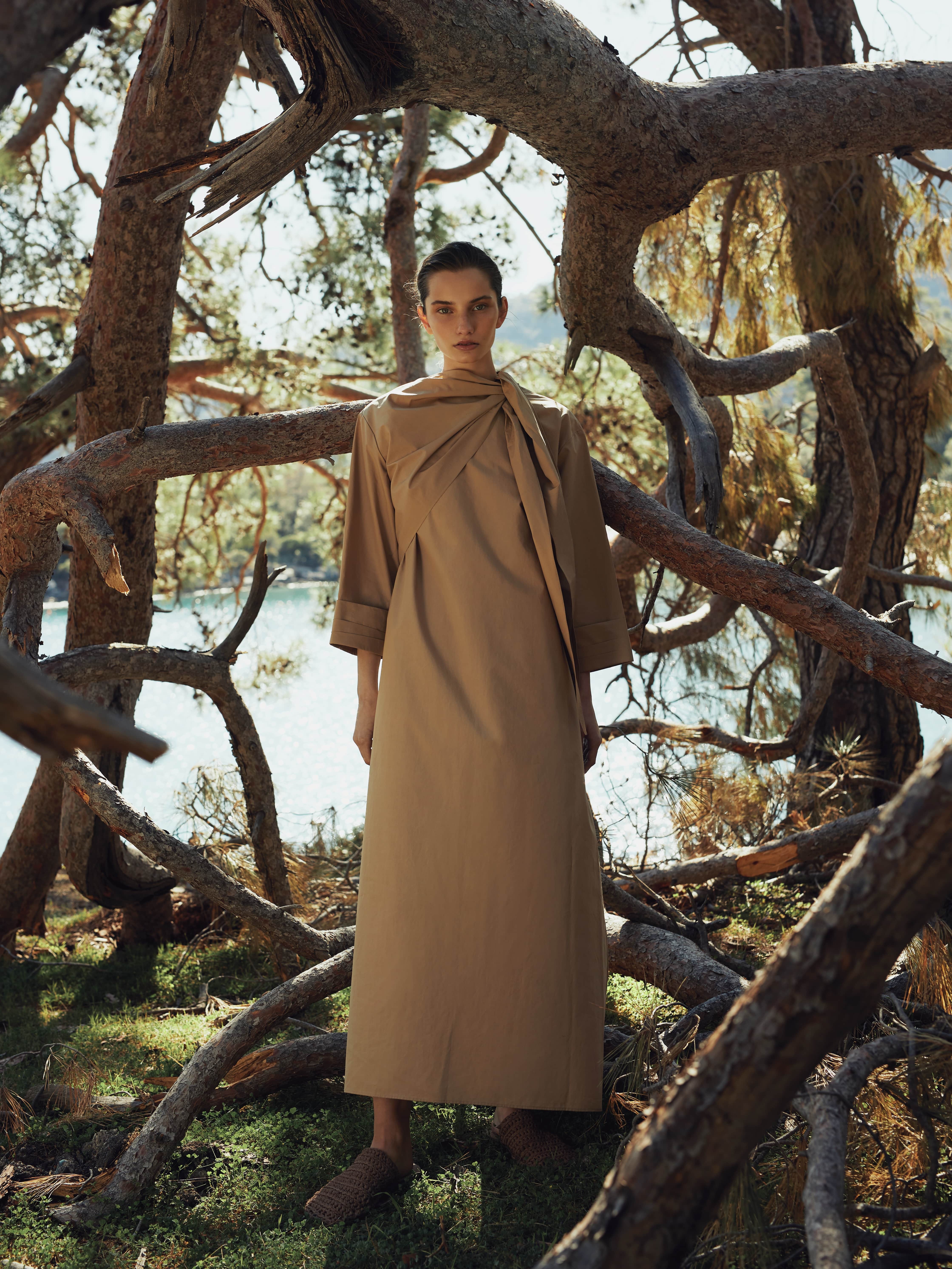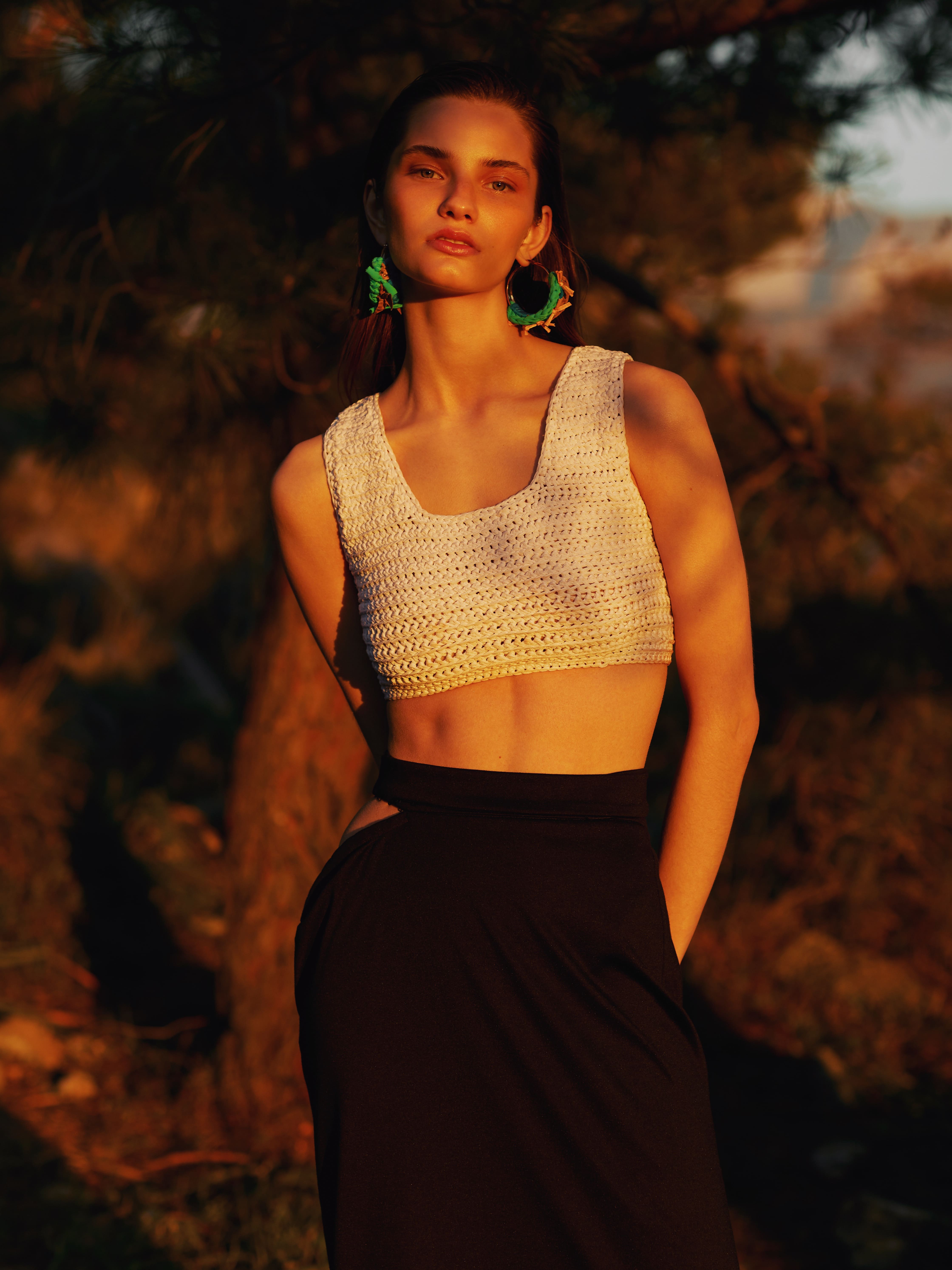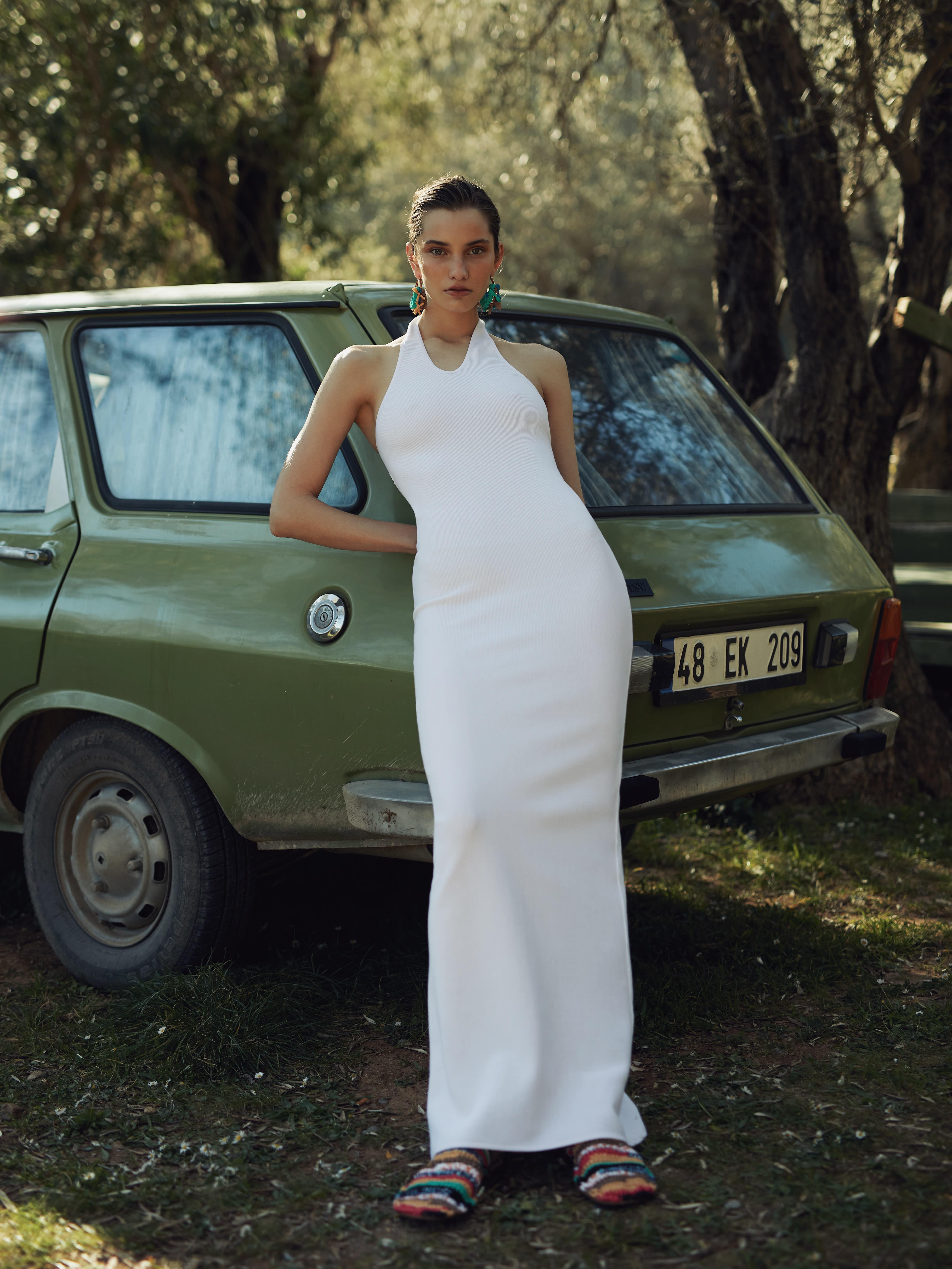 Трикотаж — основной материал, выбранный брендом для летних путешествий. Свободные брючные двойки, мягкие расслабленные силуэты платьев, джемперы из вискозы, хлопка и шелка как будто созданы для уединения и созерцания волшебных закатов. В коллекцию также вошли купальники, топы и сарафаны с чувственными акцентами — обнаженным плечом или тонкими прорезями в районе ключиц.