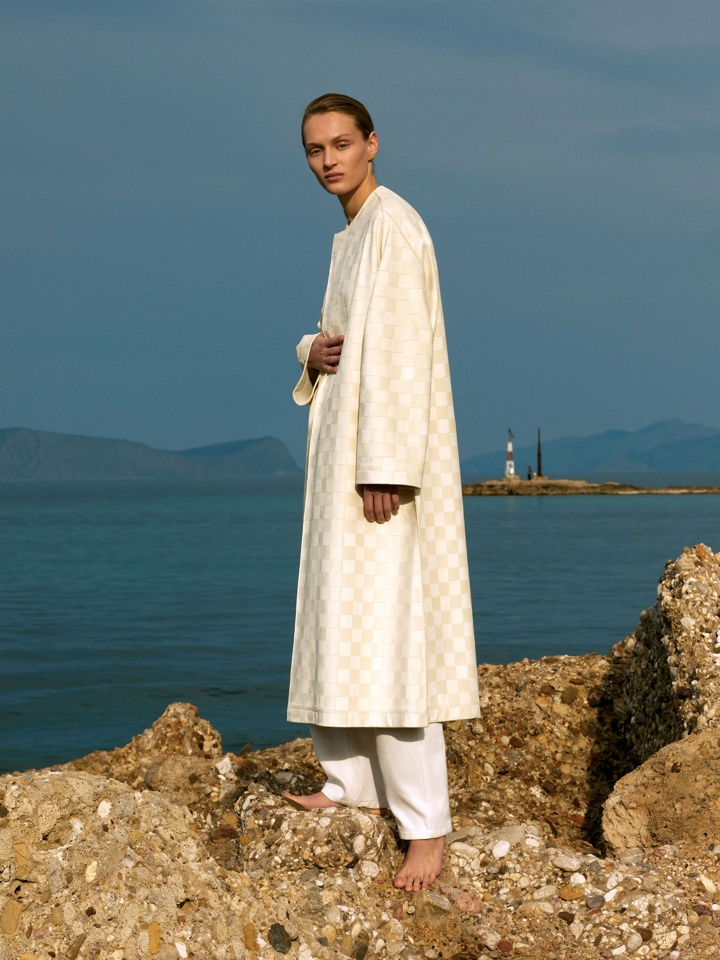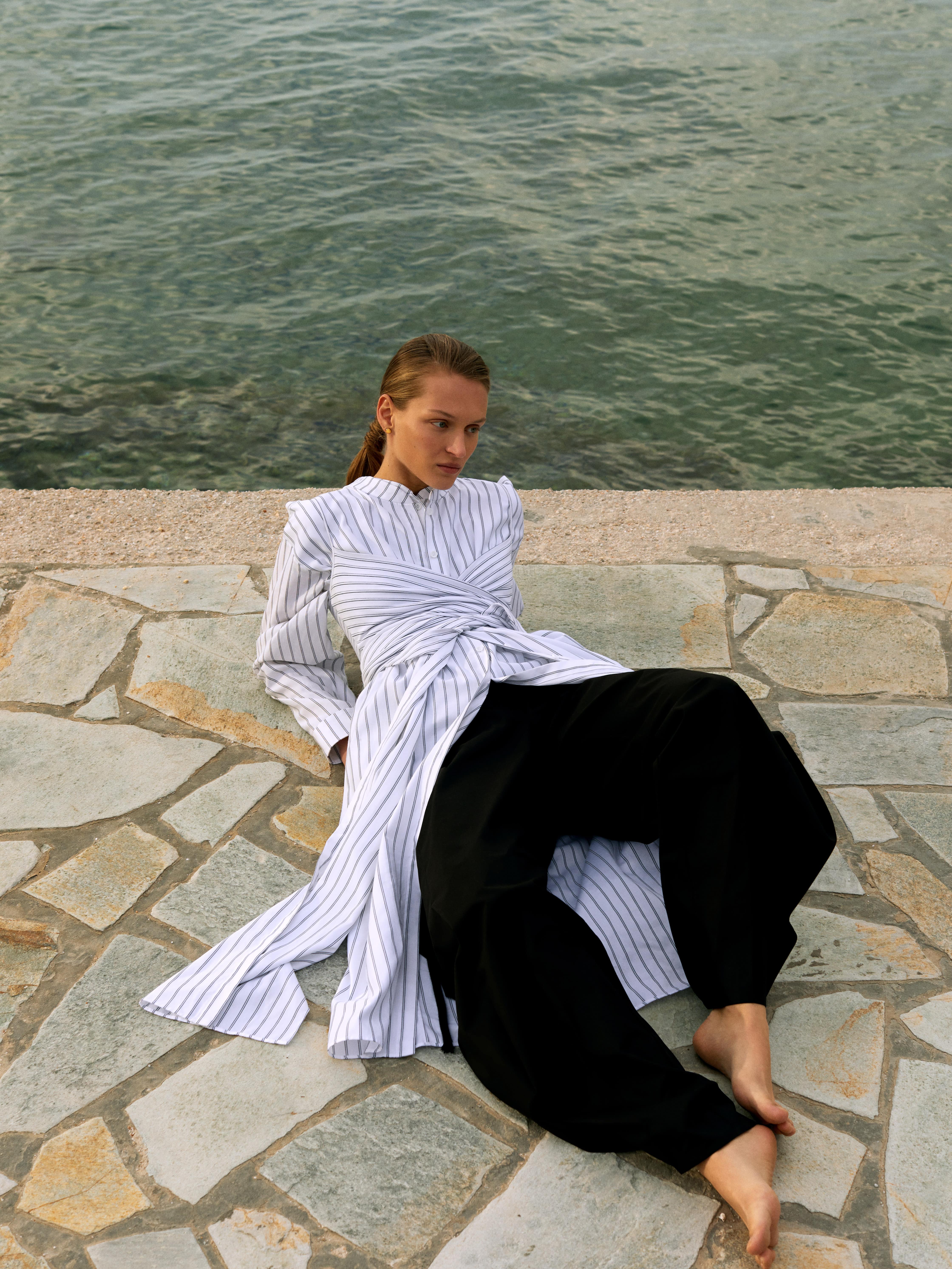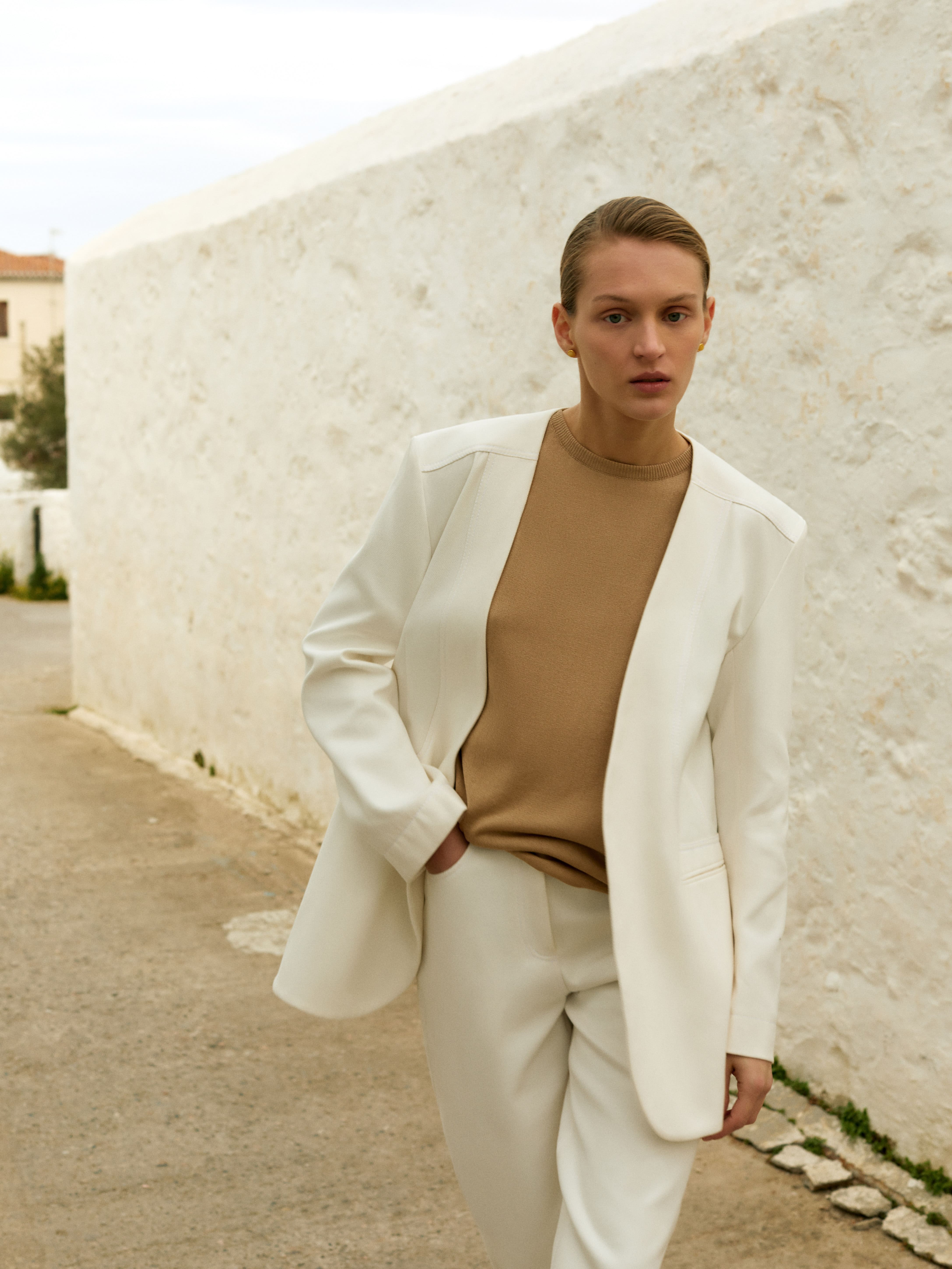 Формальную мужскую классику дизайнер переосмысляет для повседневного женского гардероба. Костюмы-тройки трансформируются в брючные пары расслабленного силуэта. Сорочки оверсайз с двумя передними планками можно носить разными способами, меняя силуэт: от объемной рубашки до приталенного платья. Используя технику пошива мужских классических брюк, дизайнер создает конструкцию регулируемого пояса – объем меняется без ущерба для формы, так что вещь можно носить высоко на талии или на бедрах.