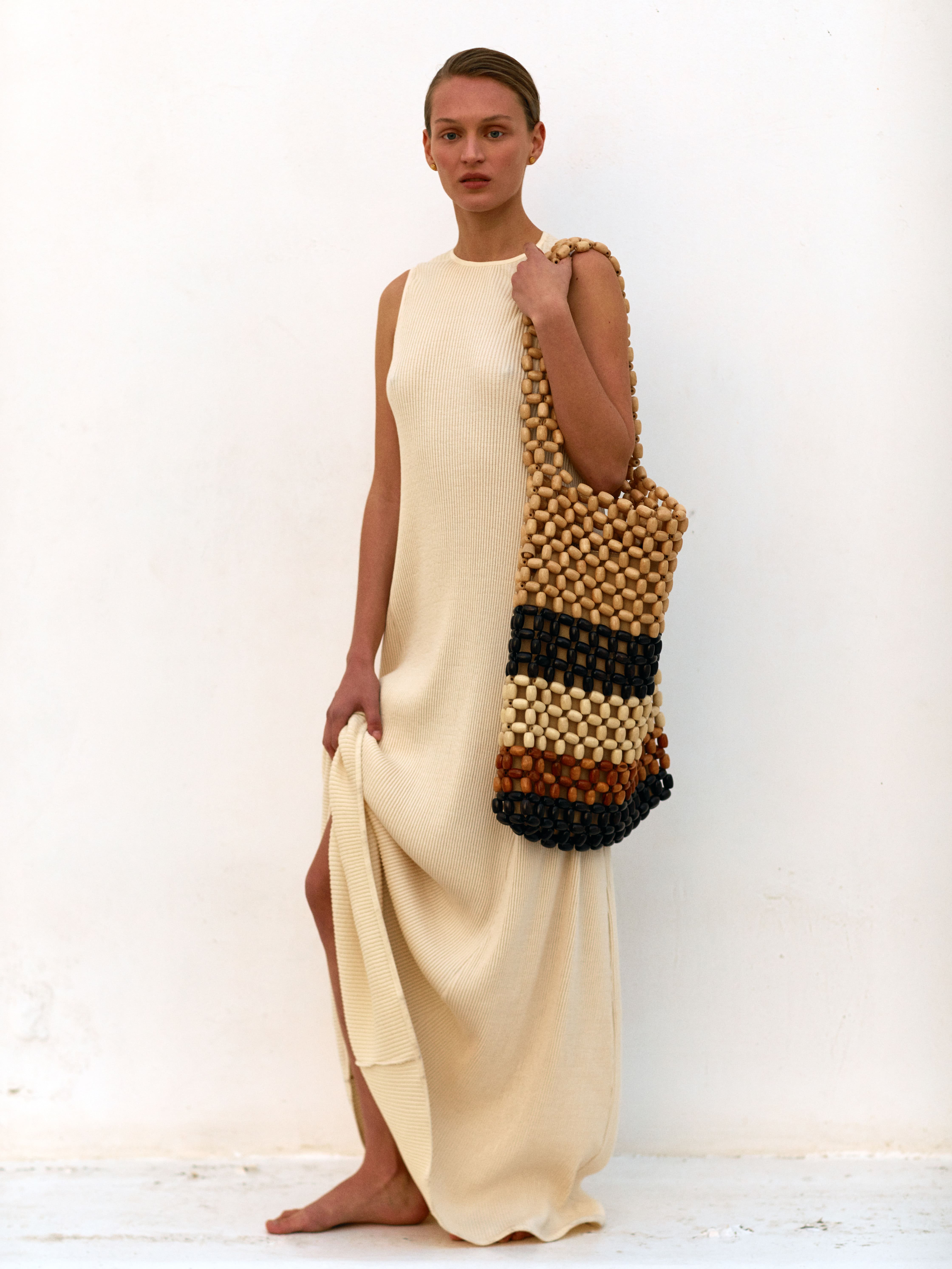 Аксессуары традиционно сильная сторона бренда. Двуцветные шоперы и клатчи из деревянных бусин-бочонков плелись на Западной Украине. Серьги с застежкой-полусферой из покрытого золотом металла дополнены фольклорными "коныками" из расписной керамики или бусинами из натуральных камней: янтаря, лунного камня, хризопраза.