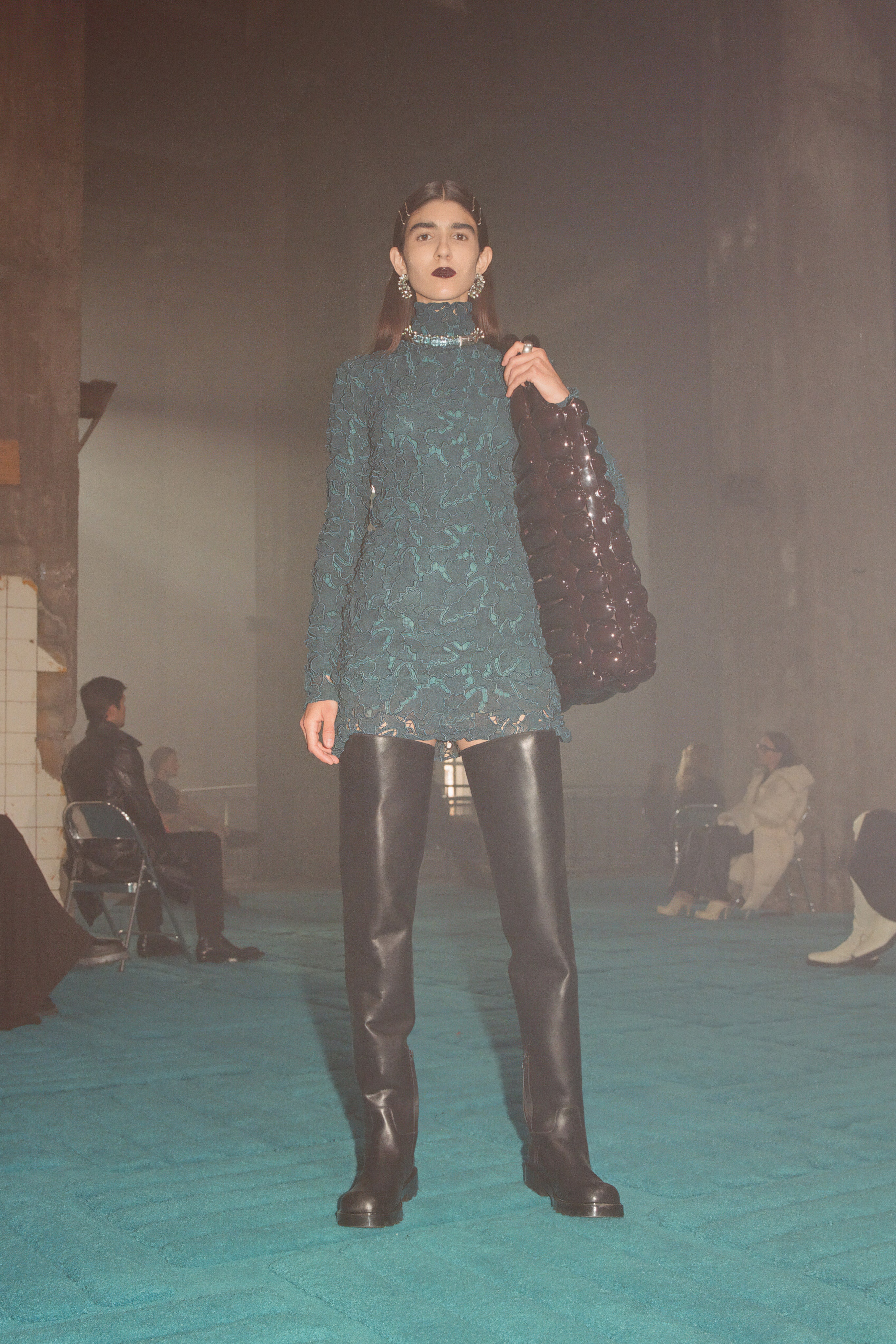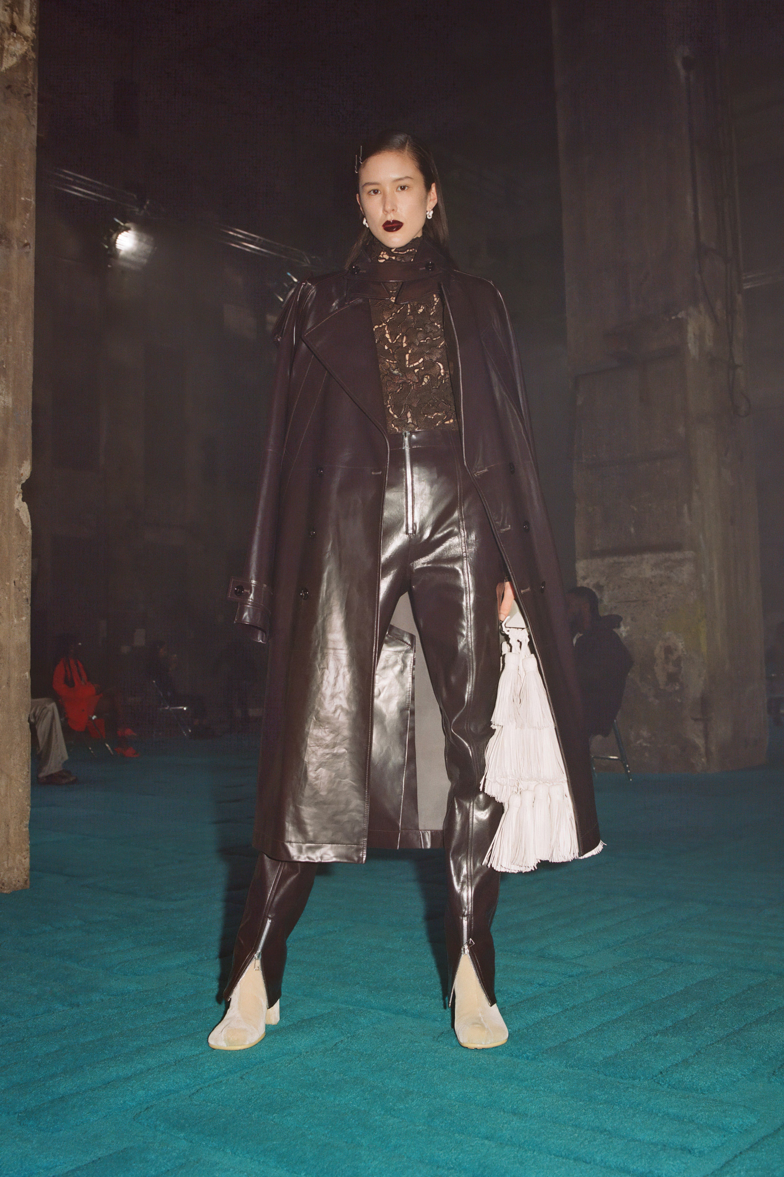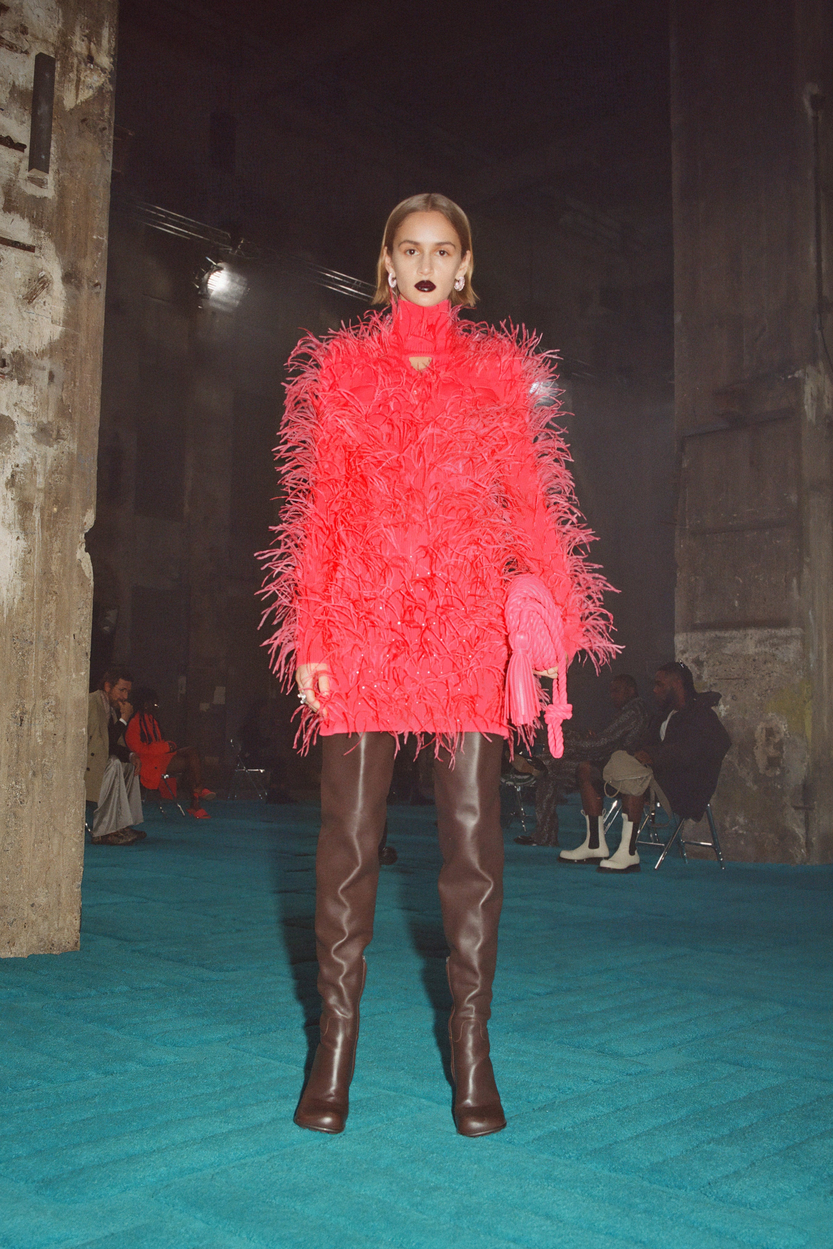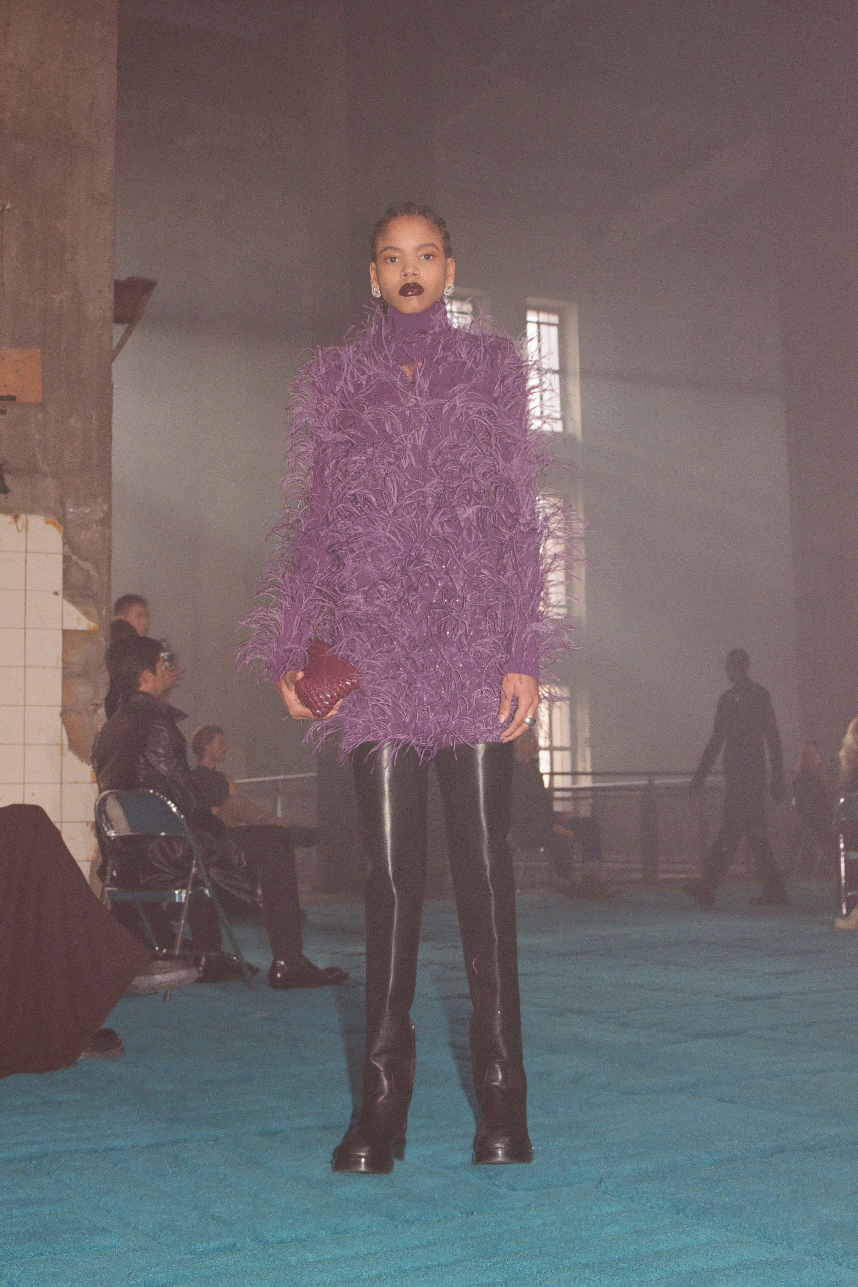 В осенне-зимнюю коллекцию Bottega Veneta вошли шубы из искусственного меха, пальто, костюмы, кожаные тренчи, свитера с объемными рукавами и платья из плотного коттона с перьями, из кашемира со стеклярусом и кожи. Среди обуви — сапоги-трубы (самые интересные — с принтом зебры!), мюли, лоферы и броги.