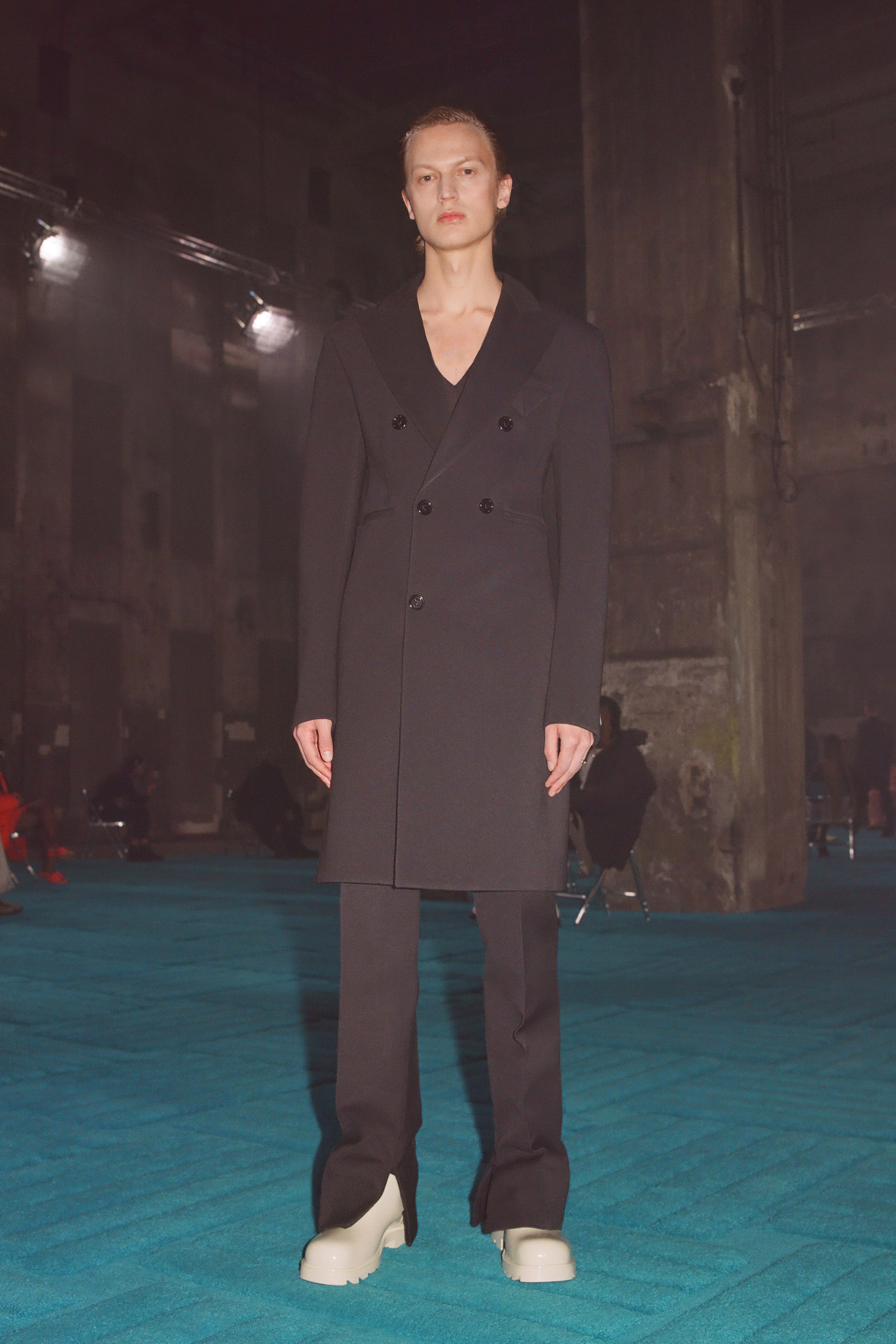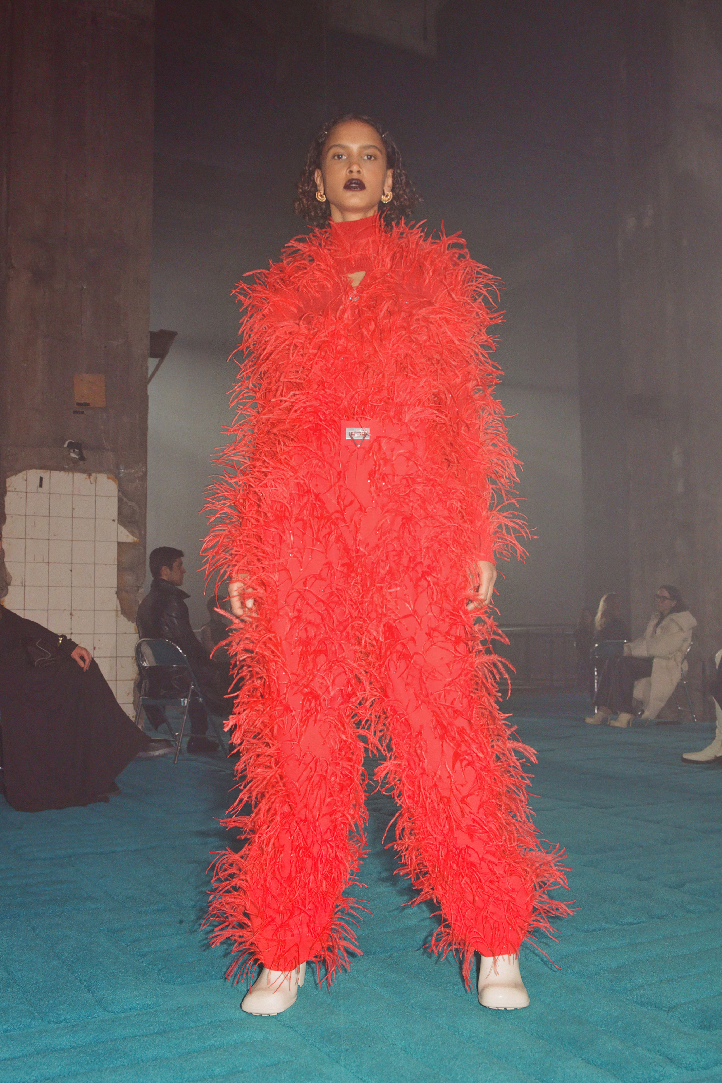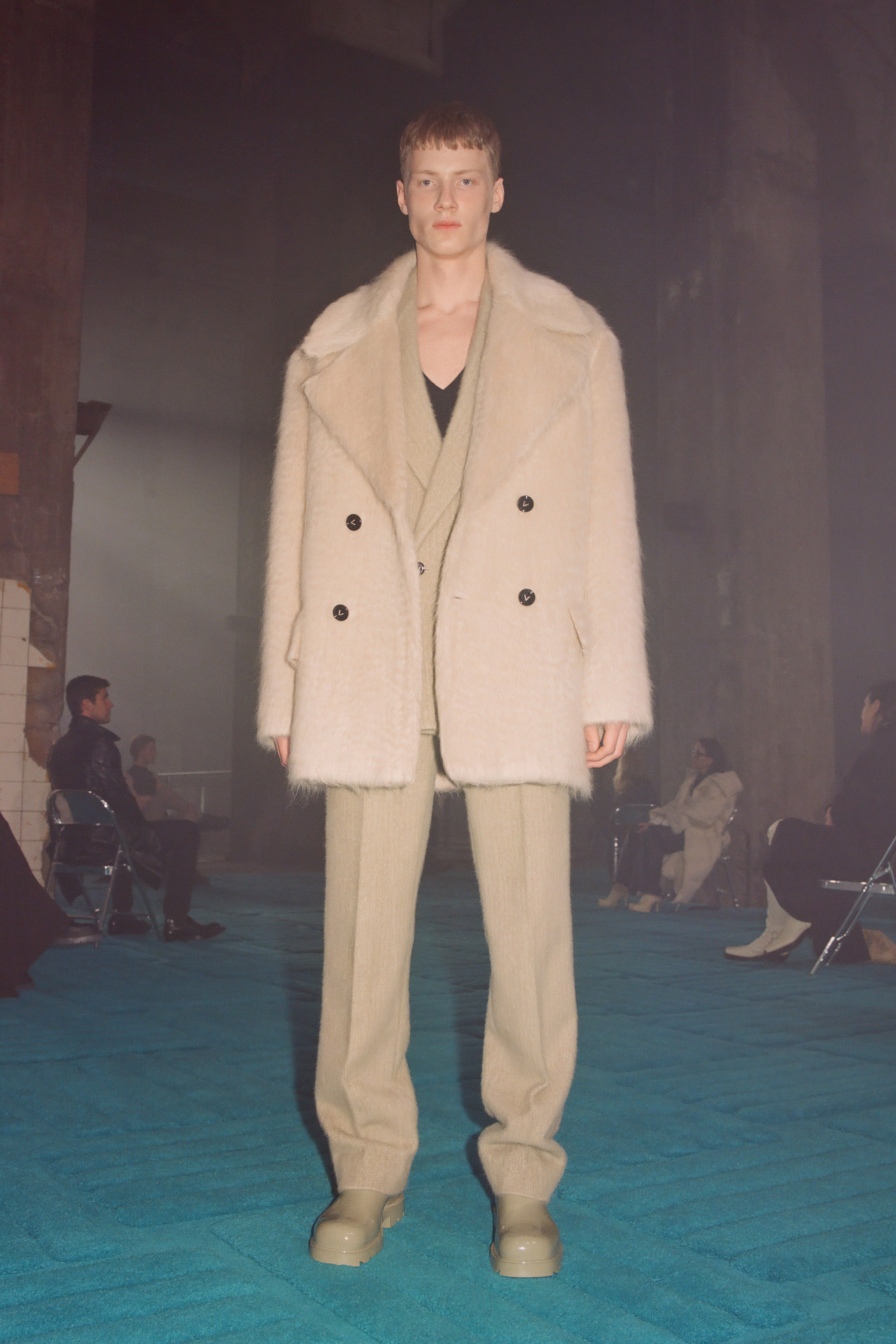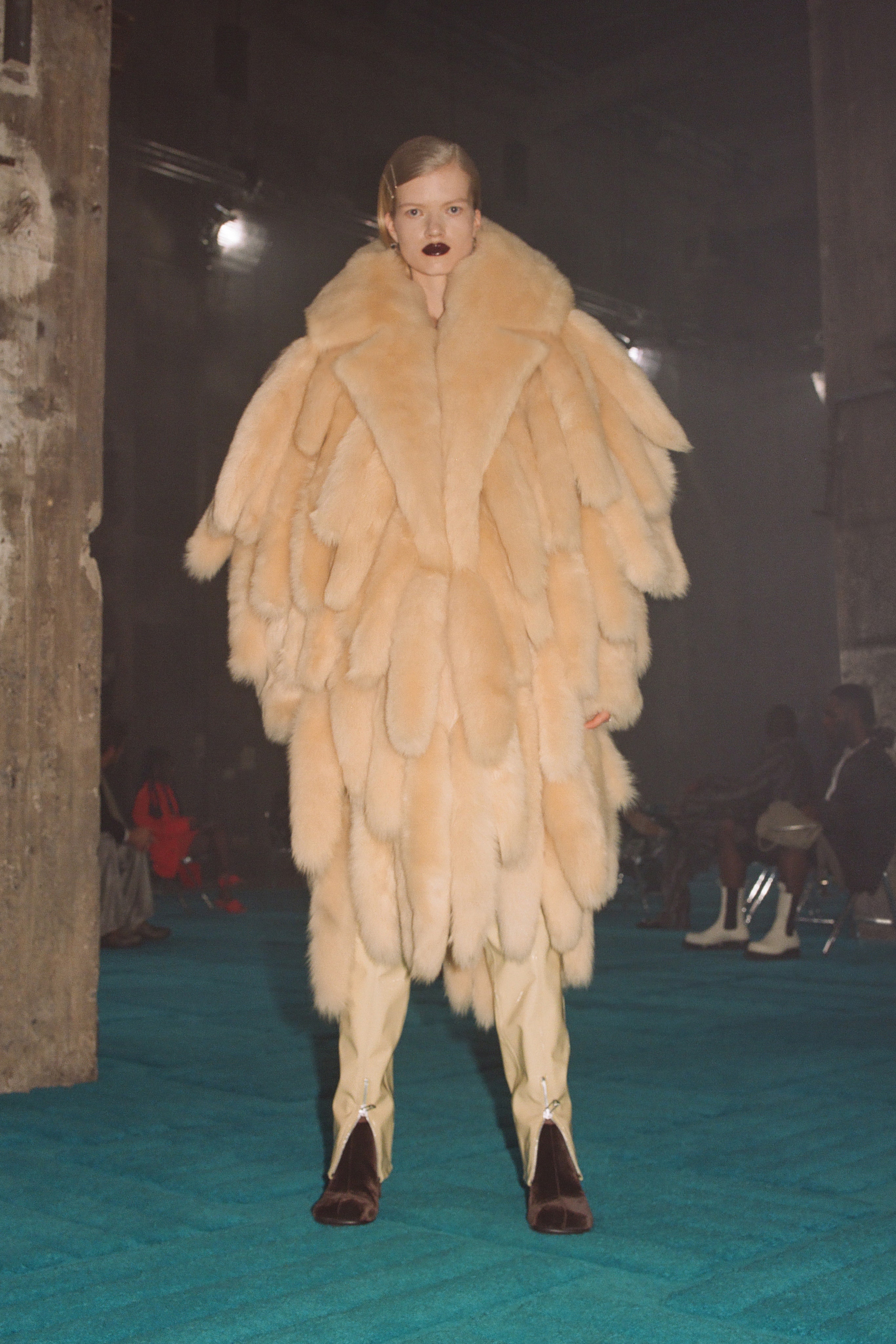 В осенне-зимнюю коллекцию Bottega Veneta вошли шубы из искусственного меха, пальто, костюмы, кожаные тренчи, свитера с объемными рукавами и платья из плотного коттона с перьями, из кашемира со стеклярусом и кожи. Среди обуви — сапоги-трубы (самые интересные — с принтом зебры!), мюли, лоферы и броги.