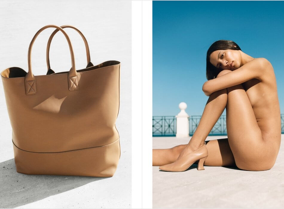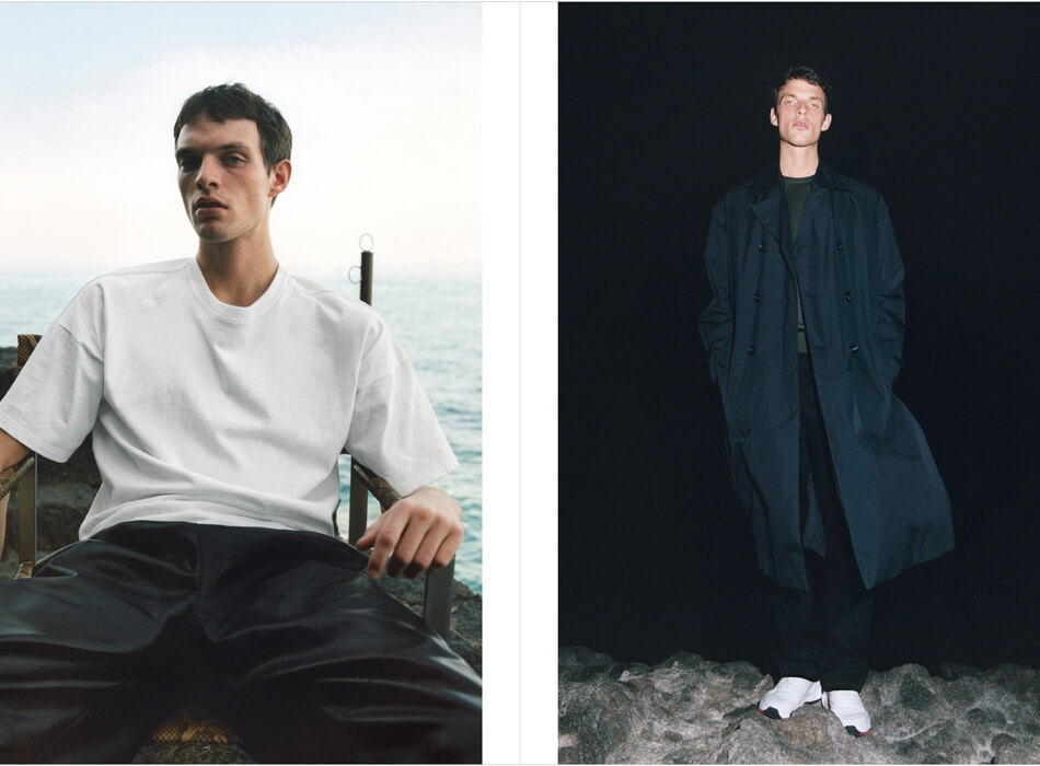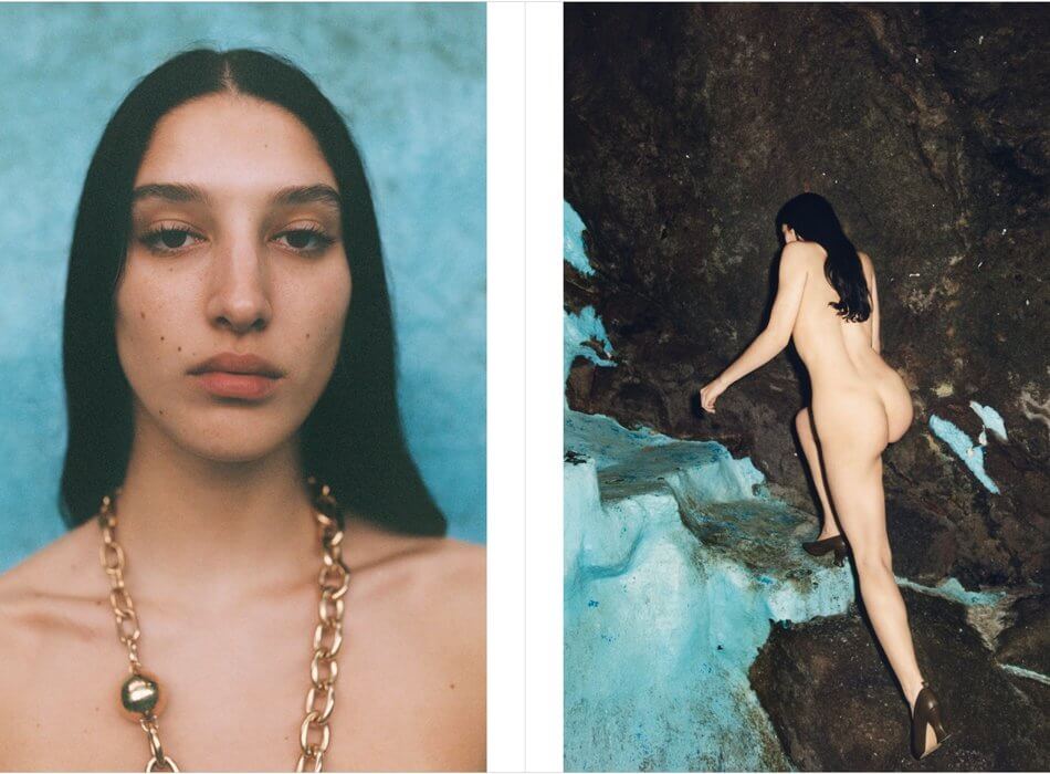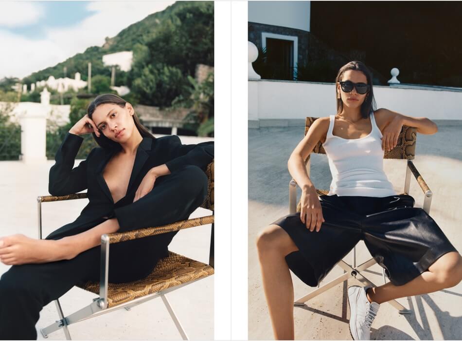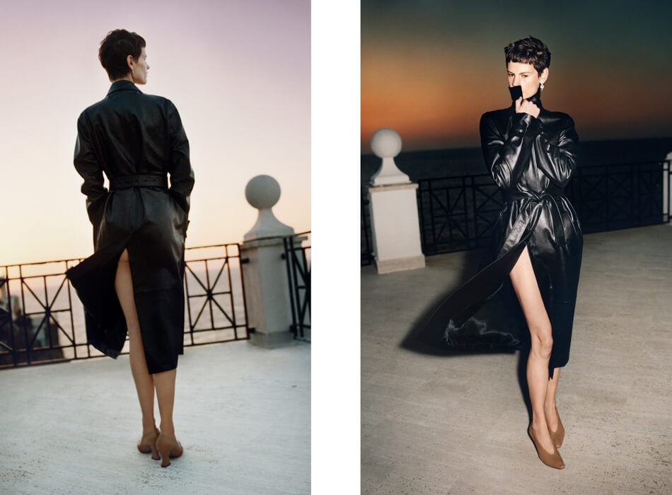 На снимках модели позируют на фоне пейзажей острова Искья. Морская гладь и покрытые зеленью горы контрастируют с минималистичными вещами весенней коллекции — кожаными пальто, костюмами, тренчами, золотыми цепями и аксессуарами, выполненными в специальной технике модного дома – плетении interciatto.