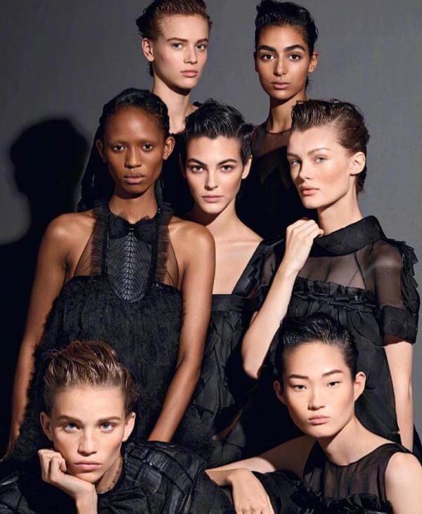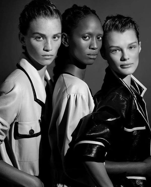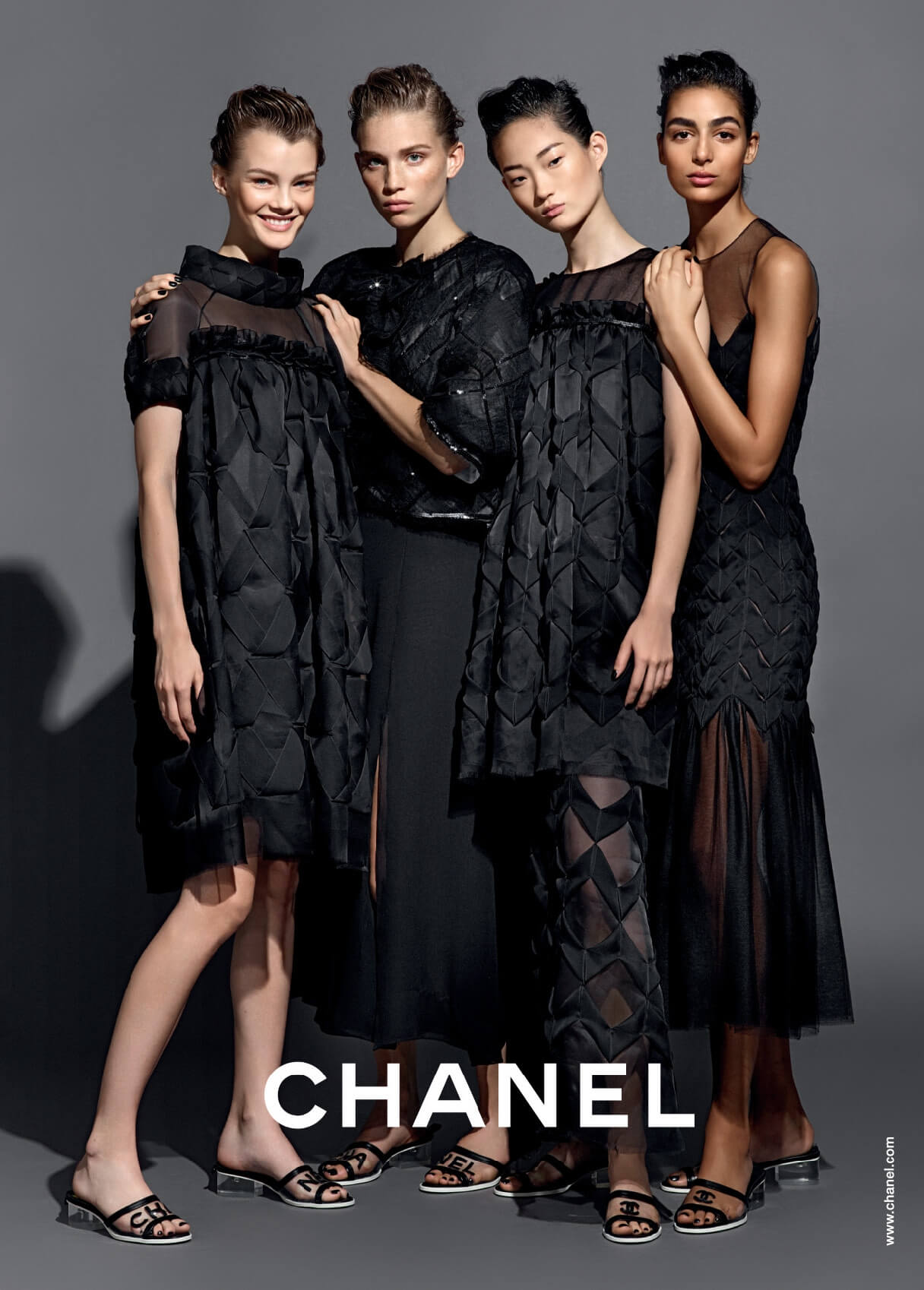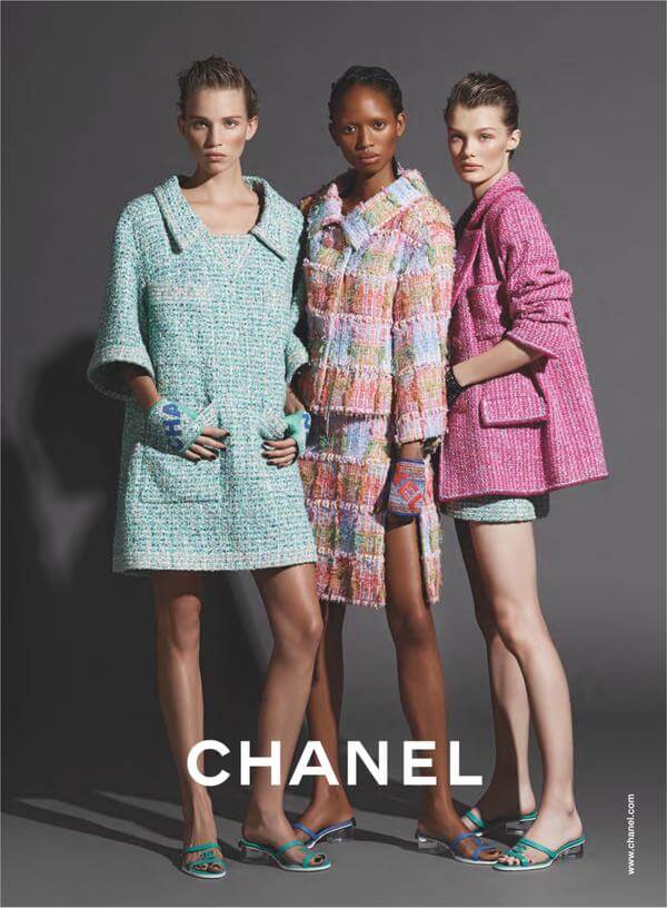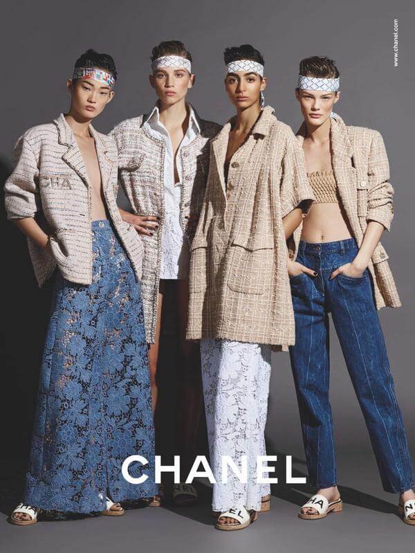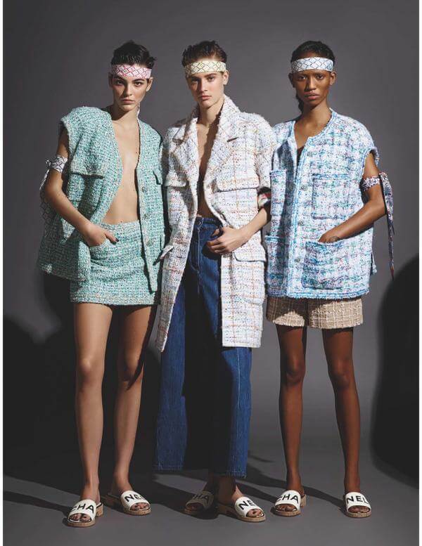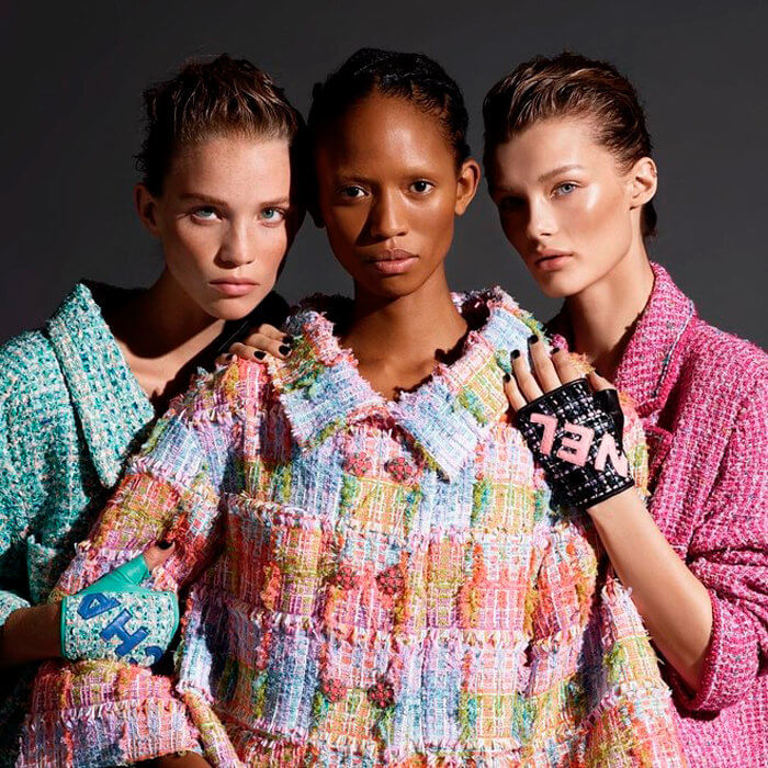 Виттория Черетти, Крис Грикайте, Нора Атталь и другие модели позируют в твидовых костюмах и вещах с двойной эмблемой Chanel из весенней коллекции бренда.