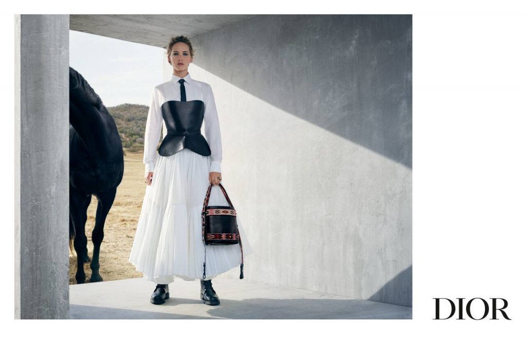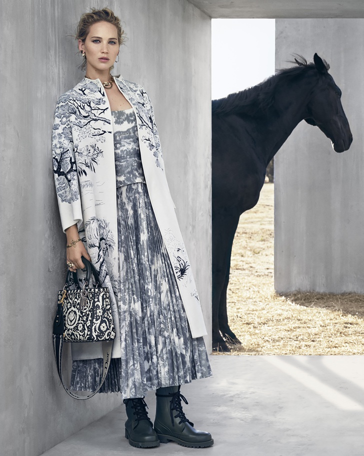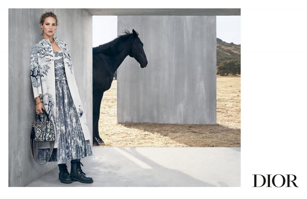 Дженнифер Лоуренс стала лицом кампейна коллекции Christian Dior Resort 2019 (напомним также, что актриса является амбассадором бренда). Круизную коллекцию креативный директор бренда Мария Грация Кьюри посвятила наездницам, представив кожаные корсеты и сапоги для верховой езды, а также украсив некоторые пальто и юбки изображениями диких животных. Кампейн с бетонными стенами посреди пустыни сняла нидерландский фотограф Вивиан Сассен. Компанию Лоуренс в кадре составила лошадь цвета воронова крыла.