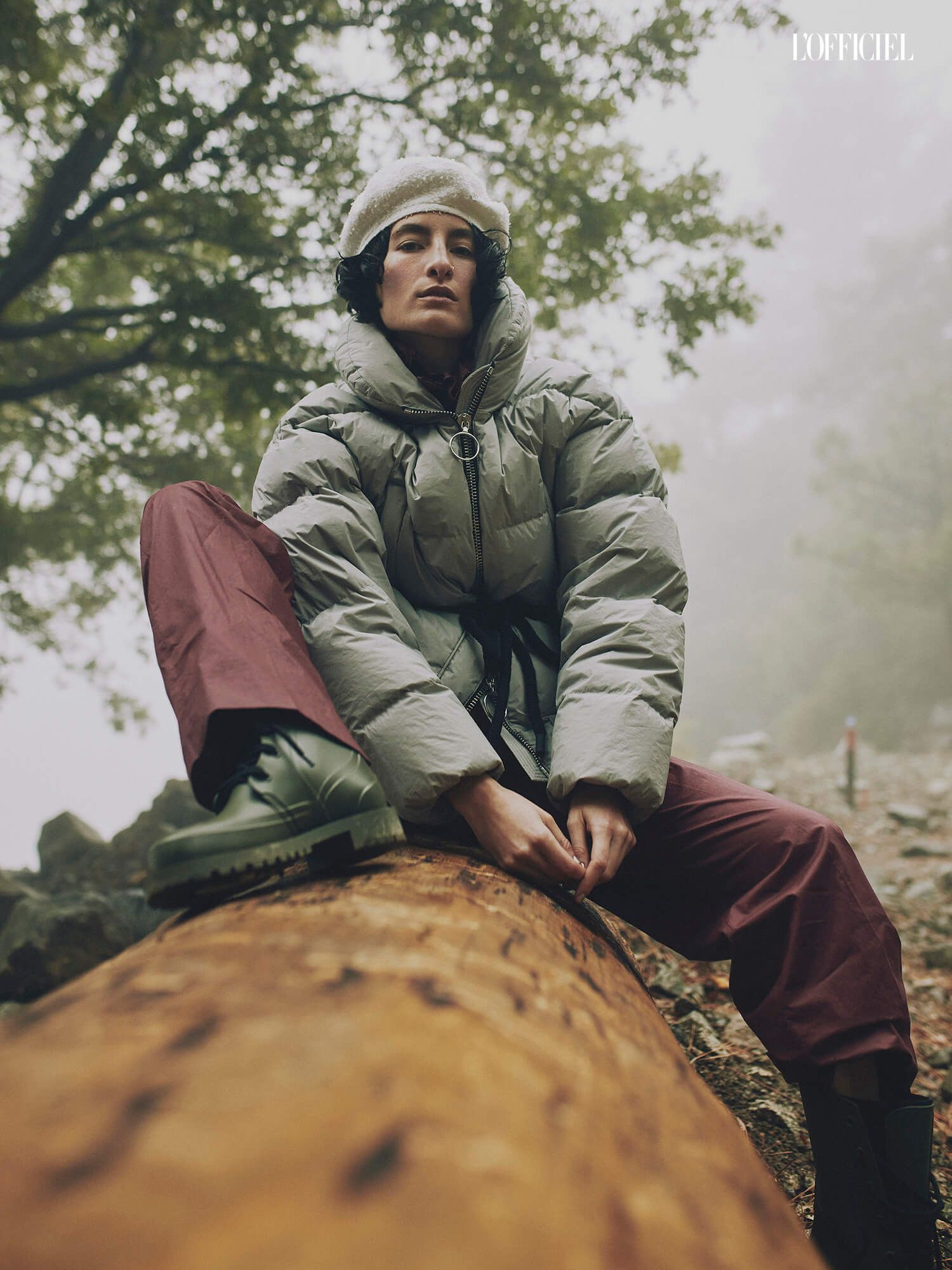 Пуховик Ienki Ienki, брюки Salvatore Ferragamo, ботинки Christian Dior, берет Chanel