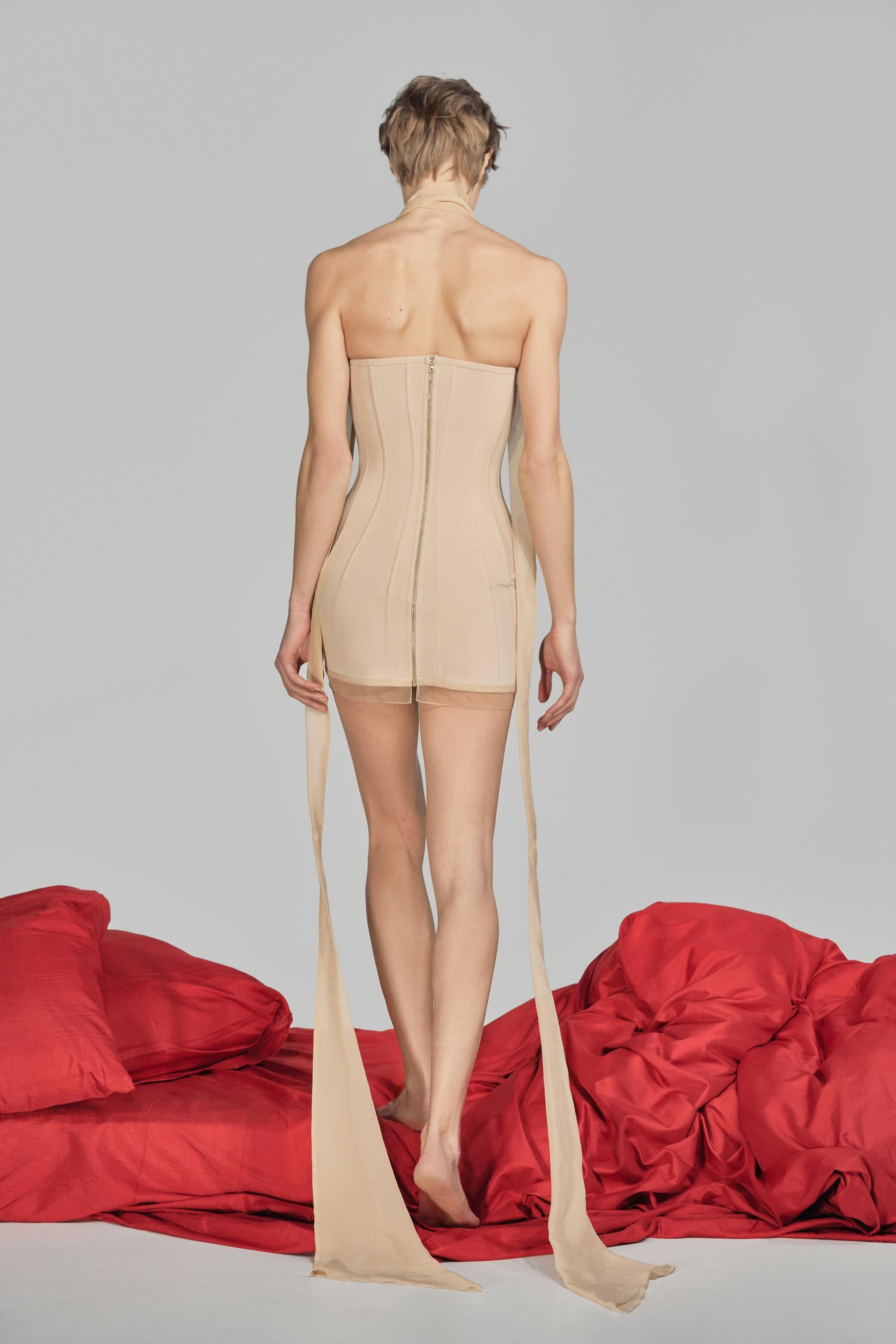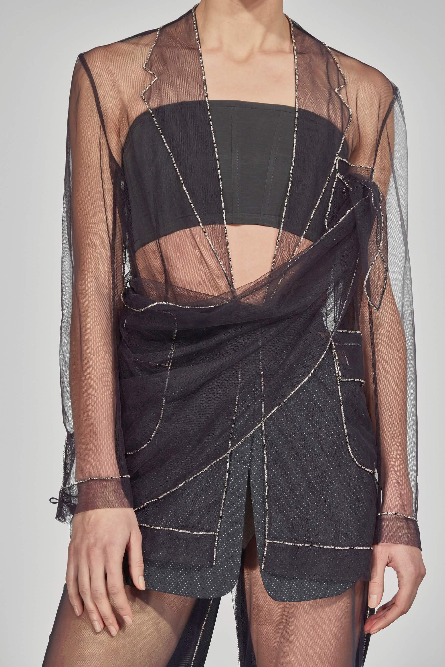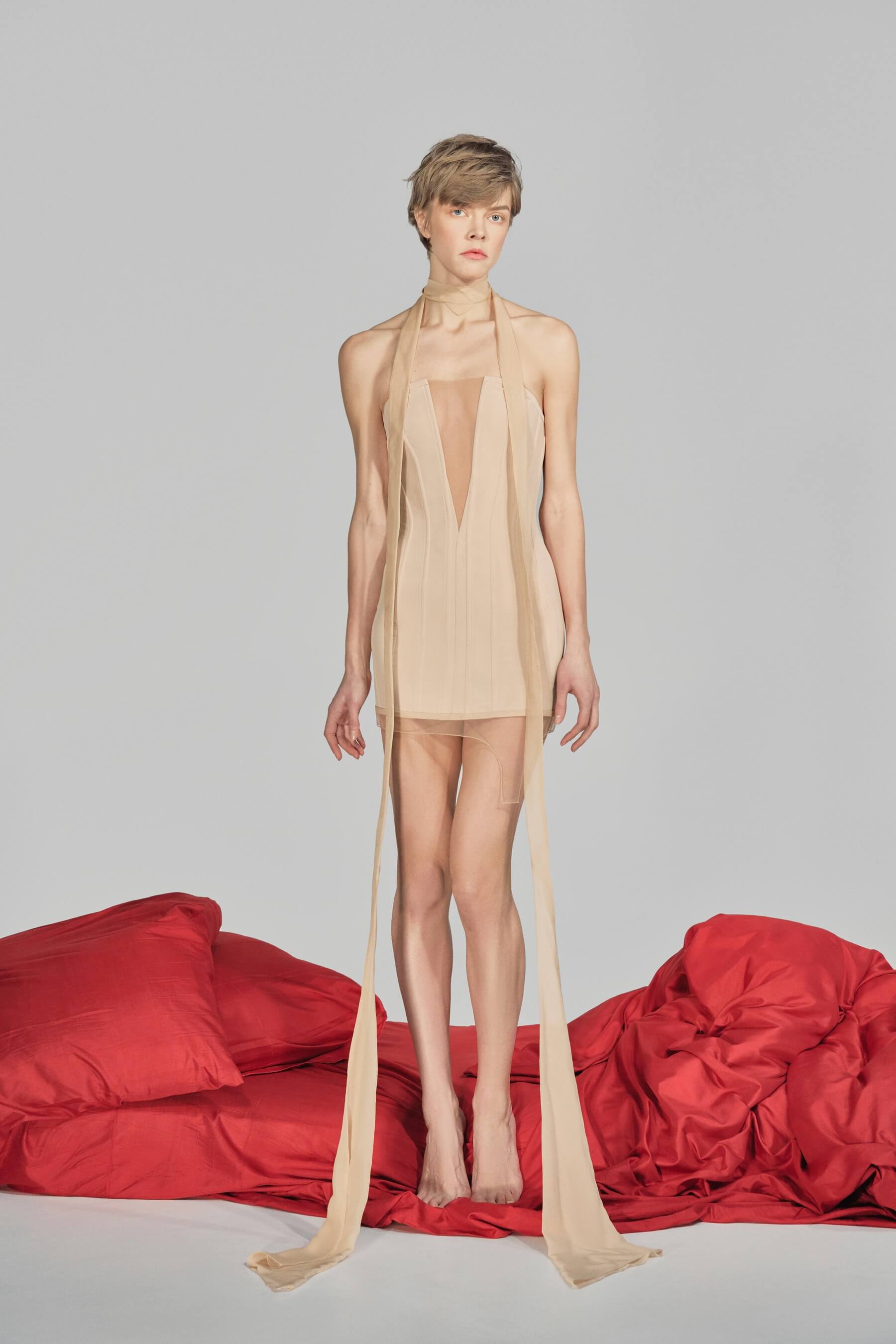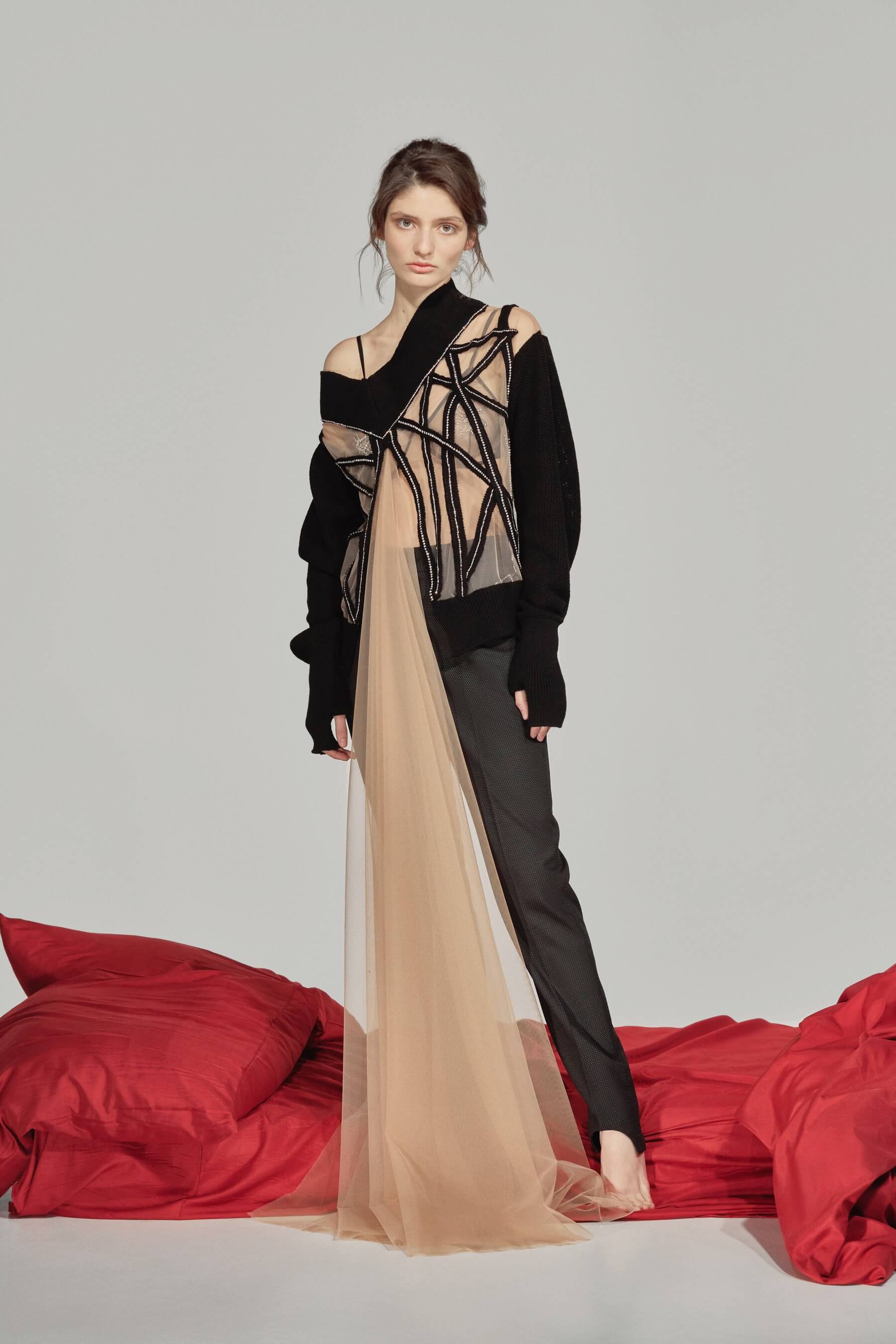 Коллекция Ивана Фролова включает чувственные платья и юбки из фатина, свободные смокинги, корсеты с вышивкой кристаллами – вещи, в определенной степени являющиеся продолжением весенней коллекции и всё-таки – новые: красно-черную гамму дополнили солнечно-желтый и цветочно-розовый оттенки, в конструкциях появились новые детали, а силуэты приобрели сложную простоту и лёгкость.