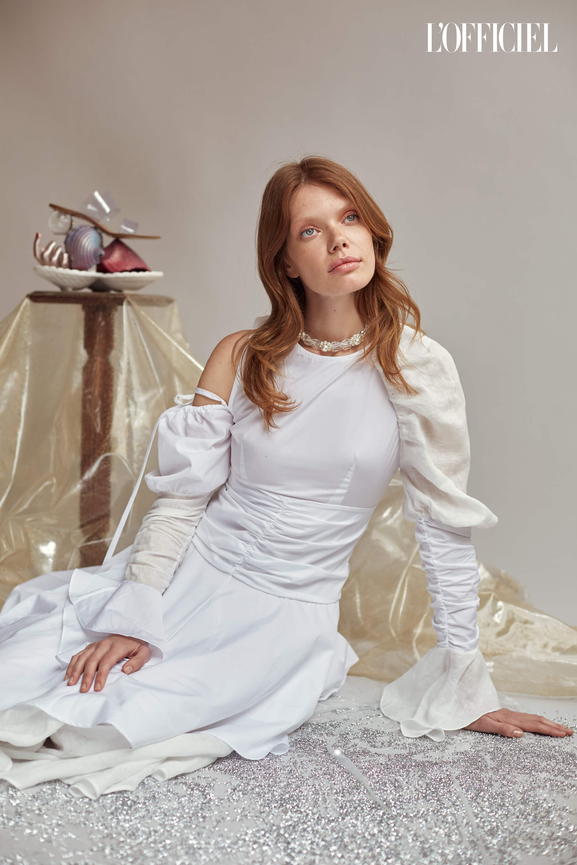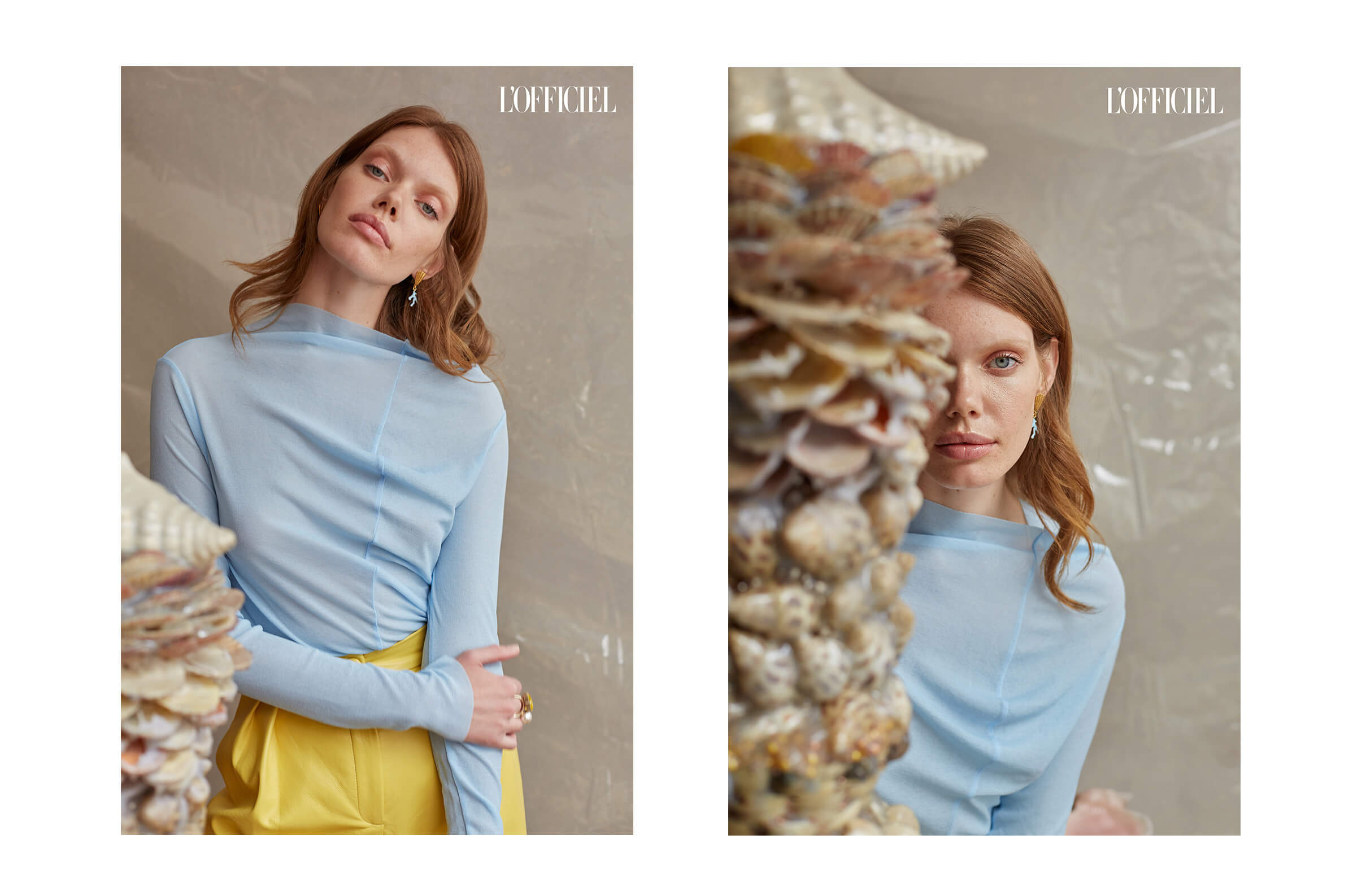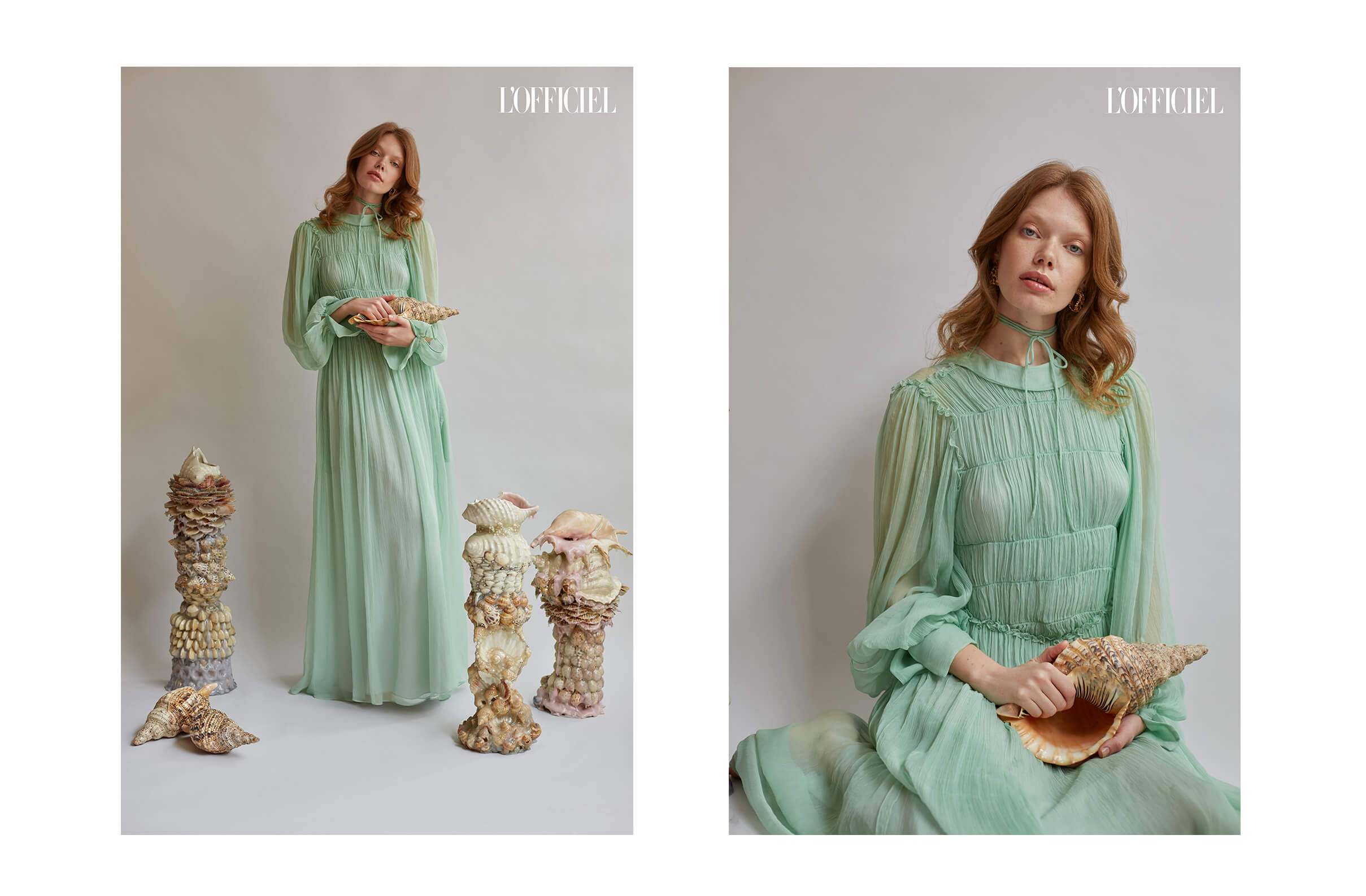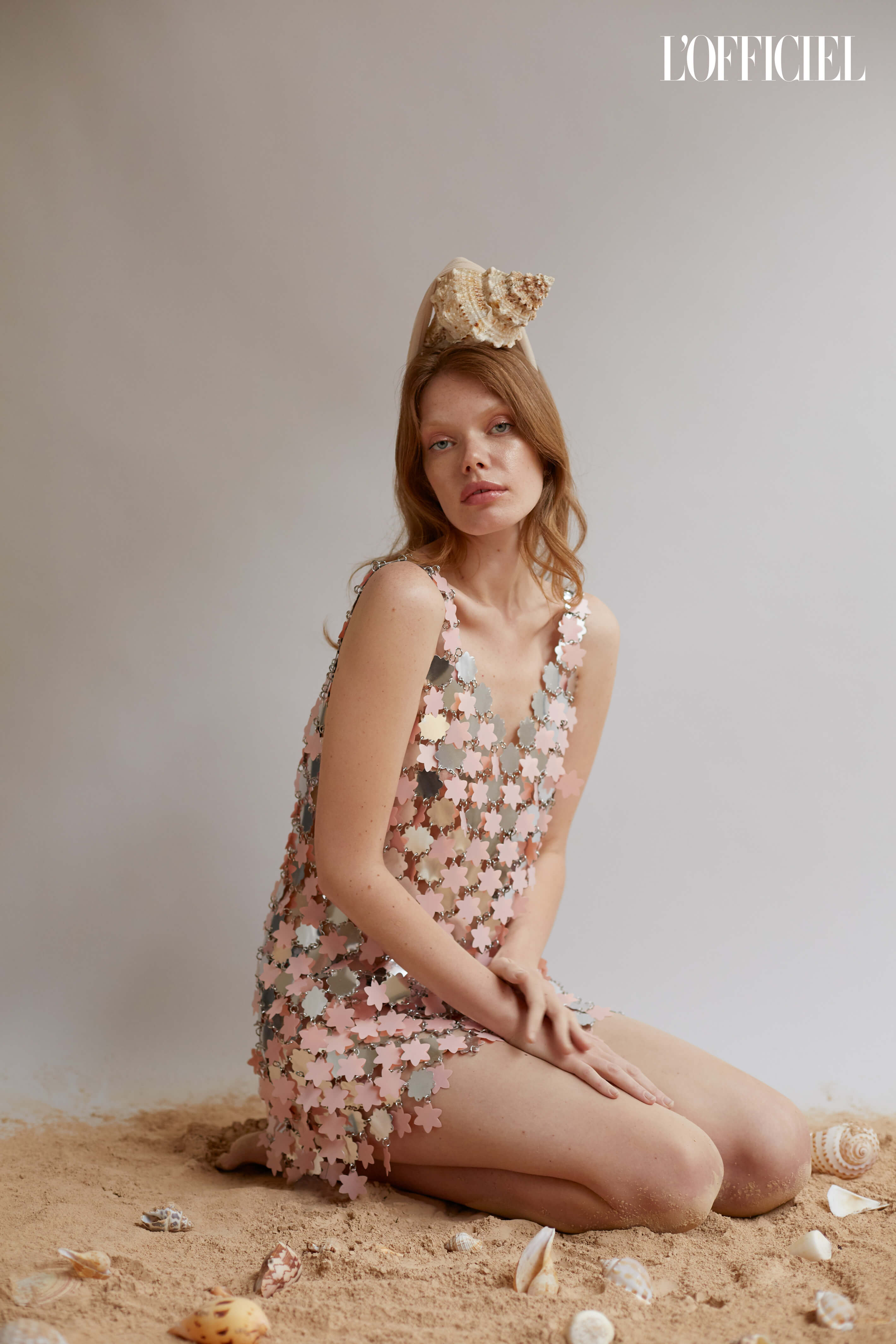 Струящиеся драпировки шёлка, головные уборы в пайетках, напоминающих условную фактуру прибрежной морской гальки, и платье-кольчуга, сотканное из звёзд, в которых так ярко могут отзываться бликами морские волны на солнце... Каждый кадр съёмки посвящен любви к морю и свободе.
