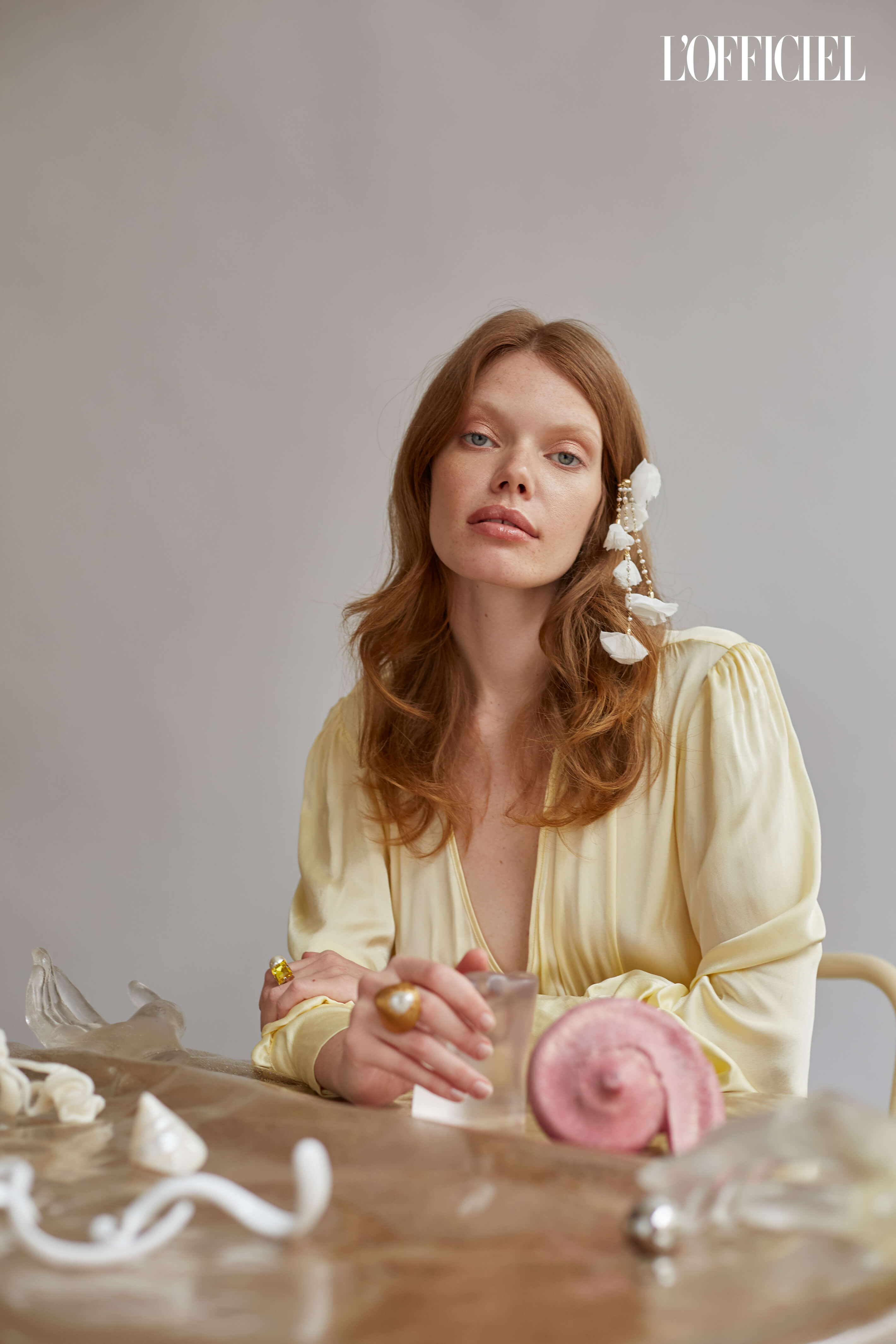 Блуза Alexa Chung, украшение Rosantica, кольцо Dries Van Noten, кольцо Oscar de la Renta