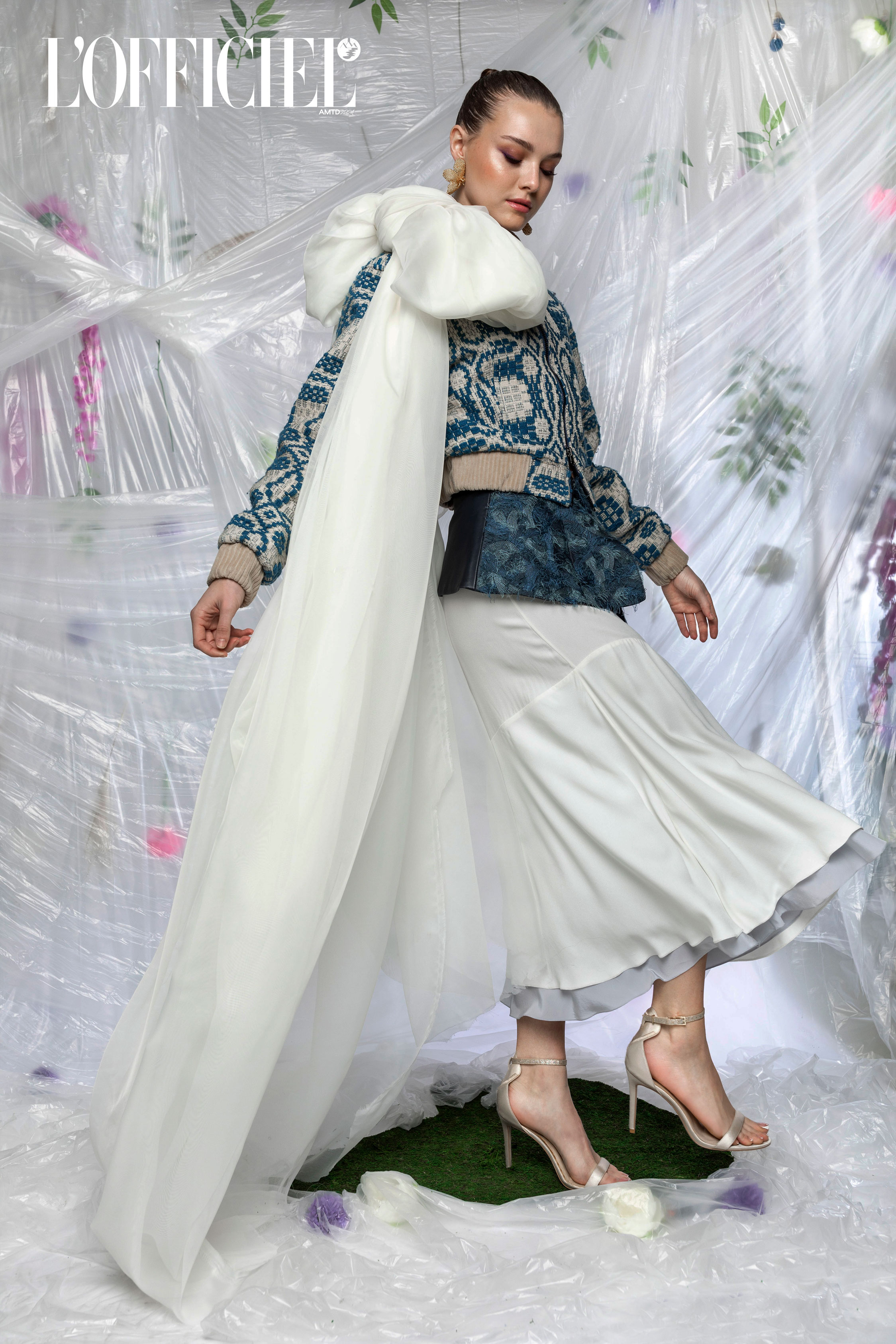 Jacket: KIMORA @kimora.me. Skirt: LIINA STEIN @liinasteinofficial. Bow: ARC AND BOW @arcandbow. Earrings and Necklace: RAYNA VENTURES @goldenfiberbyrayna @raynaboutique