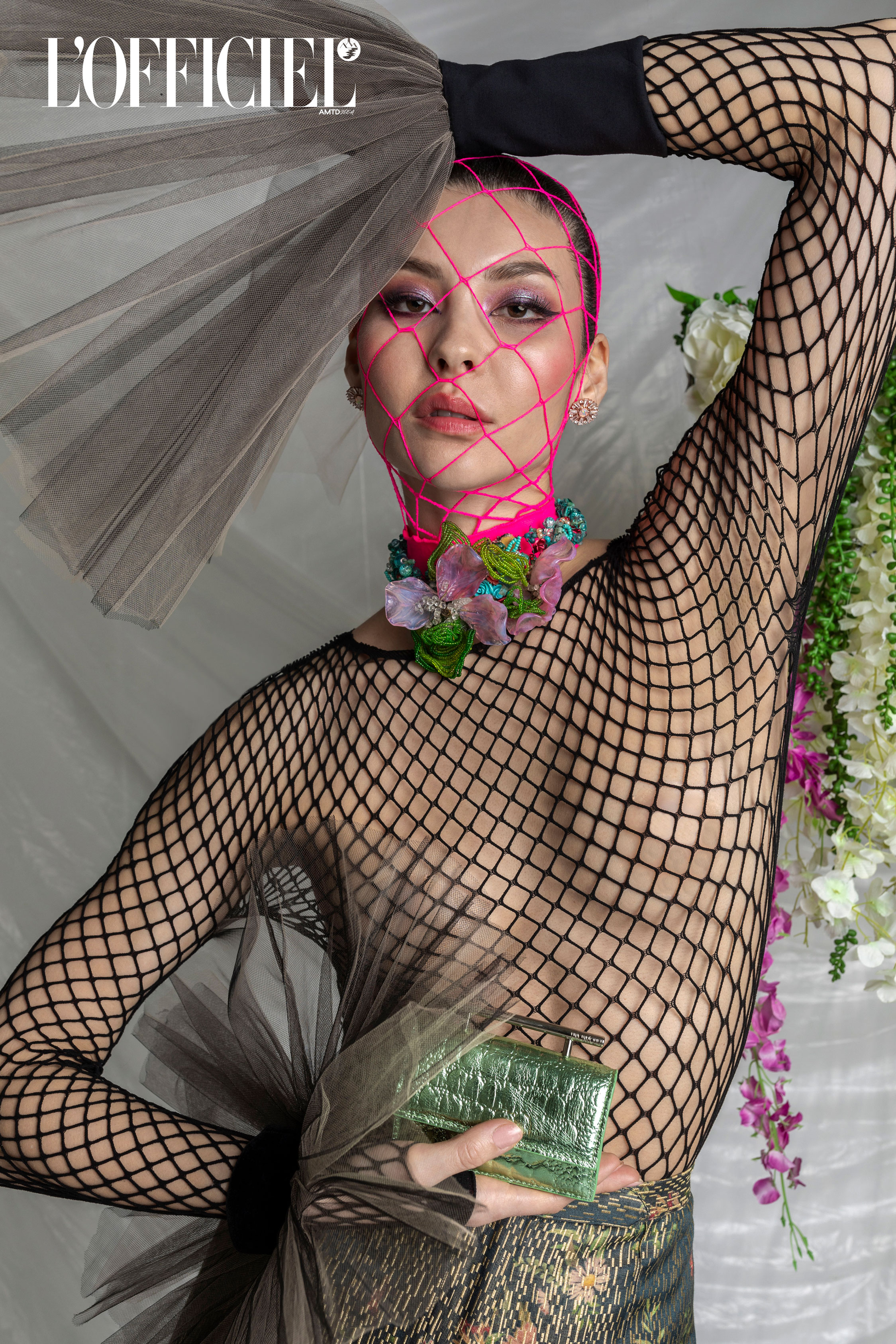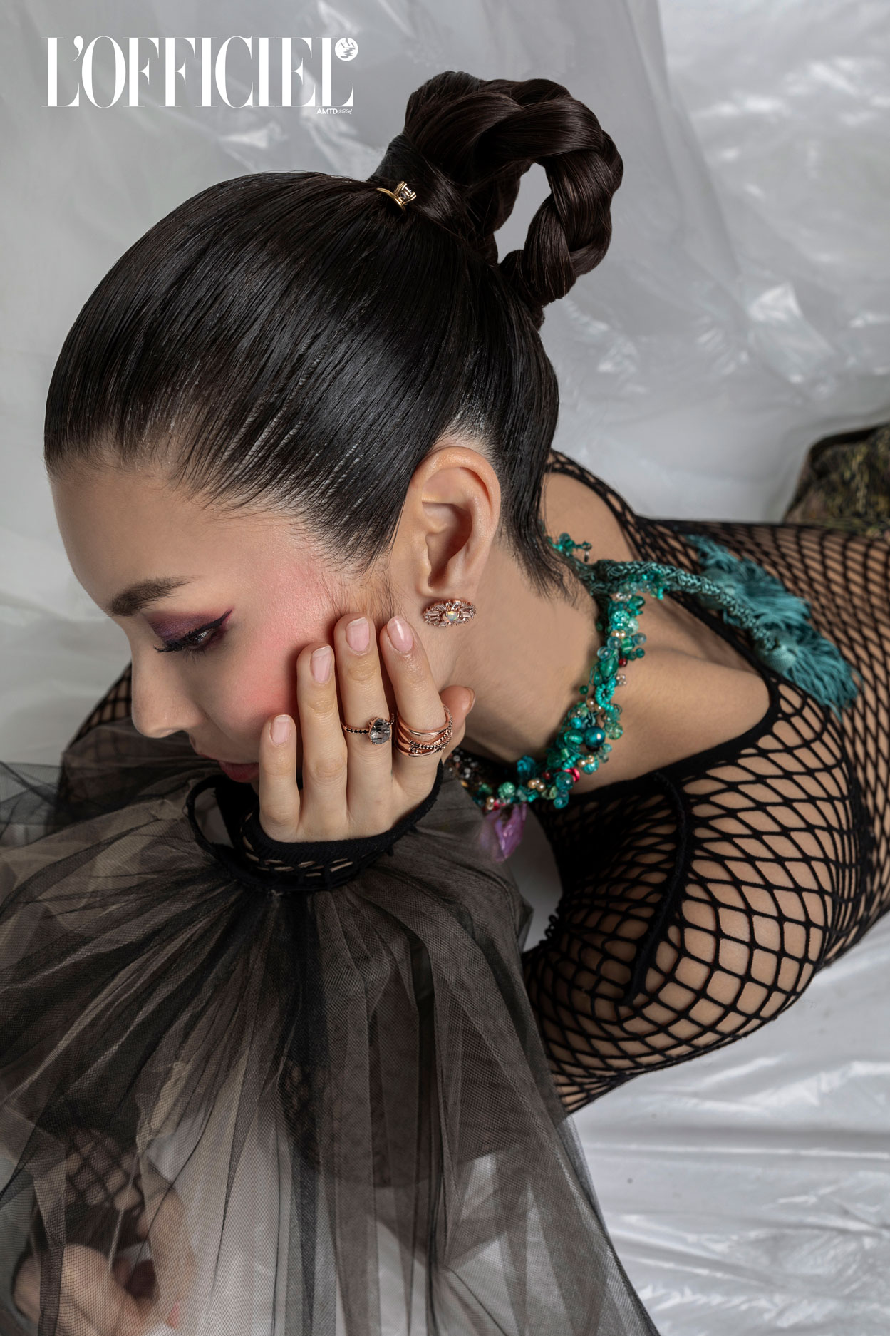 Mesh top and cuffs: MONZLAPUR @monzlapur.ny. Earrings: BISOULOVELY @bisoulovely. Necklace: PK BIJOUX @PKBC1. Hairpin: FIONA FRANCHIMON NO 1 HAIRPIN @fionafranchimon_official. Rings: NATALIA BOJALIL JEWELRY @nataliabojaliljewelry