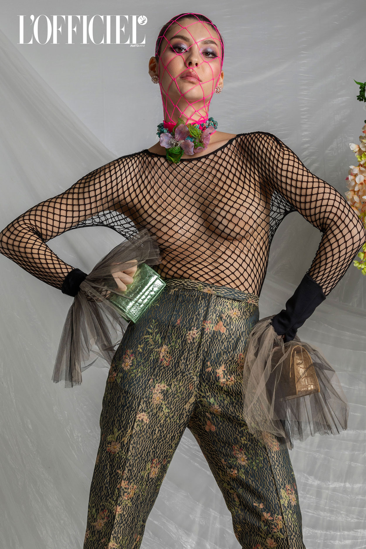 Mesh top and cuffs: MONZLAPUR @monzlapur.ny. Pants: NOVEMBER NOON @november_noon. Earrings: BISOULOVELY @bisoulovely. Necklace: PK BIJOUX @PKBC1. Bag: LINA ENRIQUEZ @linaenriquezluxe
