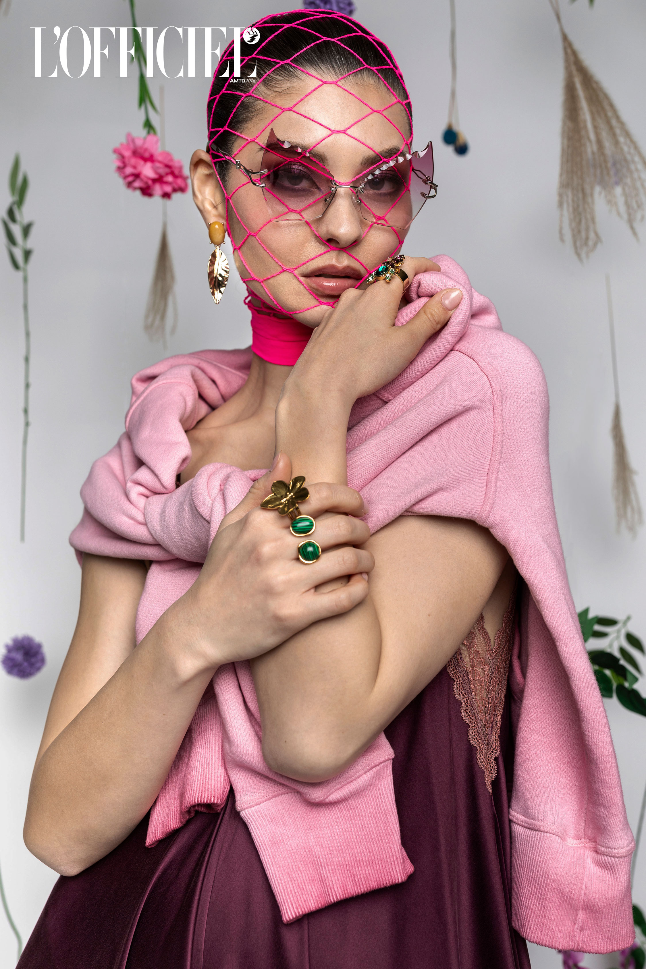 Hoodie: HOLE ACADEMIE @holeacademie. Dress: 7 SLOW FASHION @7slowfashion. Sunglasses: SHA'DUCTION EYEWEAR @Shaduction. Earrings: PALMILLA LOVE @PalmillaLove. Flower and green stones rings: IDENTITY BOUTIK @identityboutik. Multicolor ring: RODRIGO OTAZU @rodrigootazu
