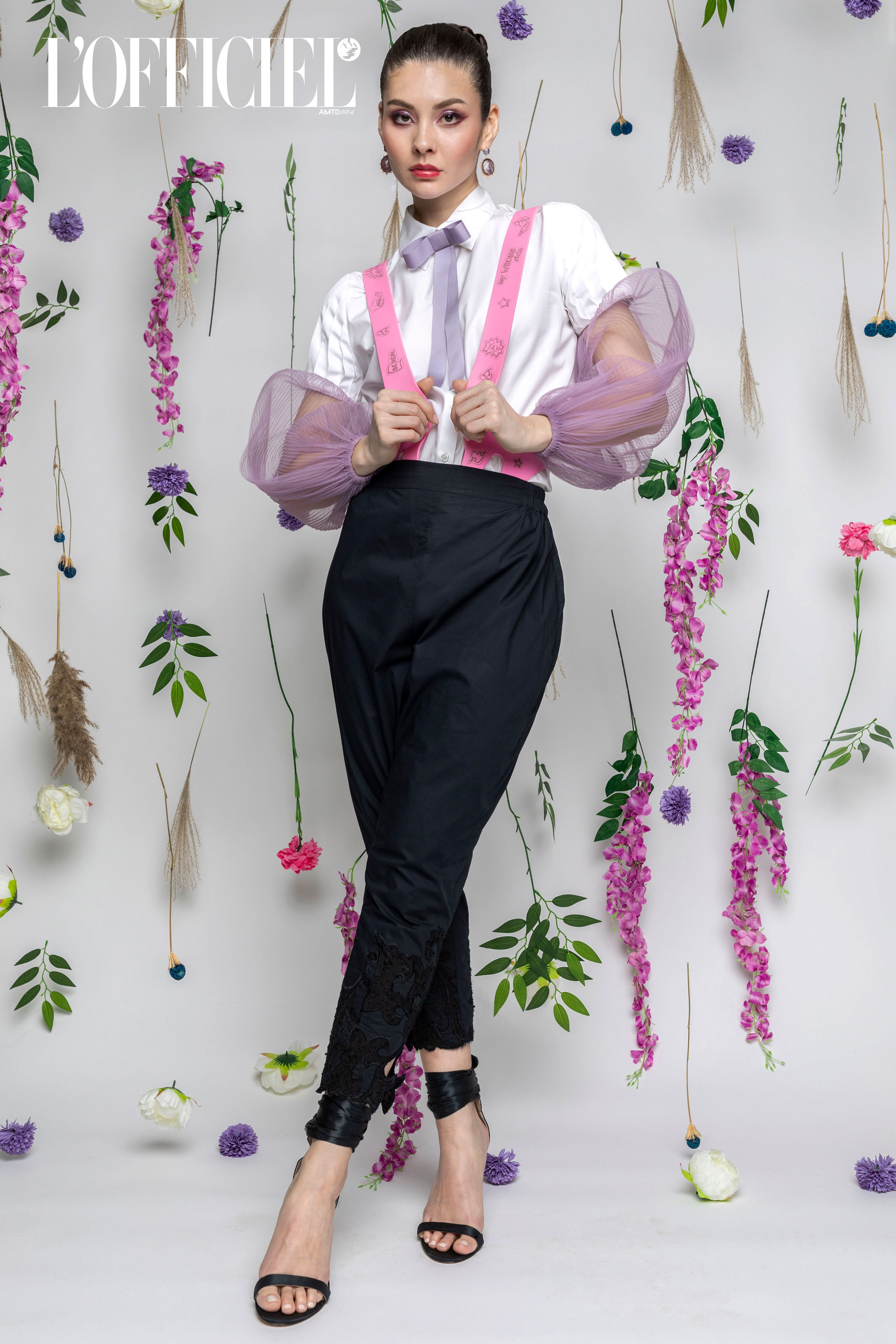 Shirt: FRANCINI_K @francini_k. Silicone bodysuit: MYOB @myobfashion. Pants: ERUM JAMAL @erumjamalofficial. Shoes: VEERAH @veerahofficial. Earrings: AAMO @aamo_nepal. Bow: ARC AND BOW @arcandbow