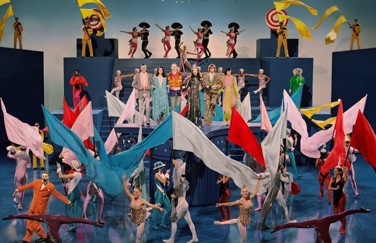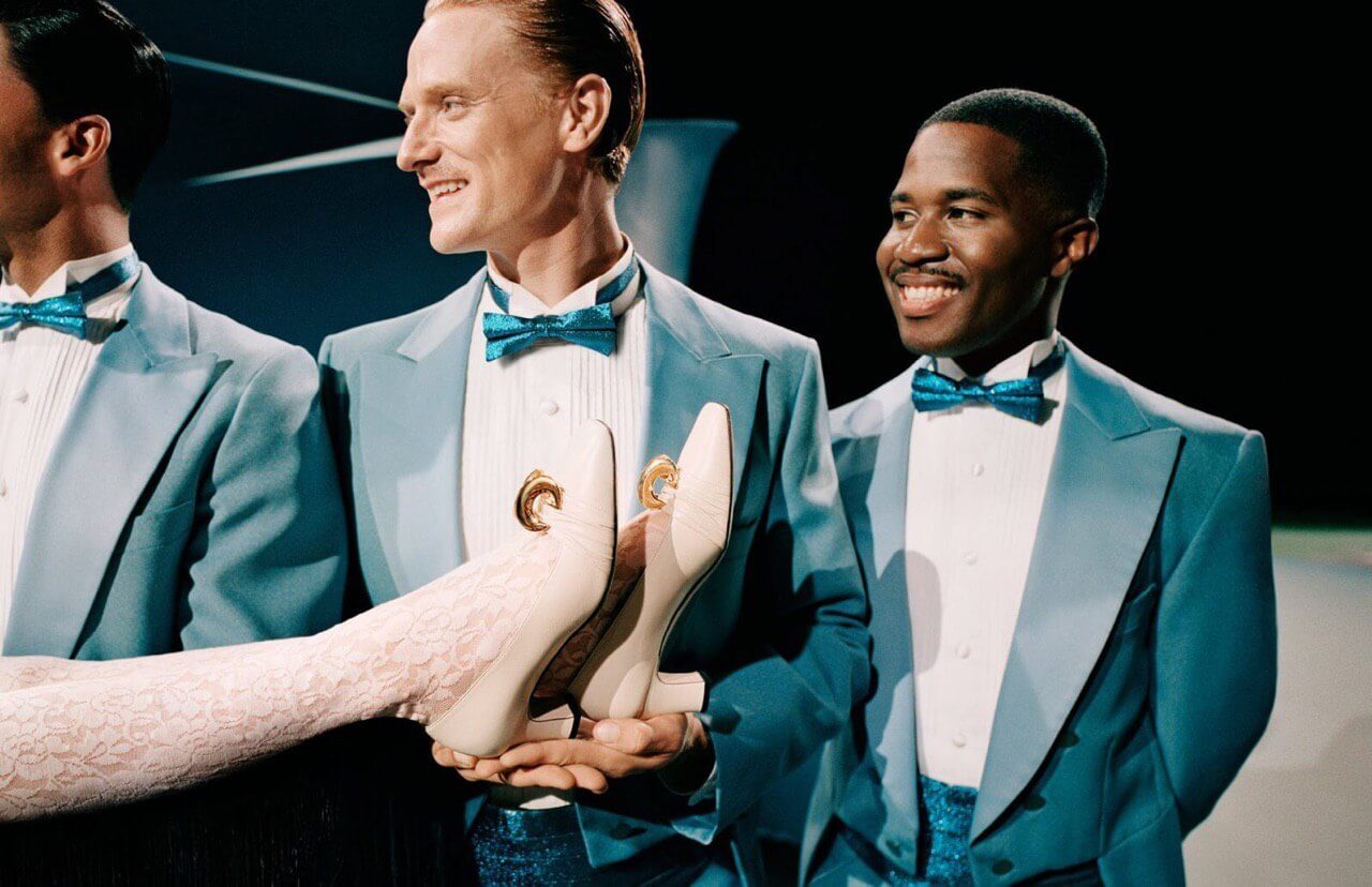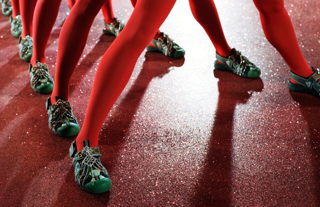 Из театра Gucci позаимствовали декорации с большими лестницами и исполнителей, каждый из которых показывает на сцене свой талант — от художественной гимнастики до отбивания чечетки.