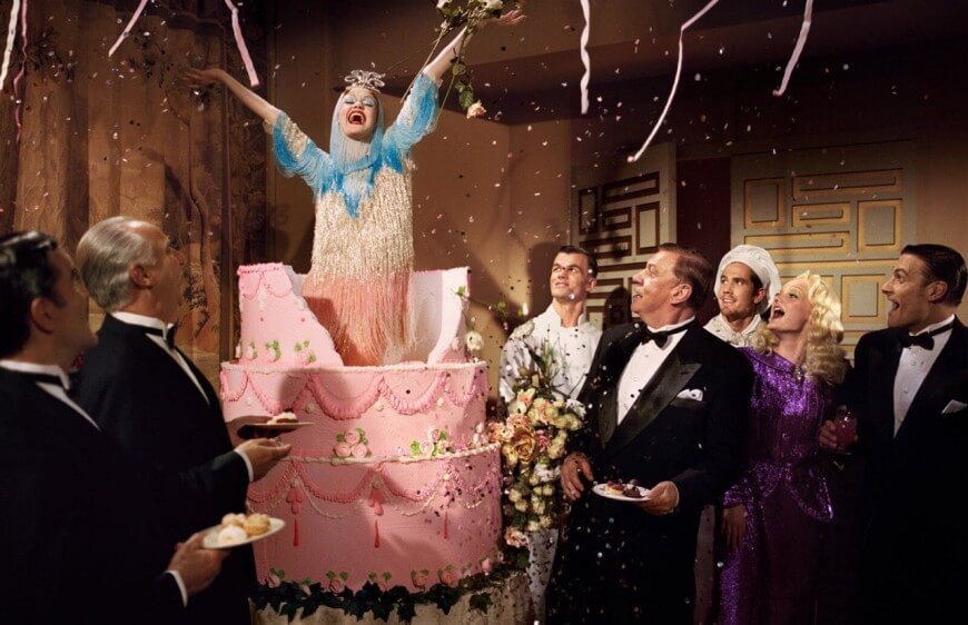 Клетчатые костюмы и яркие платья с блестками органично вписываются в театральные декорации, яркие шубы и кроссовки с отделкой камнями появляются в узнаваемых “кадрах” ретрофильмов. Для большей реалистичности итальянский дом снял короткие интервью на красной дорожке с моделями, имитируя традиции старого кино.