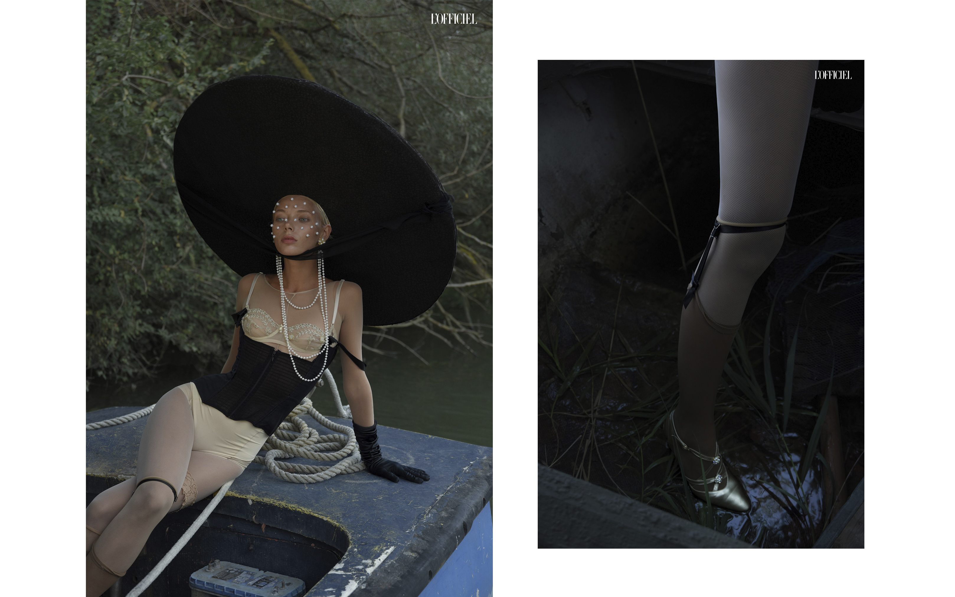 Справа: Корсет Dior, платье Chromosome6, колготы Celine, обувь Prada, шляпа Chapeaux Claque by Hutter Italy