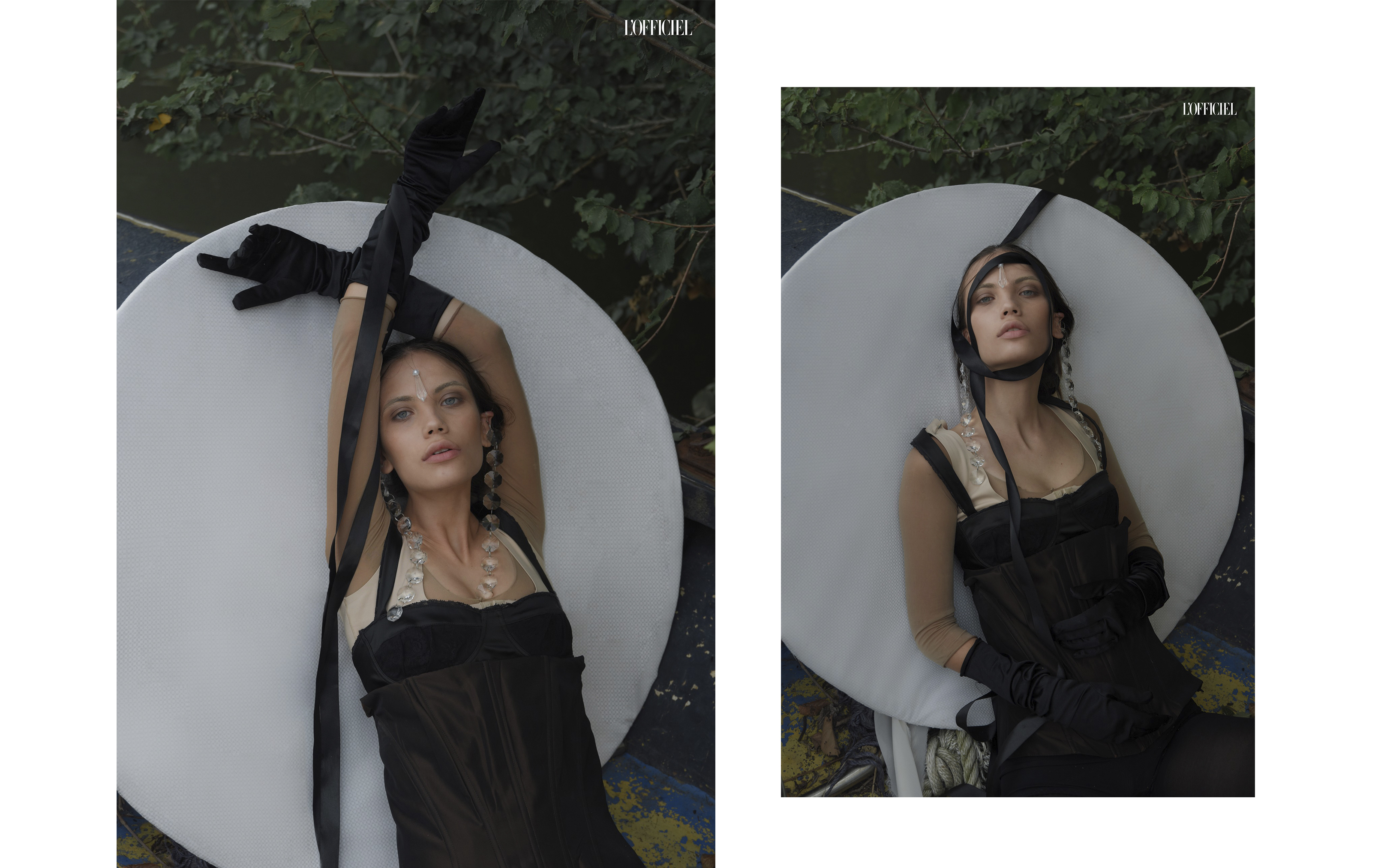 Слева: Белье Pinko, корсет La Perla, перчатки Maison Margela, шорты Alberta Ferretti, колготы Falke, обувь Gianrico Mori, украшения Chromosome6