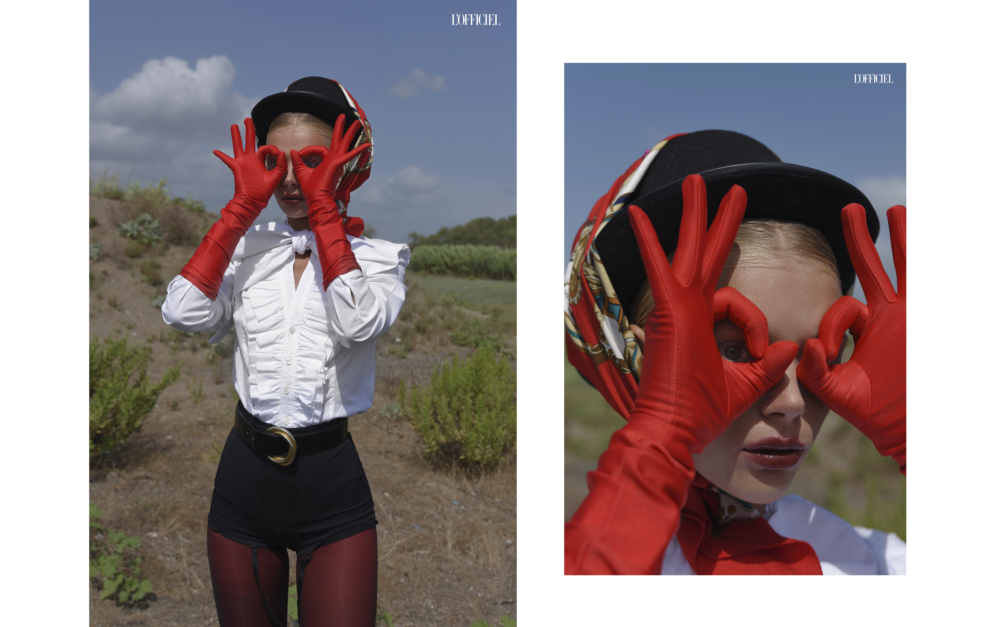 Слева: Шляпа Chapeaux Claque by Hutter Italy, платок Fiorucci, рубашка Chromosome6, украшения Chromosome6, перчатки Manokhi, колготы Celine, боди Dolce & Gabbana