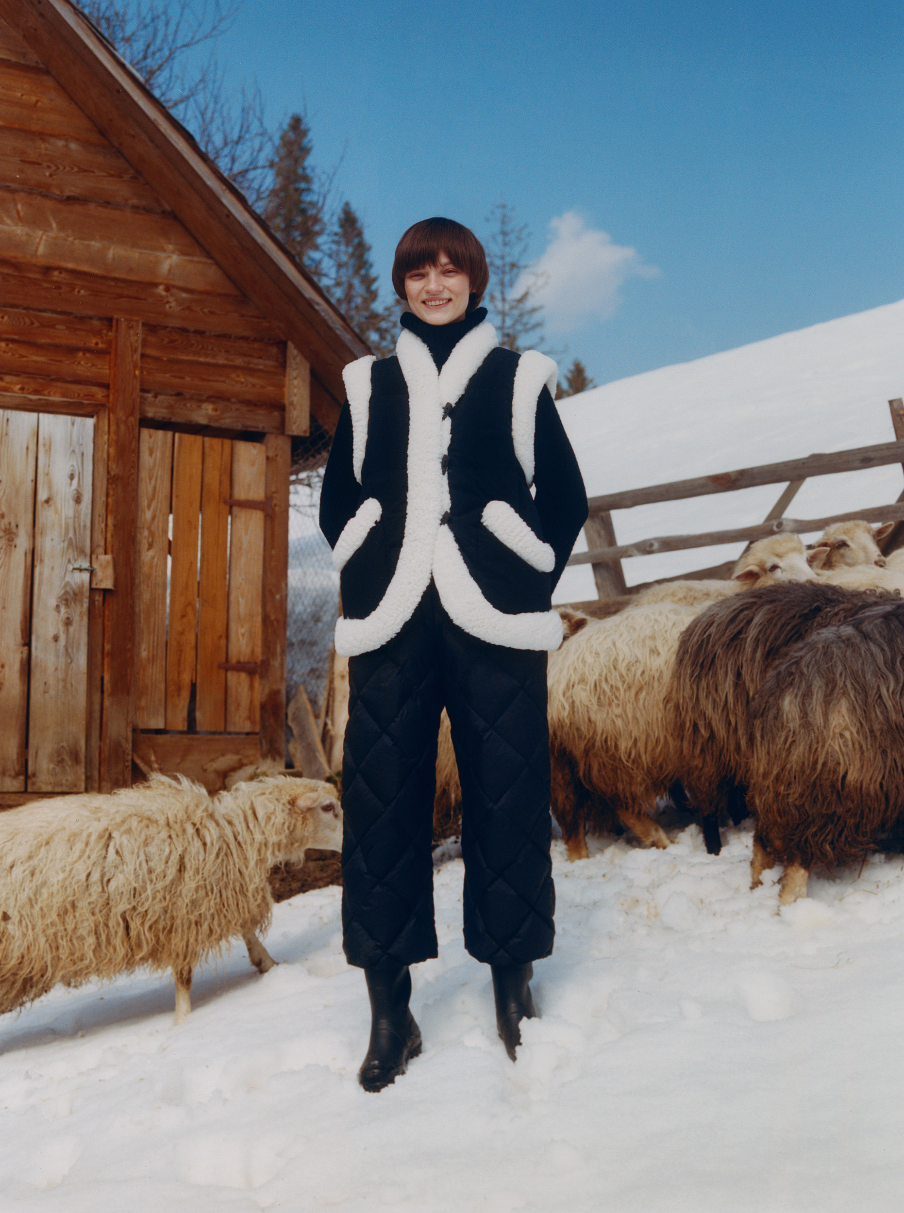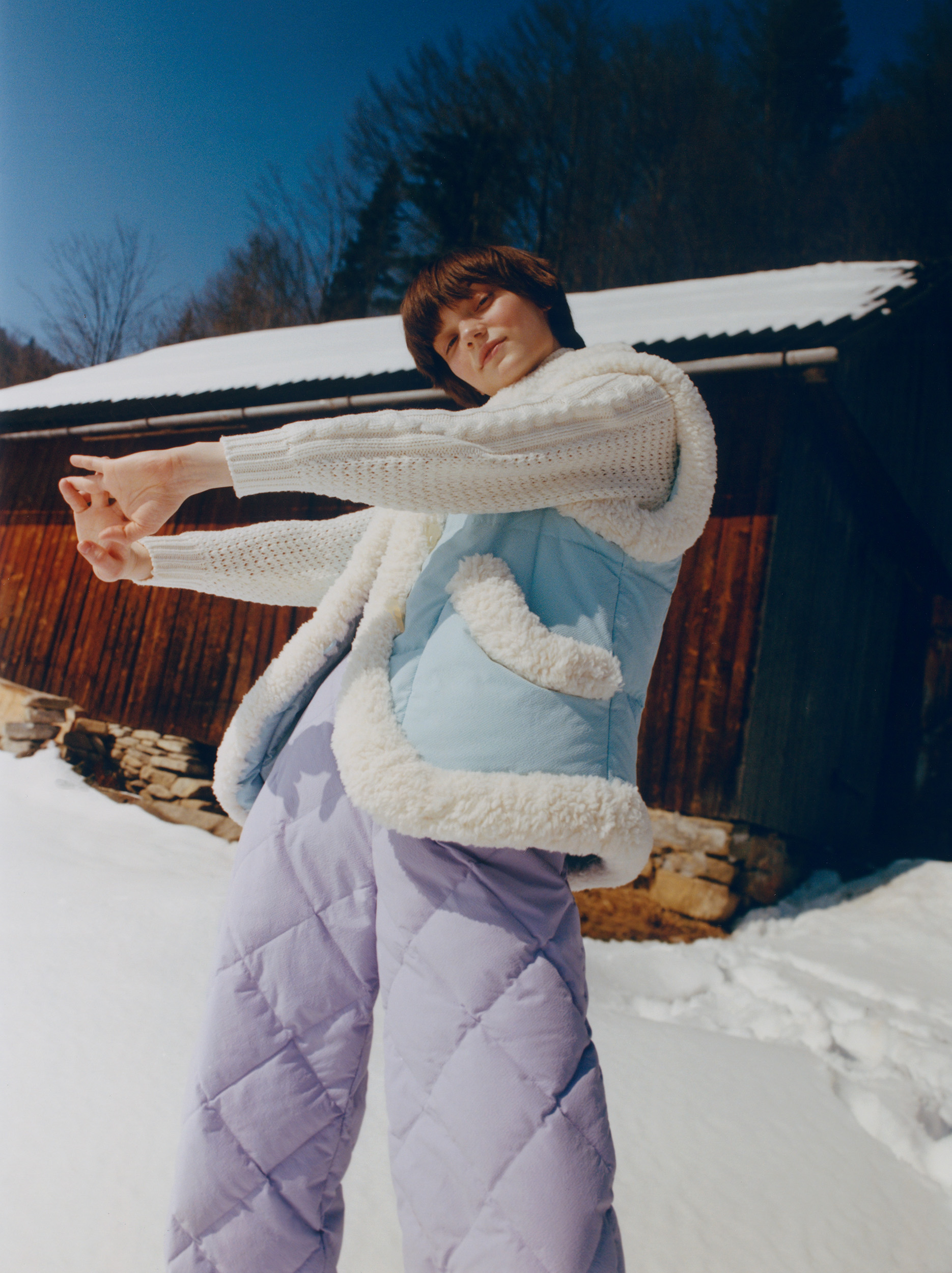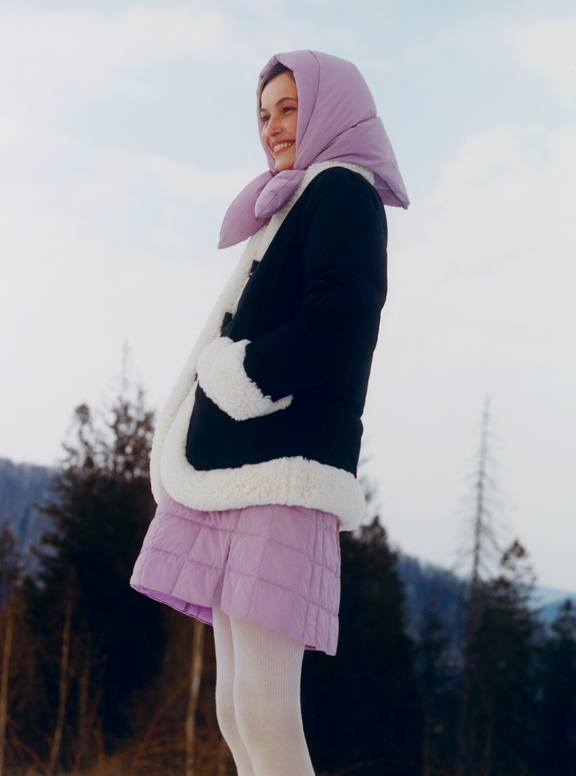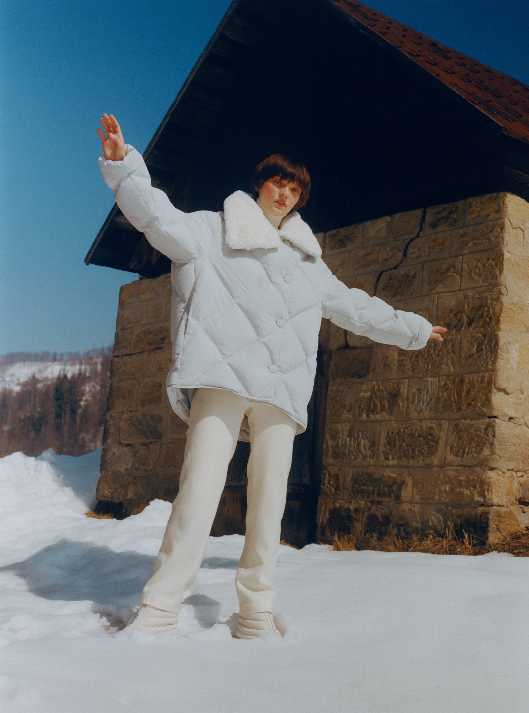 Съемку коллекции провели в Карпатах, и заснеженные склоны гор стали прекрасной обстановкой для того, чтобы показать вещи с ширлингом.