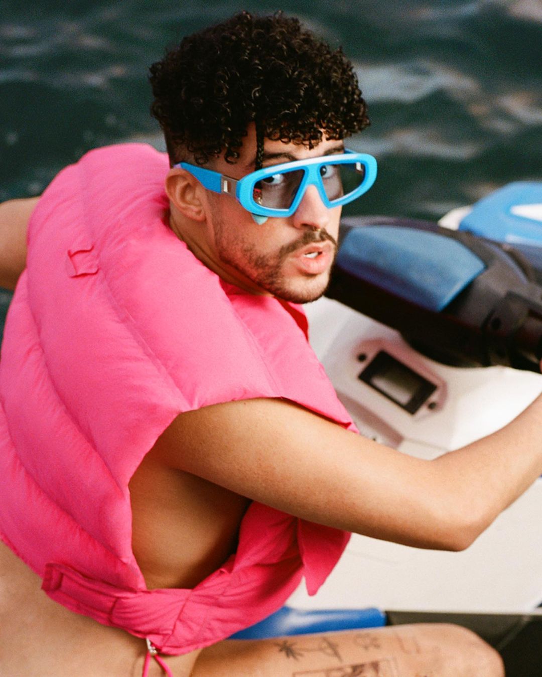 На новых снимках Bad Bunny примеряет ярко-зеленый костюм, поливая себя из шланга возле бассейна, сочетает сумку-багет с серым классическим костюмом, отправляясь в путешествие на мини-велосипеде и даже покоряет гидроцикл в одной жилетке (не спасательной!). На остальных фото рэпер появляется в розовых шортах карго, белой рубашке, черном строгом пиджаке и других вещах из коллекции Le Splash.