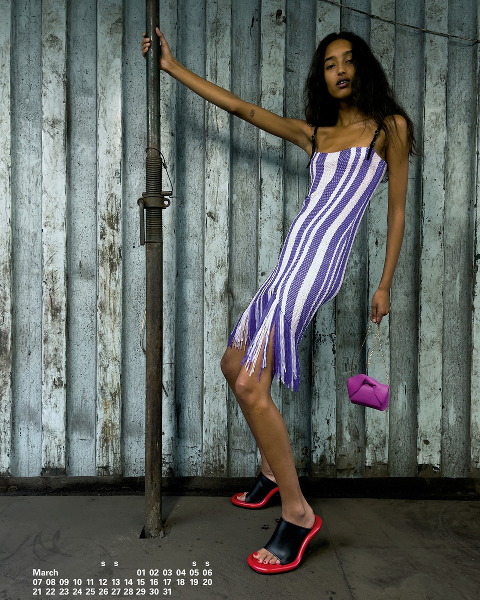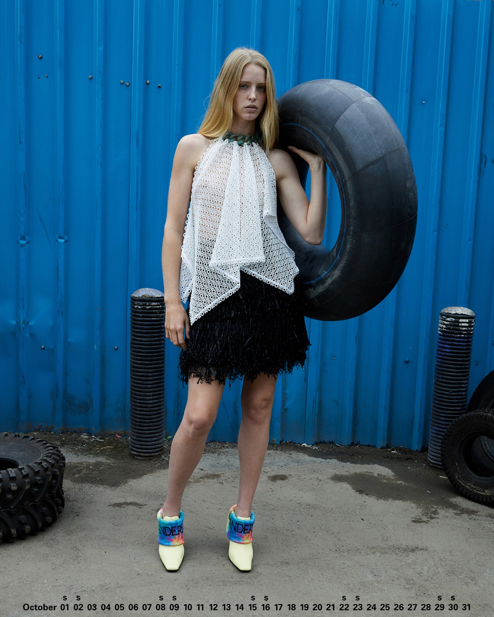 Лукбук JW Anderson оформили в виде календаря. Кроме Юргена Теллера, в кампейне появились и другие модели. Они примерили платья из шерсти с люрексовой нитью, из черного и белого тюля, из ярко-розового латекса, вязаные юбки и кожаные сарафаны.
