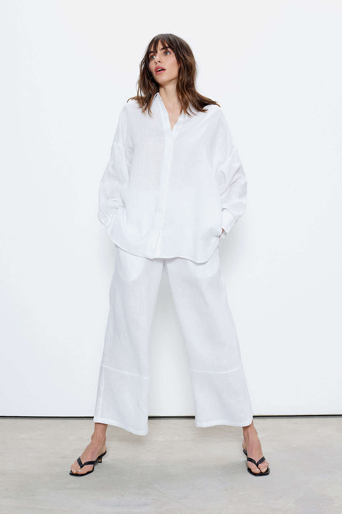 У колекцію також увійшли бестселери попереднього дропу Jul: майки, бюстьє, футболки без рукавів зі вставними плечиками у нових кольорах та чорна спідниця з трояндовим принтом. Бренд також не пройшов повз піжамного костюма у синьо-білу смужку, за яким з першого дня вишикувалась черга клієнток. Цього разу він у двох опціях – з брюками та з шортами. А також є варіація з білого льону.