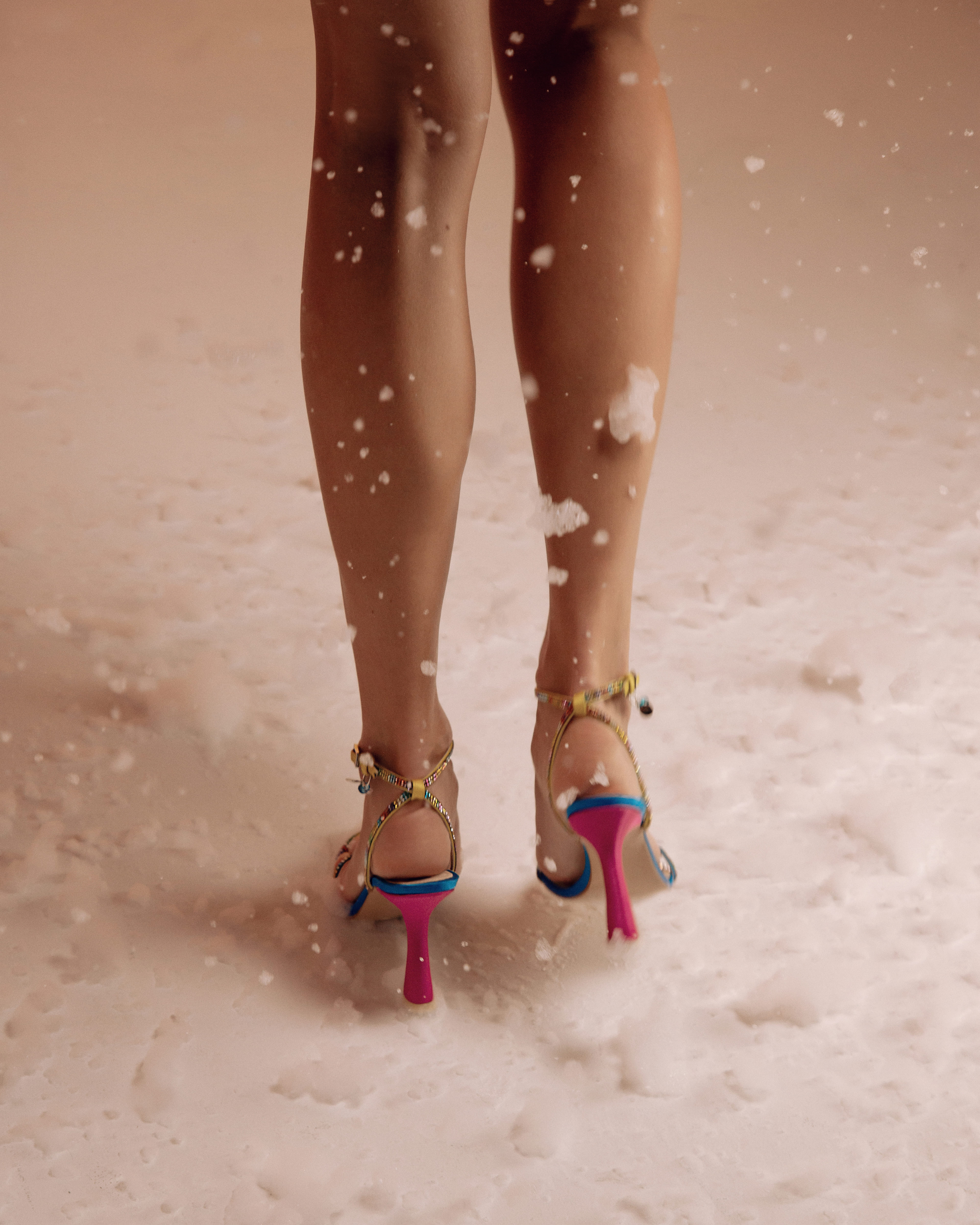В капсулу вошли женственные босоножки, для которых Kachorovska разработали совершенно новую колодку. Они выполнены в двух разных моделях, в черной, золотой и радужной палитре.