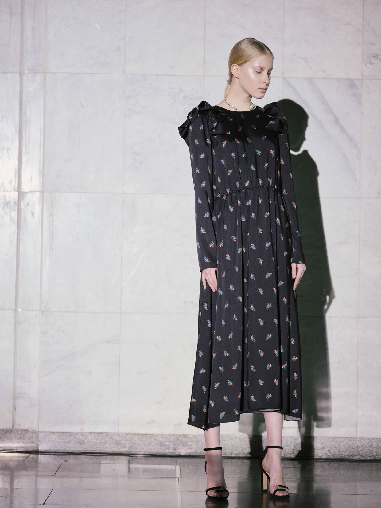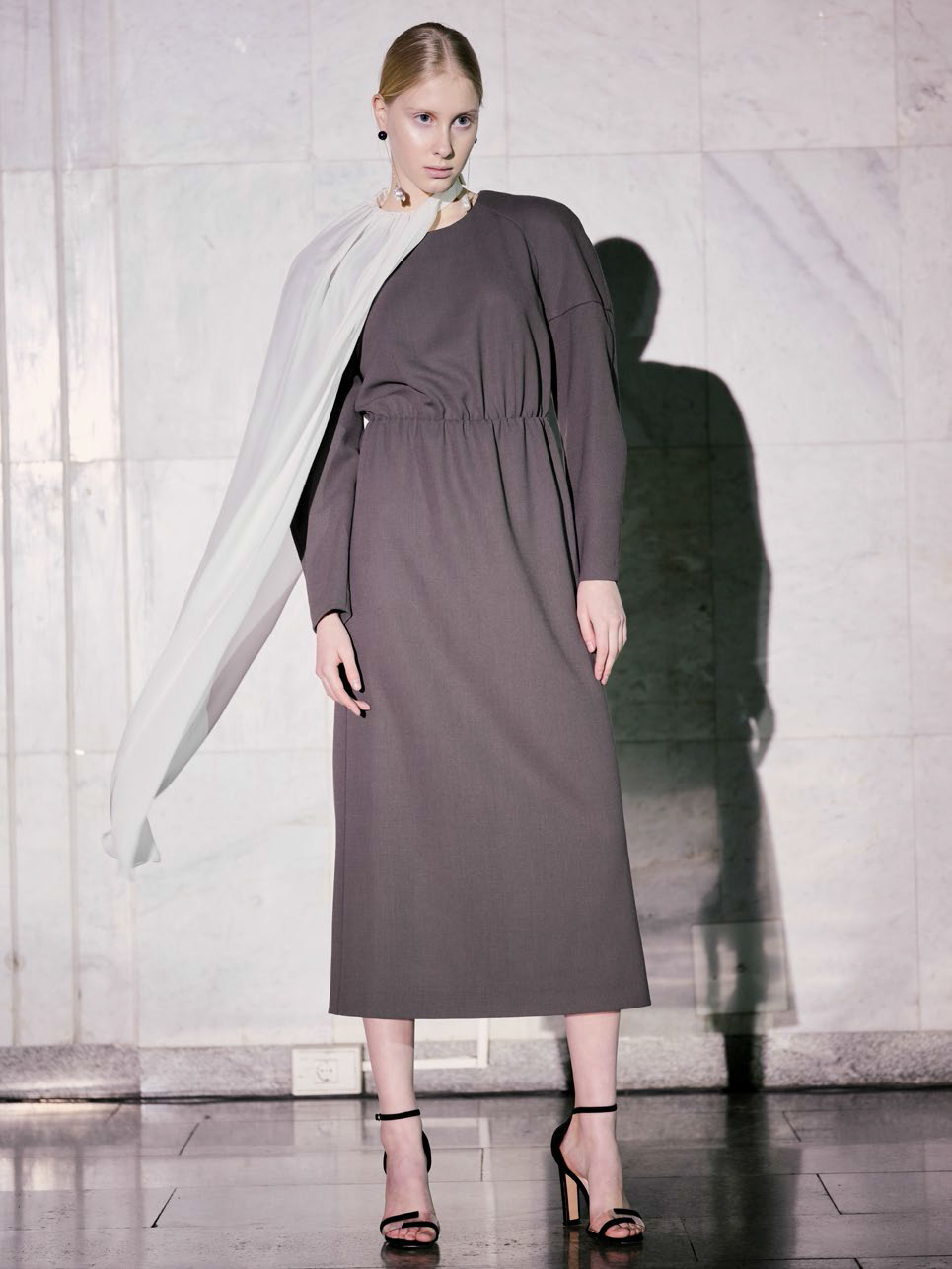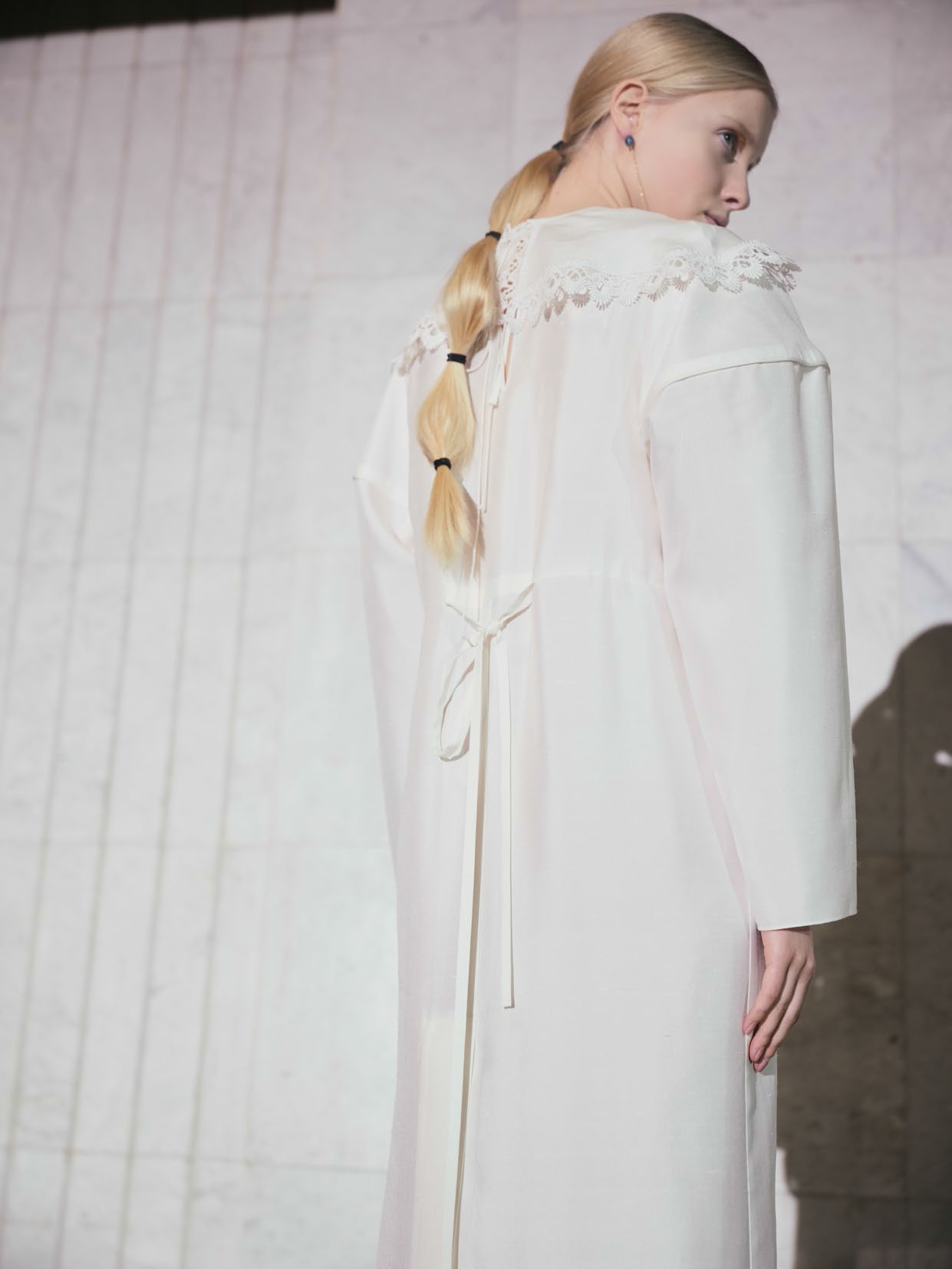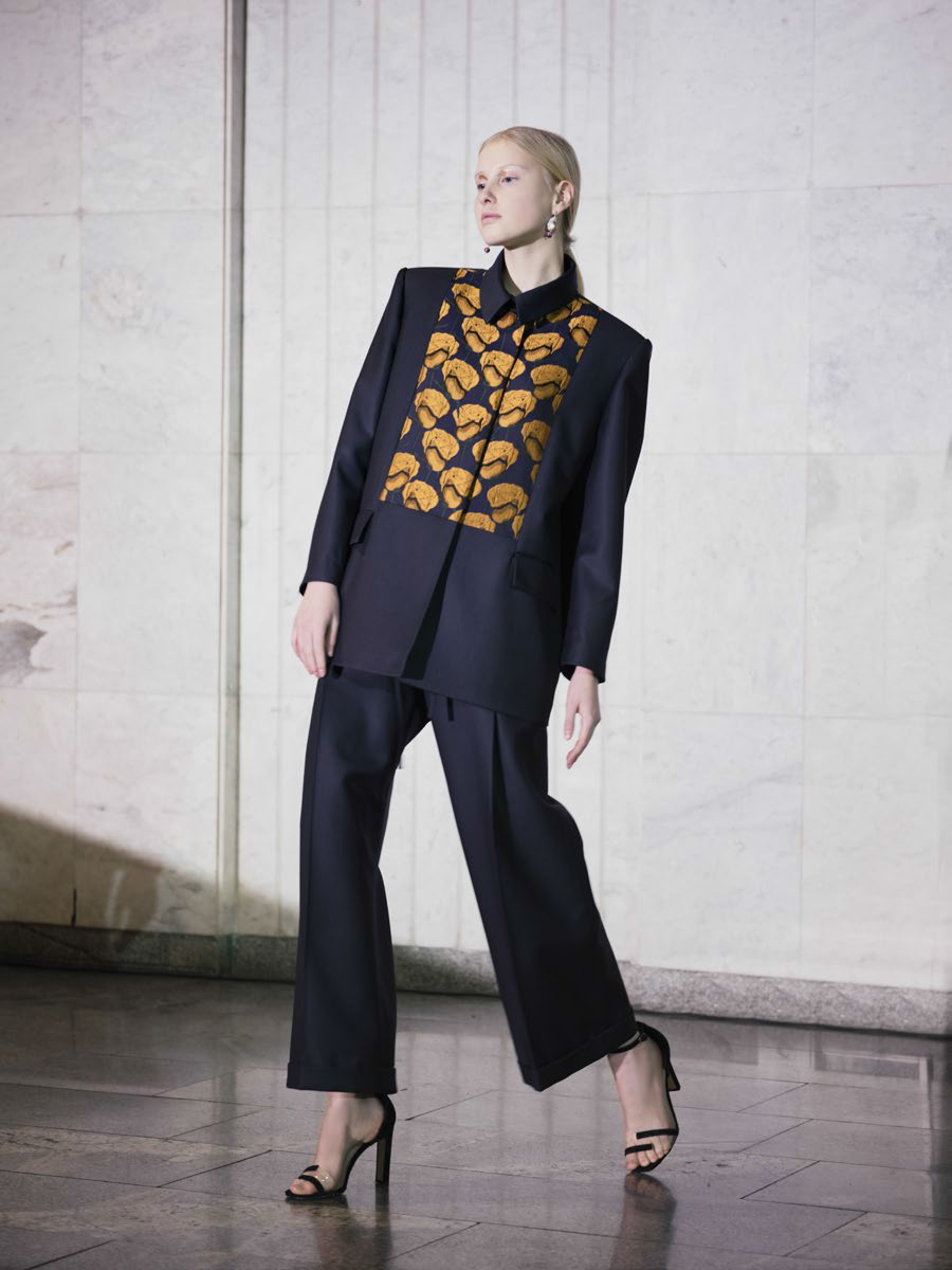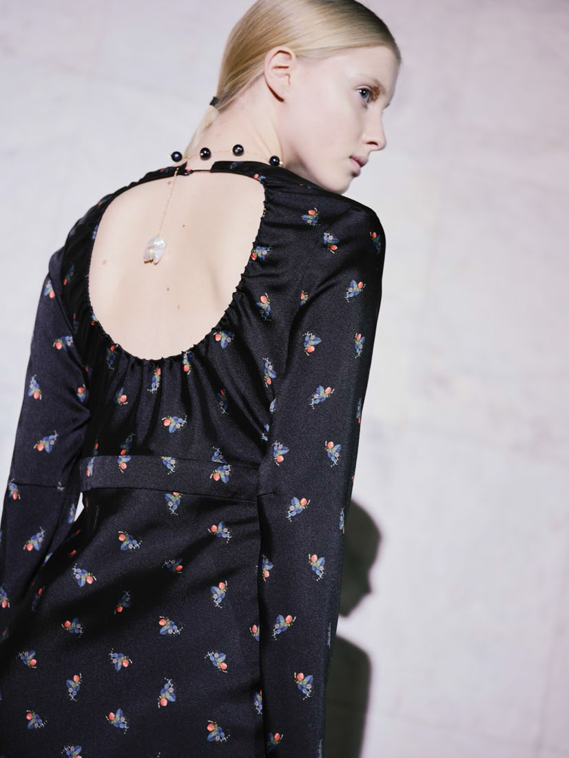 В линии аксессуаров представлены шерстяные капюшоны с длинными концами, которые можно завязывать как шарф. Манишки из тонкого шелка, воротнички из кружева и бархата и, конечно, украшения: браслеты, подвески, броши, чокеры и серьги с речным жемчугом неправильной формы.