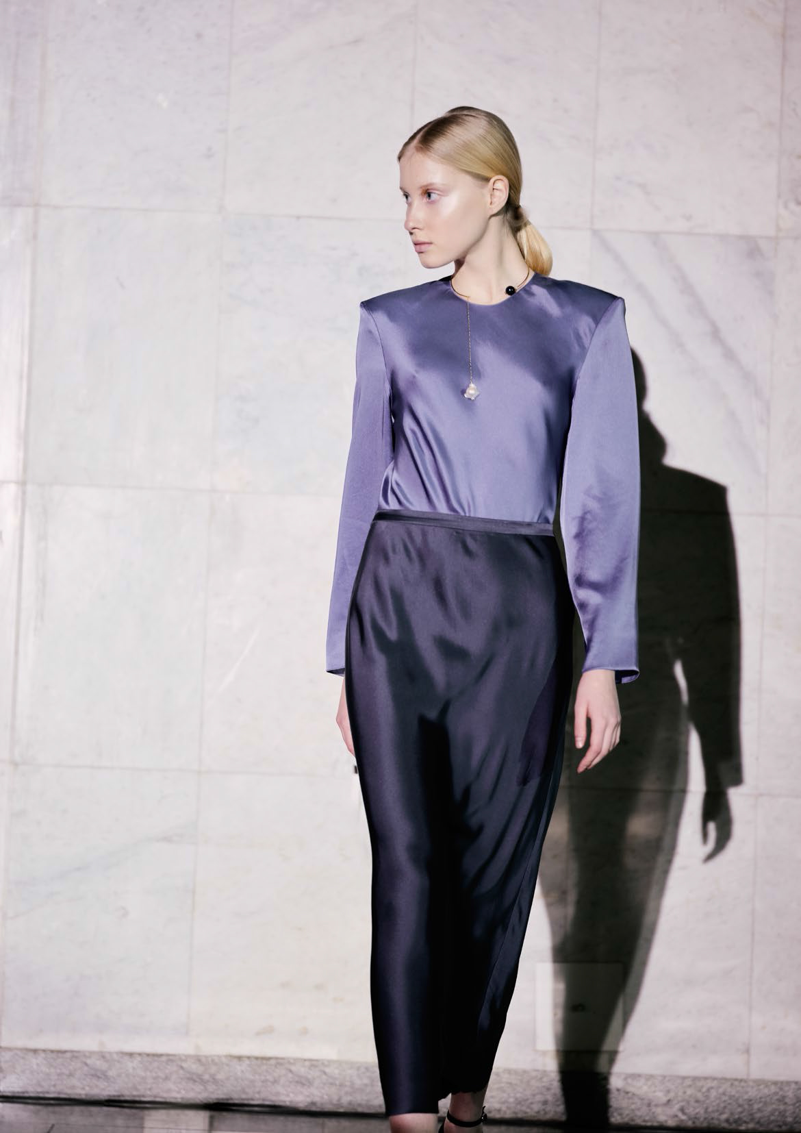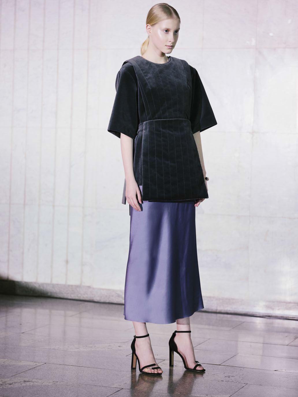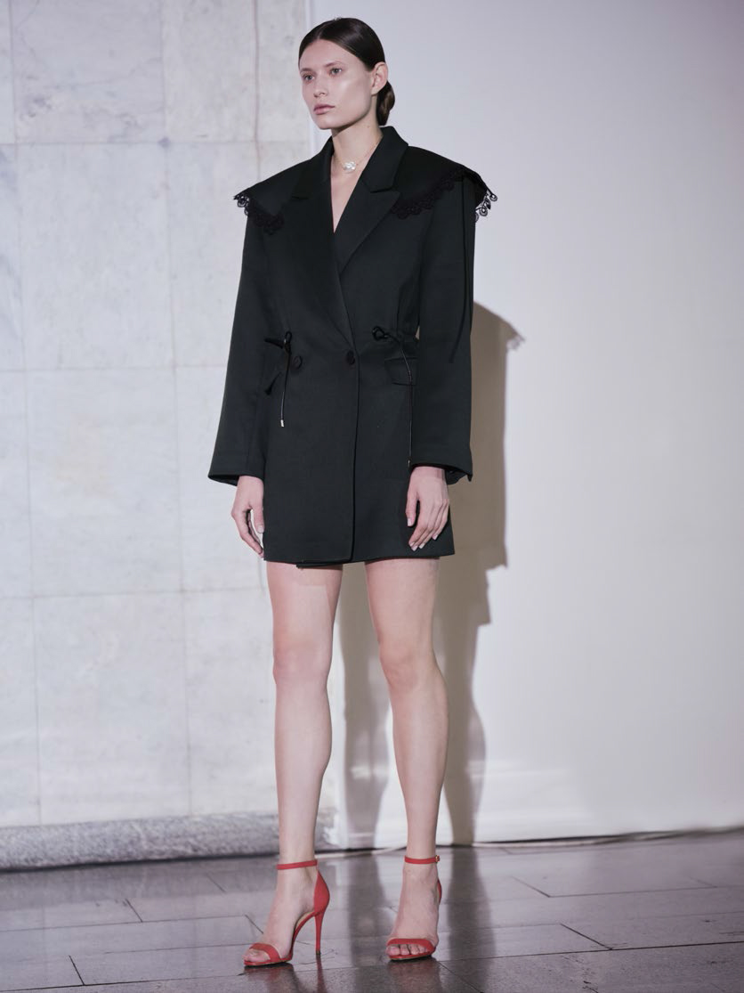 Как отсылка к эстетике Возрождения в новой коллекции присутствует бархат — из него пошиты топы и удлиненные манишки, — а также жаккард, который послужил основой корсетов и платьев. В коллекции представлены трикотажные юбки и платья и используются различные фактуры шерсти, вискоза в лавандовых оттенках и несколько видов кружева.
