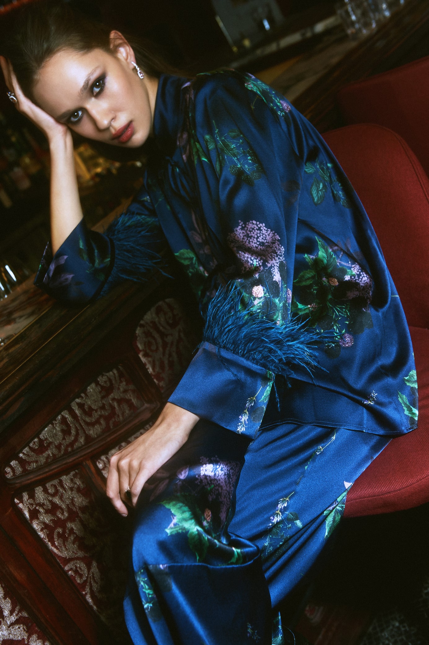 Среди принтов в лимитированной коллекции — курочки Петра Марковича, орнаменты в виде девушек-купальщиц, цветки бархатцев и гроздья ежевики, воины-самураи и иконические для бренда артишоки. Пижамы созданы в восточной эстетике, с воротником-стойкой и на завязках вместо пуговиц. Новым релизом Lake Studio провели ретроспективу своих знаковых линеек.