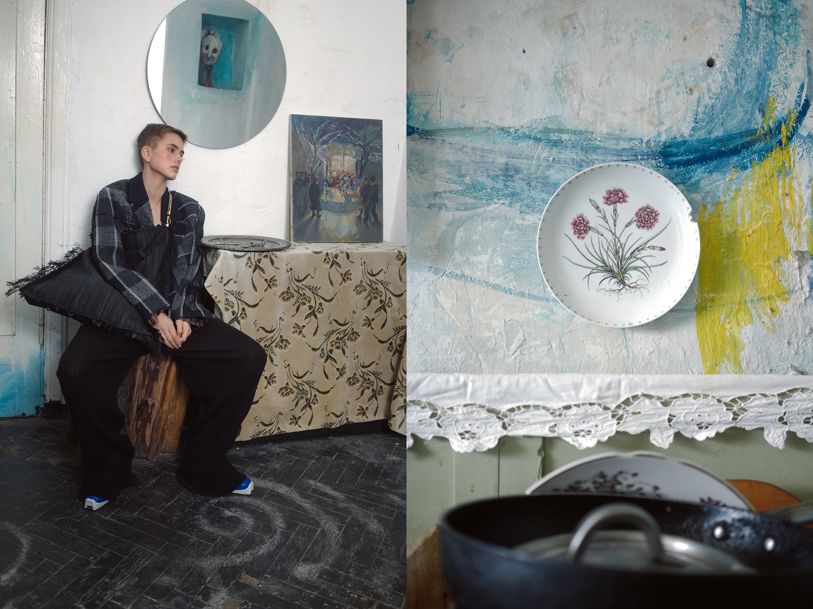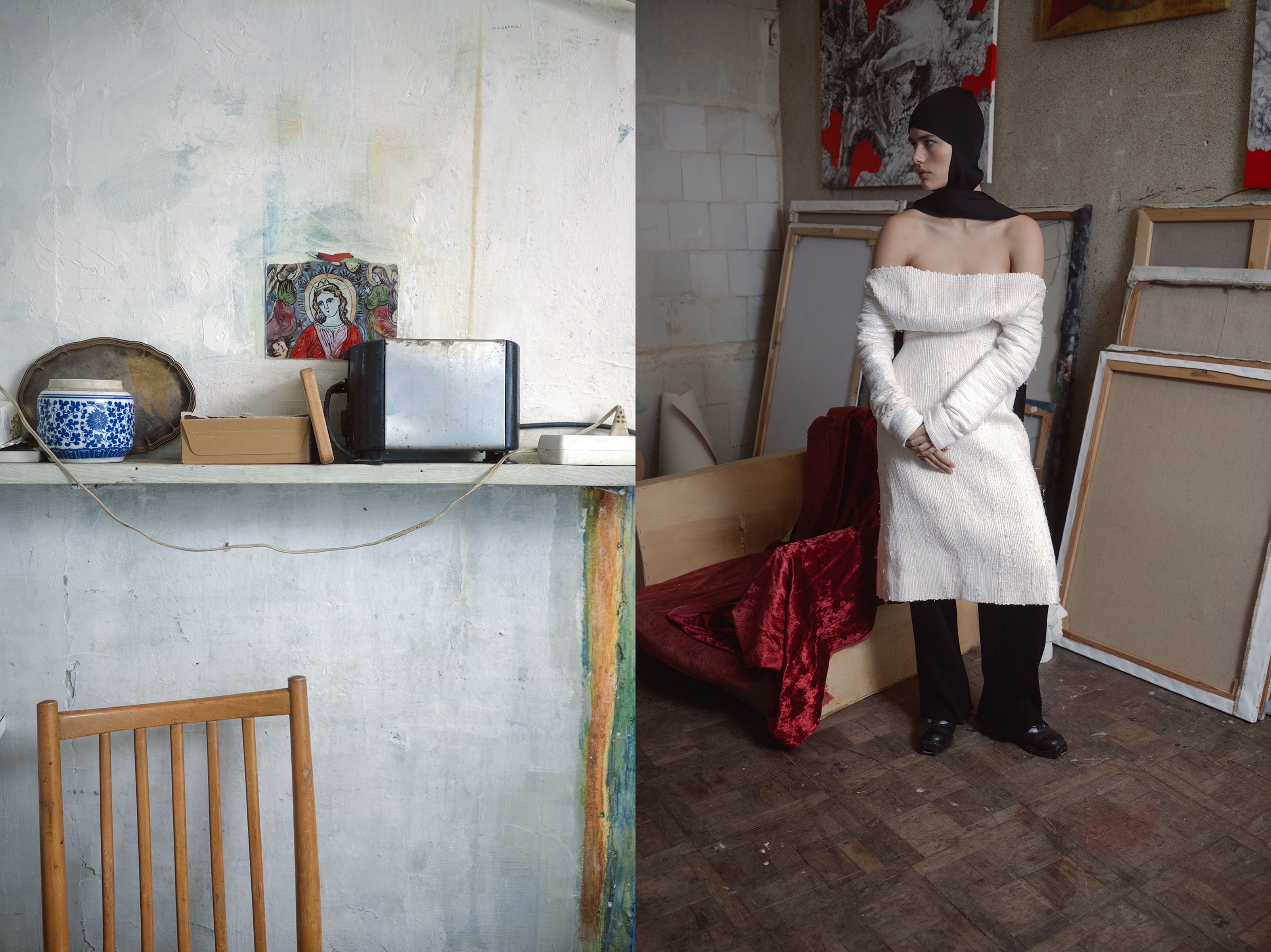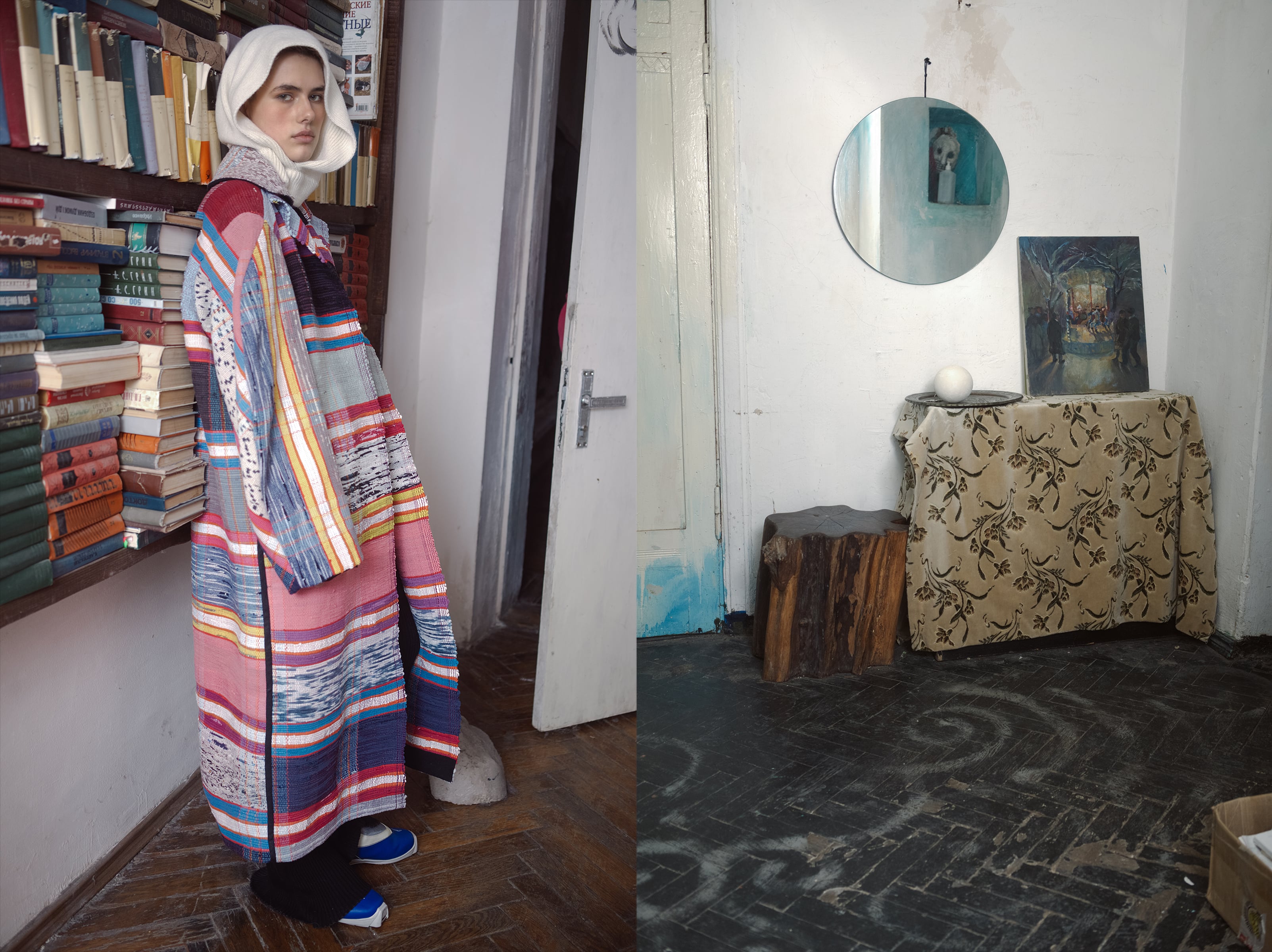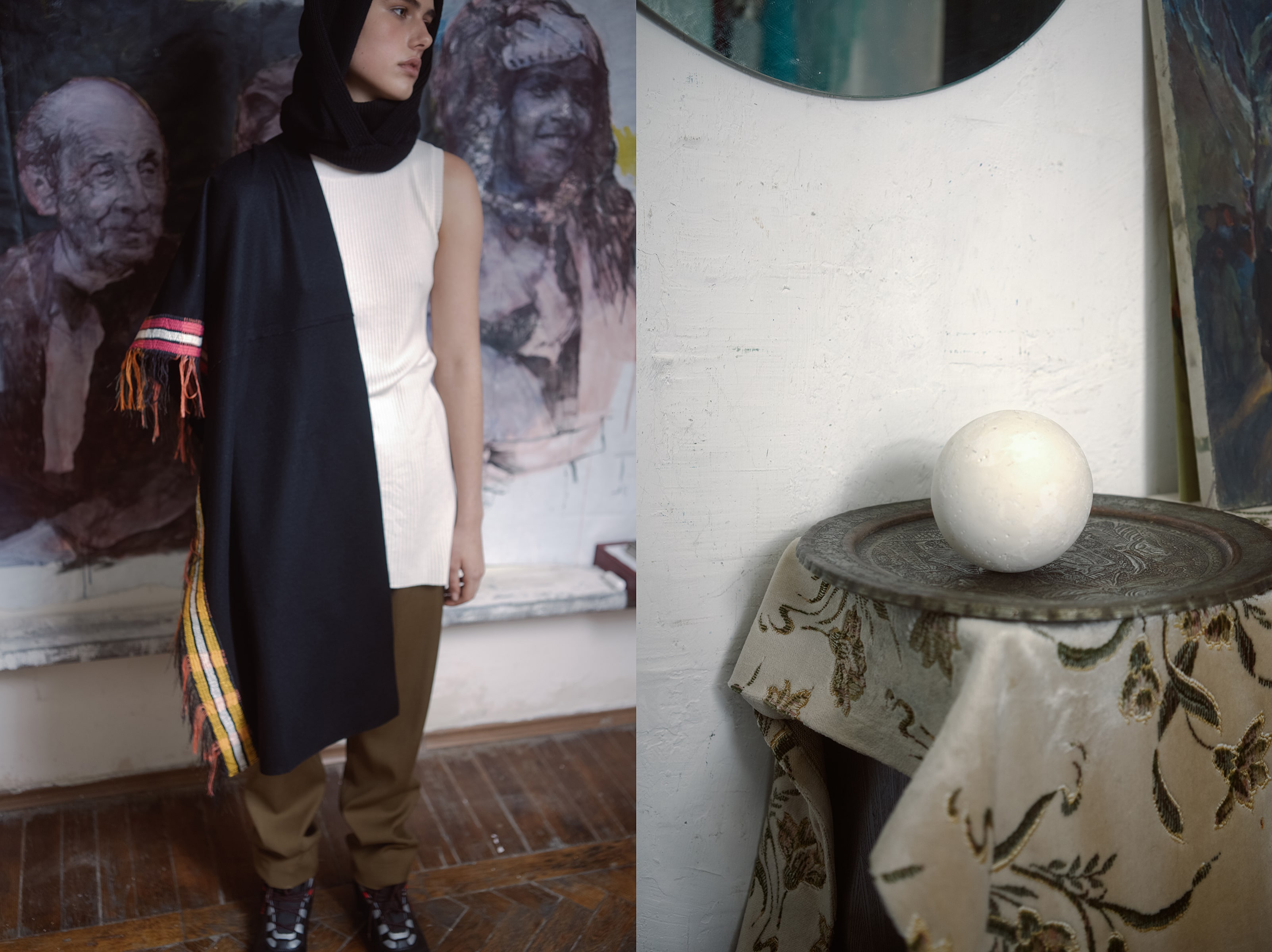 Демикутюрная линия Artisanal создана из переработанных материалов. Образы Litkovskaya органично вписались в старинную обстановку, сохранив современные силуэты и неподвластные времени материалы.
