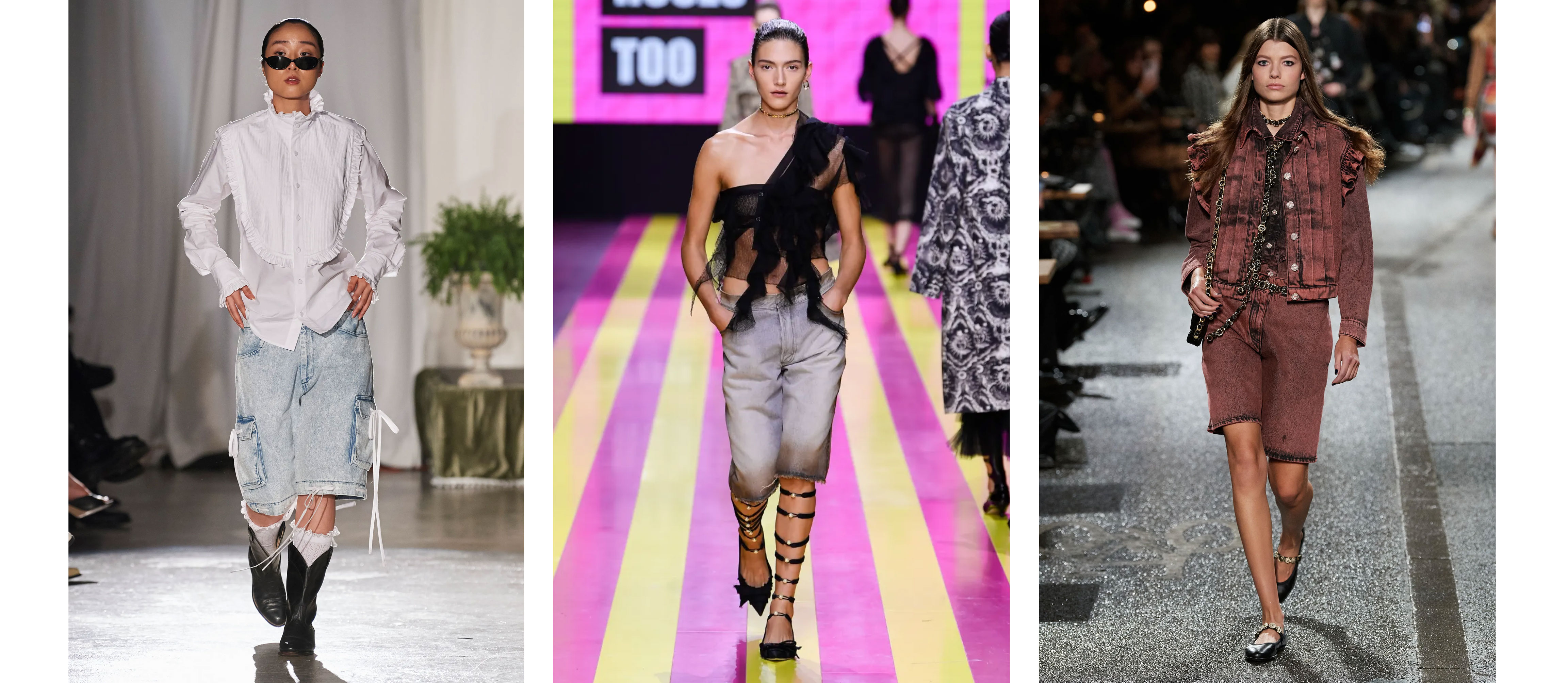 Не обійшлося без довгих денімових шортів у таких великих модних гравців, як-от Chanel і Dior. Перші — зробили ставку на барвисто забарвлений денім зі значною кількістю декоративних елементів, зокрема на ремені, шиї, балетках та сумці. Другі — нагадали, що потертості й ефект «зношеності», як-от у представлених шортах, не втрачають актуальності.