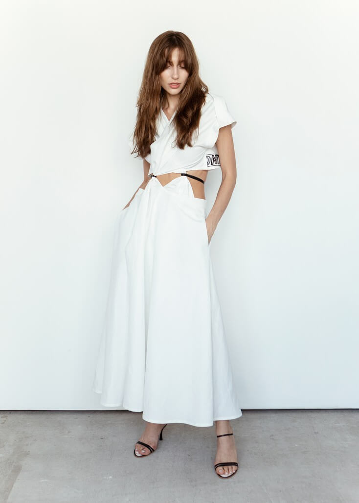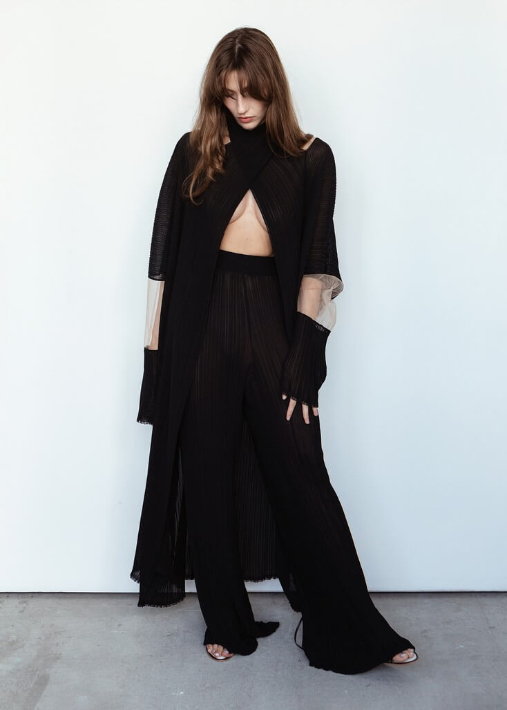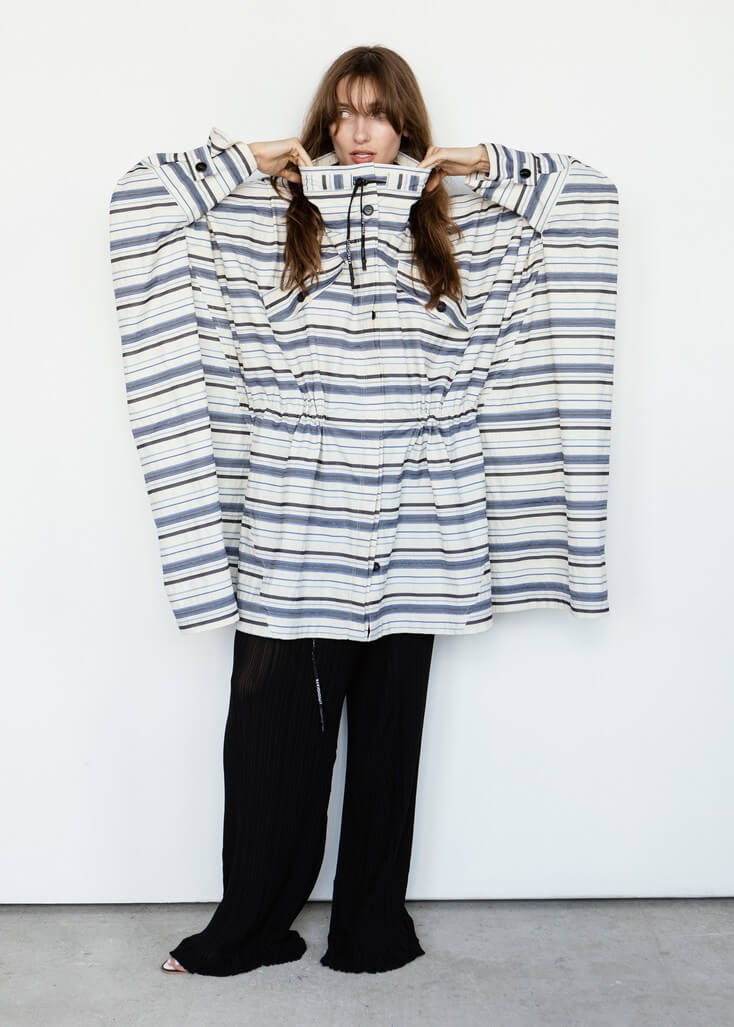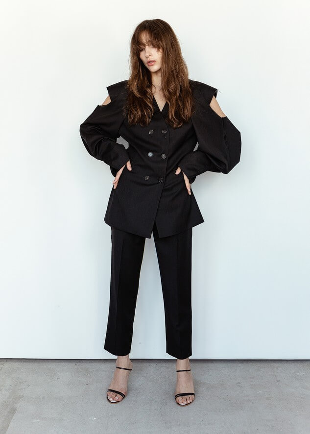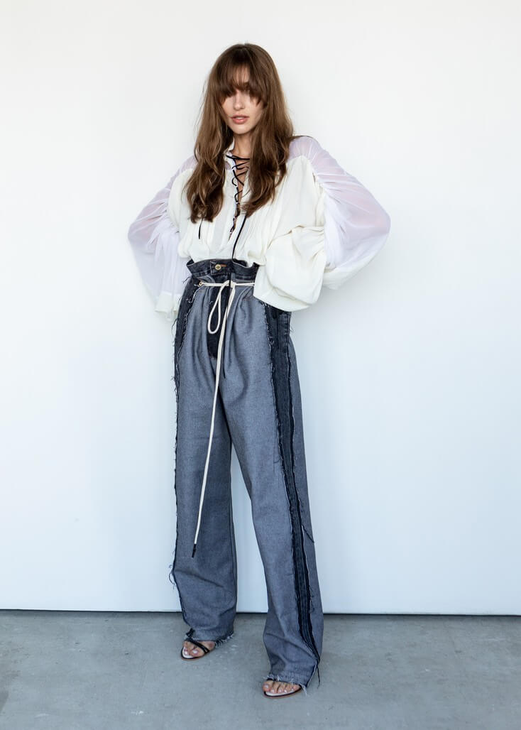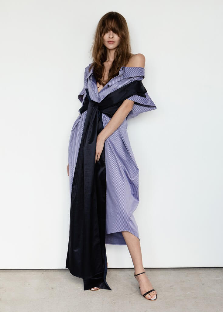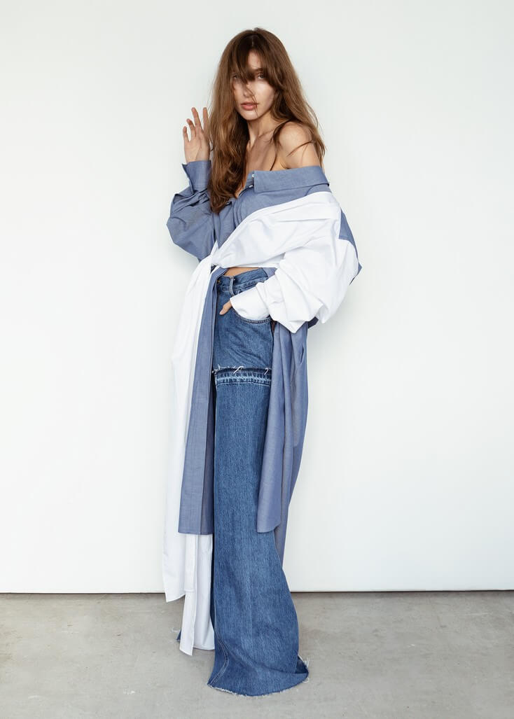 Среди вещей линейки вывернутый деним в сочетании с костюмной полоской и цветные плиссе с маститым жаккардом. Также есть платья различных фасонов из струящихся тканей, объемные рубашки и несколько видов костюмов. Деним конструируется в различные формы, что позволяет создавать оригинальные образы.