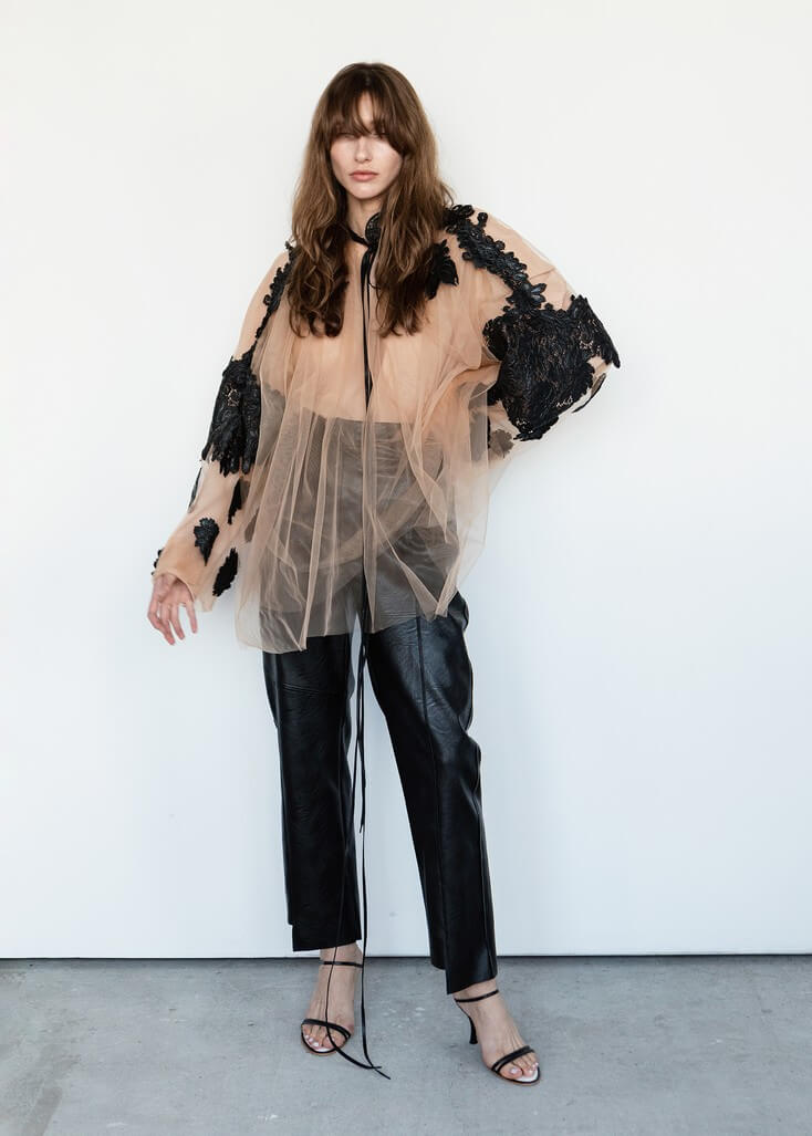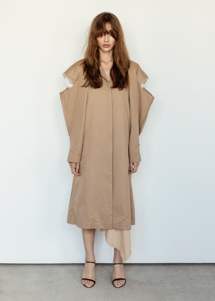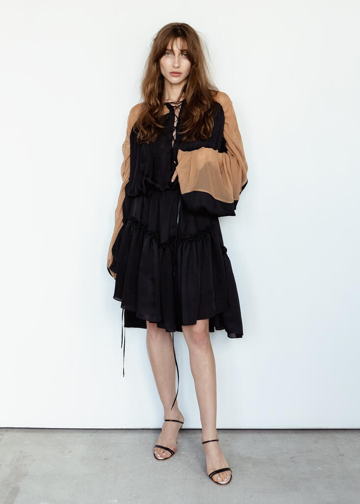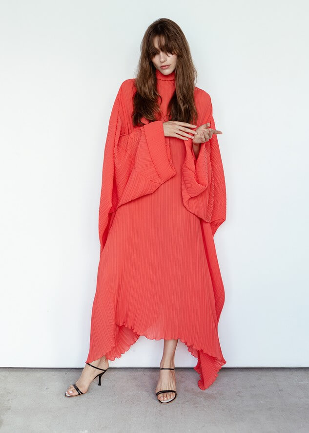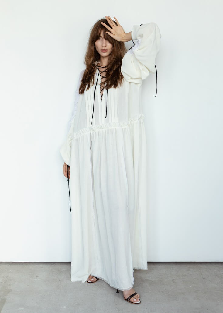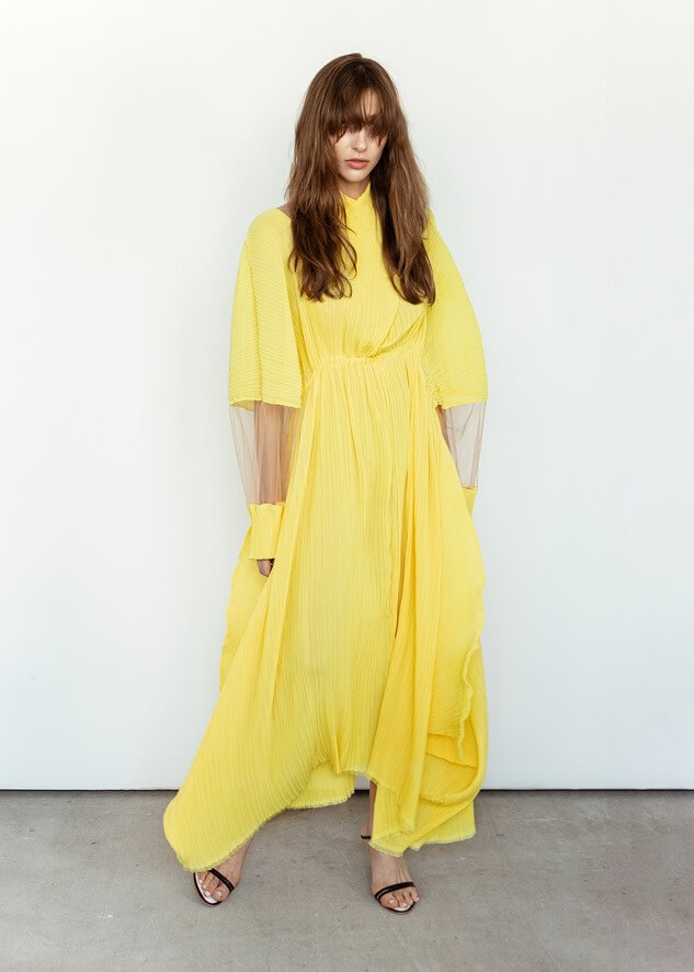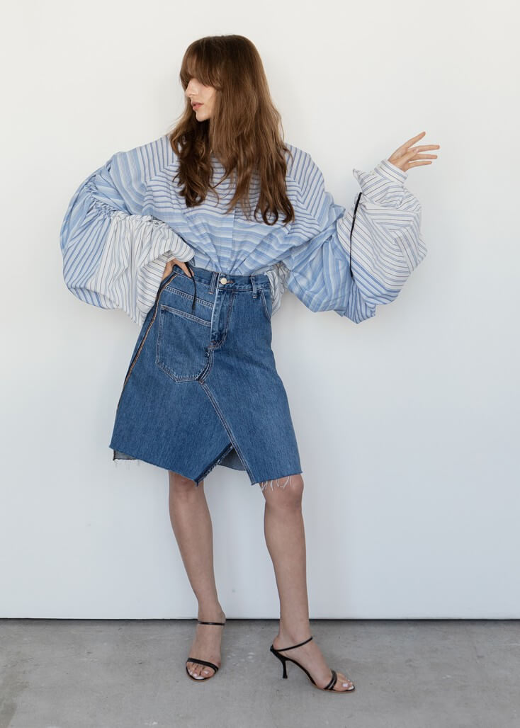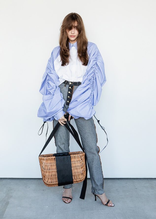 Среди вещей линейки вывернутый деним в сочетании с костюмной полоской и цветные плиссе с маститым жаккардом. Также есть платья различных фасонов из струящихся тканей, объемные рубашки и несколько видов костюмов. Деним конструируется в различные формы, что позволяет создавать оригинальные образы.
