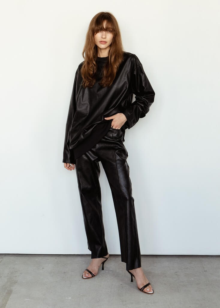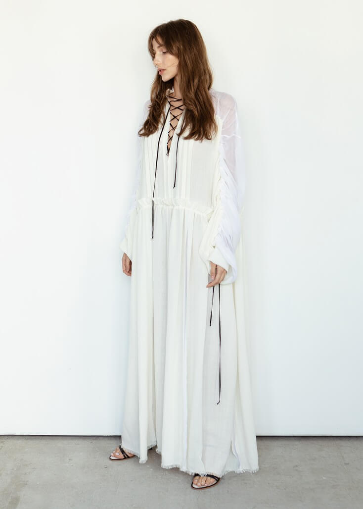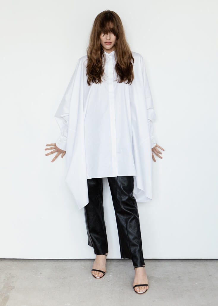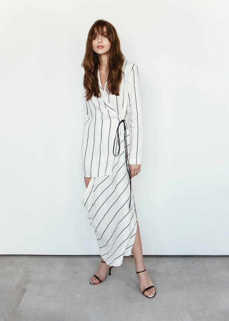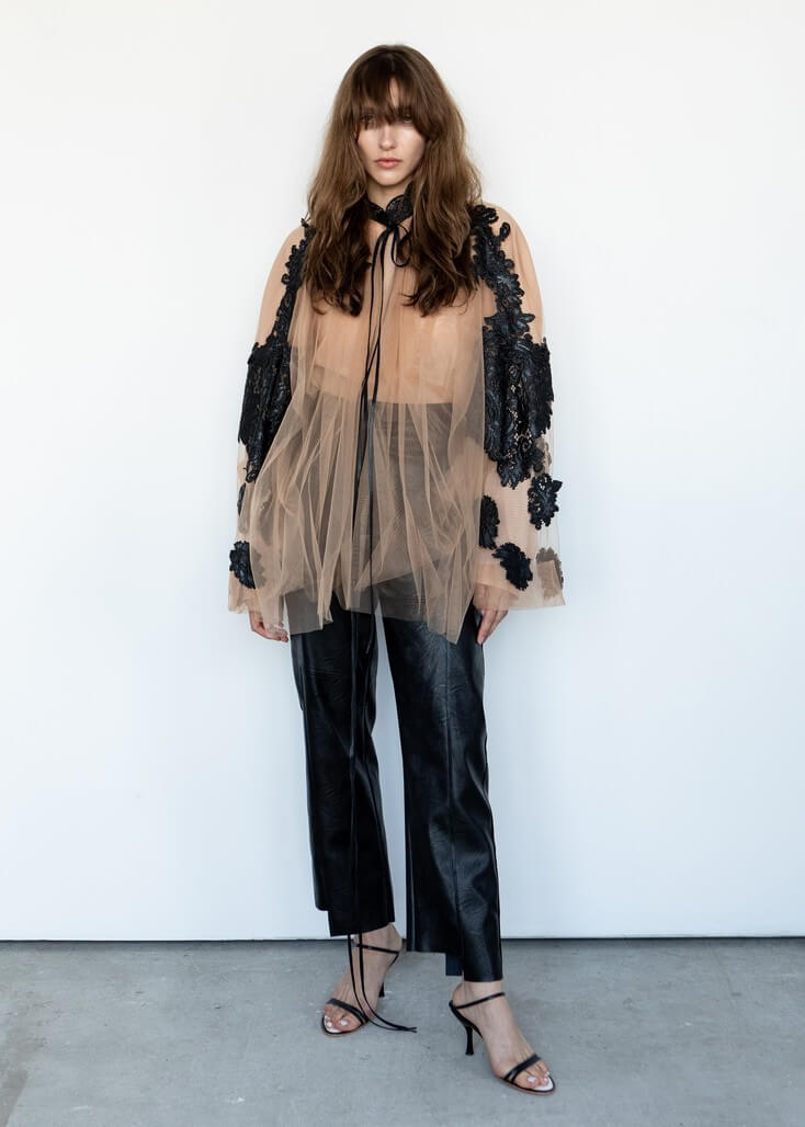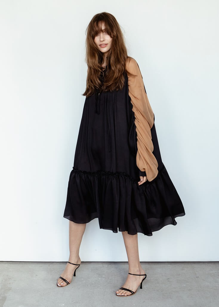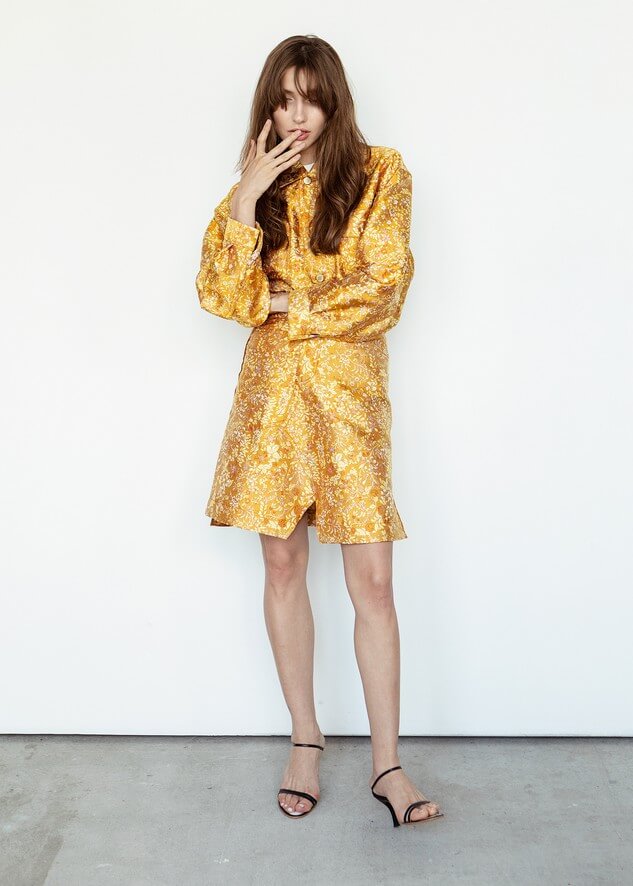Среди вещей линейки вывернутый деним в сочетании с костюмной полоской и цветные плиссе с маститым жаккардом. Также есть платья различных фасонов из струящихся тканей, объемные рубашки и несколько видов костюмов. Деним конструируется в различные формы, что позволяет создавать оригинальные образы.