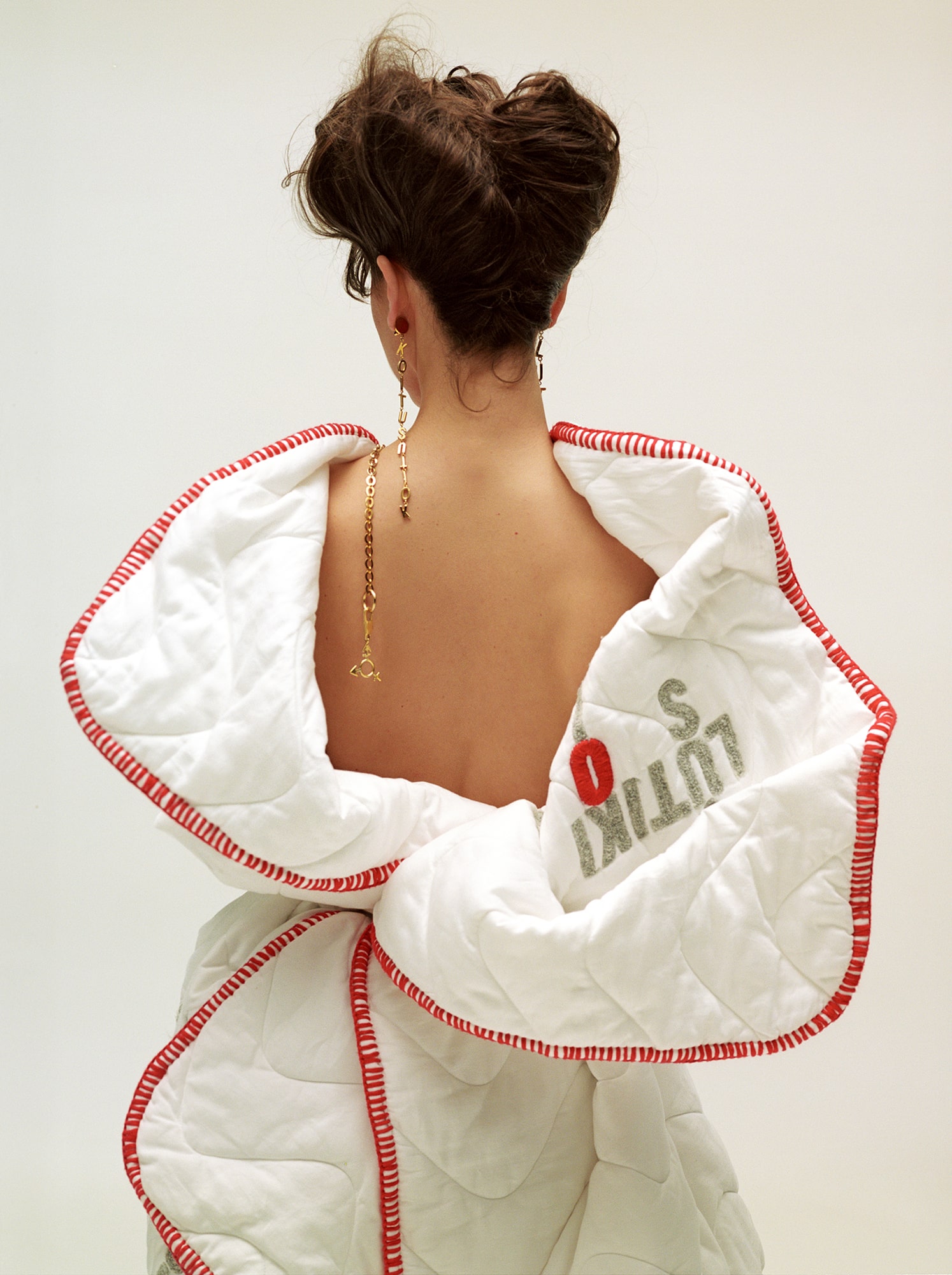 Одеяло украшено монохромной вышивкой тамбурным швом. Надписи Lutiki и Koitus расположены по линиям кроссворда. Акцентом выделяется красная буква "О", которая скрепляет ударной гласной имя создательницы бренда и название новой серии.