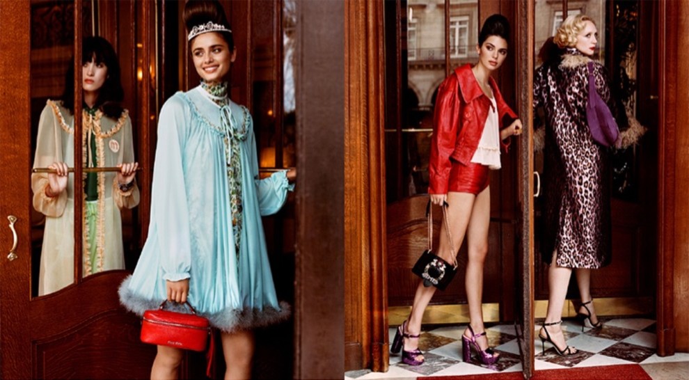 Героинями рекламной кампании круизной коллекции Miu Miu стали модели Тейлор Хилл, Адриана Лима, Кендалл Дженнер и звезда “Игры престолов” Гвендолин Кристи. На фоне дверей парижского фешенебельного отеля Regina модели позируют в образах из коллекции Resort 2019: коктейльные наряды с массивными украшениями, блестящие бельевые платья, бомберы и кардиганы в сочетании с крупным жемчугом и маленькими сумками. Ретропрически создал Энтони Тернер, за макияж отвечала Миранда Джойс. Над снимками работали фотограф Аласдейр Маклеллан и стилист Кэти Гранд.
