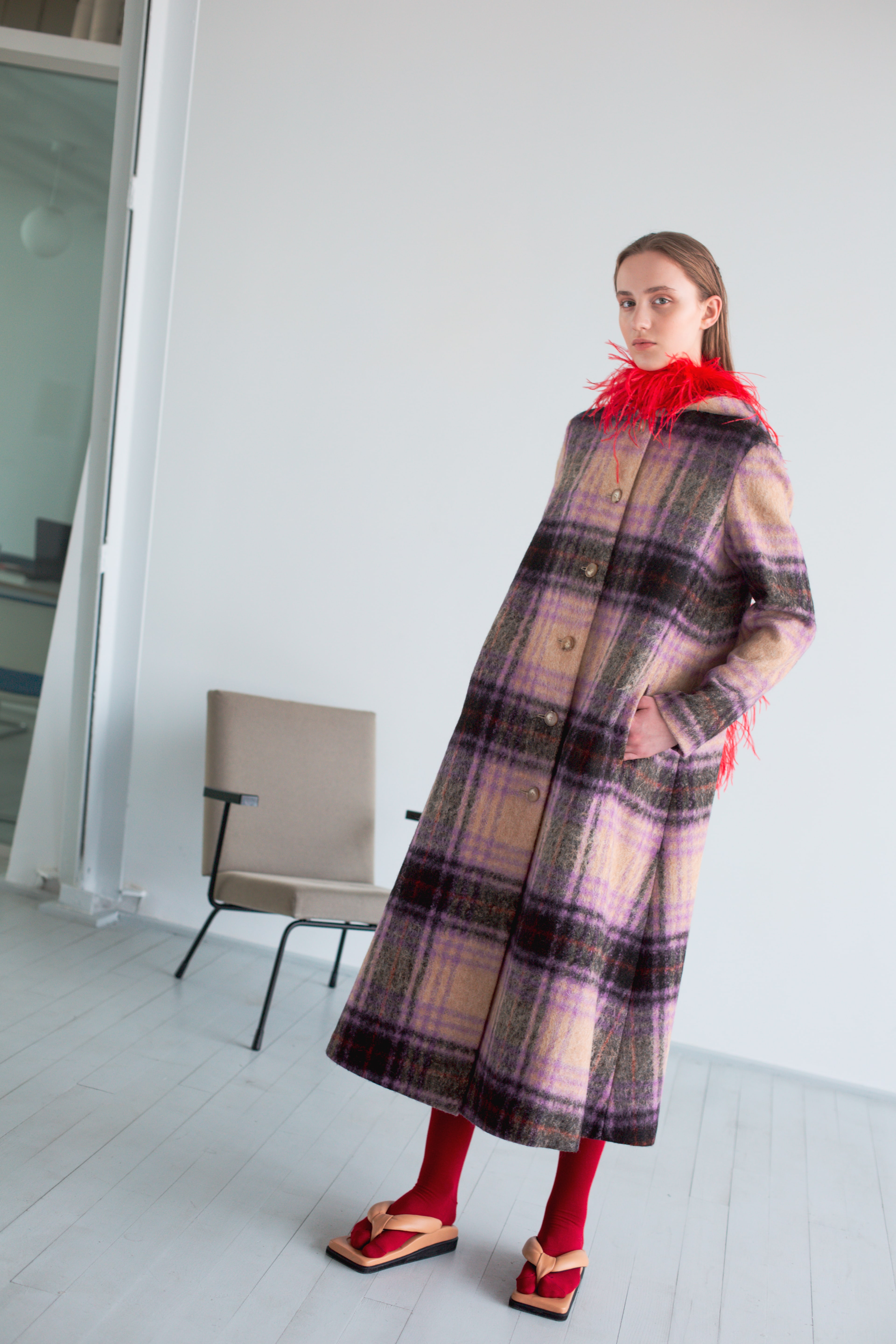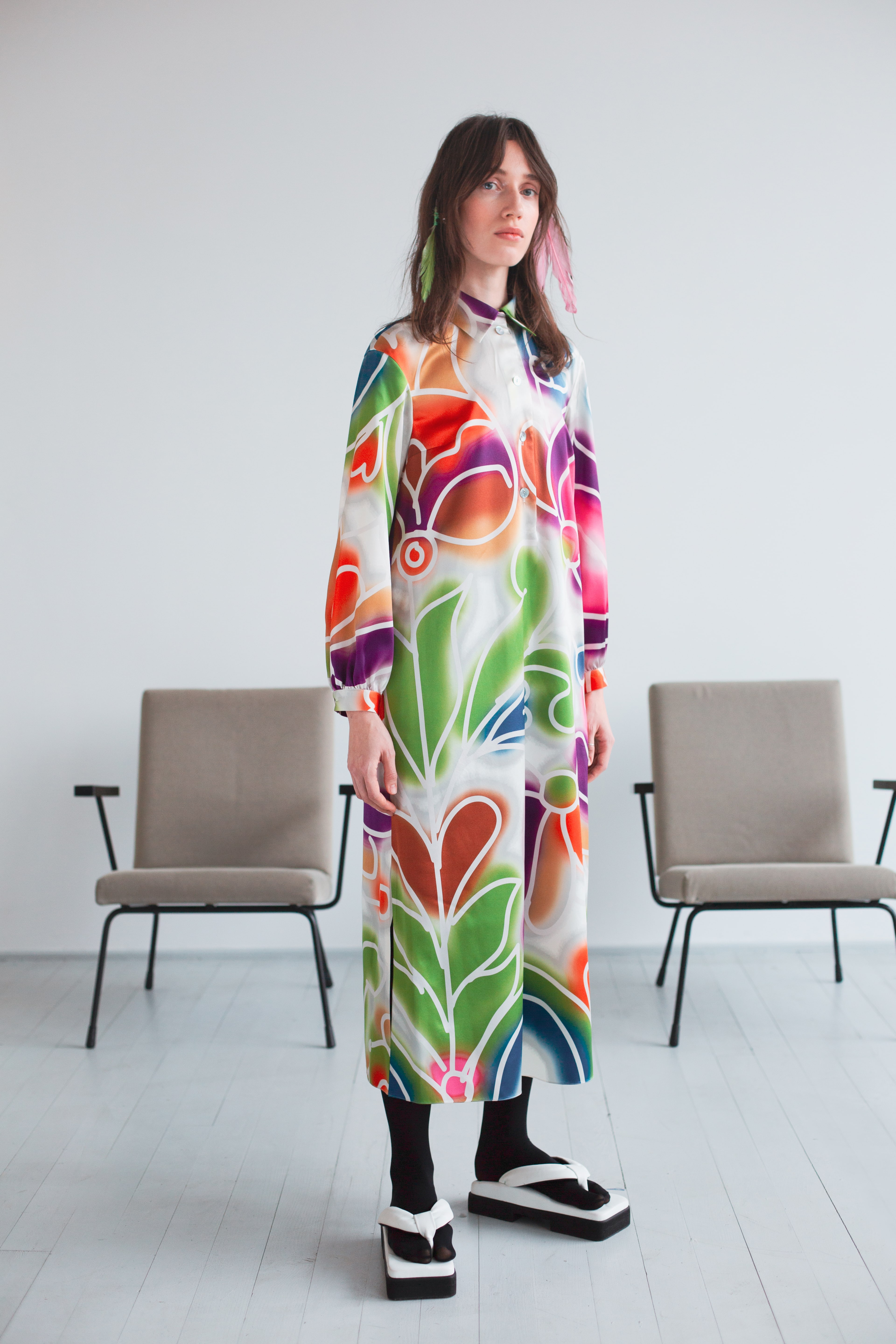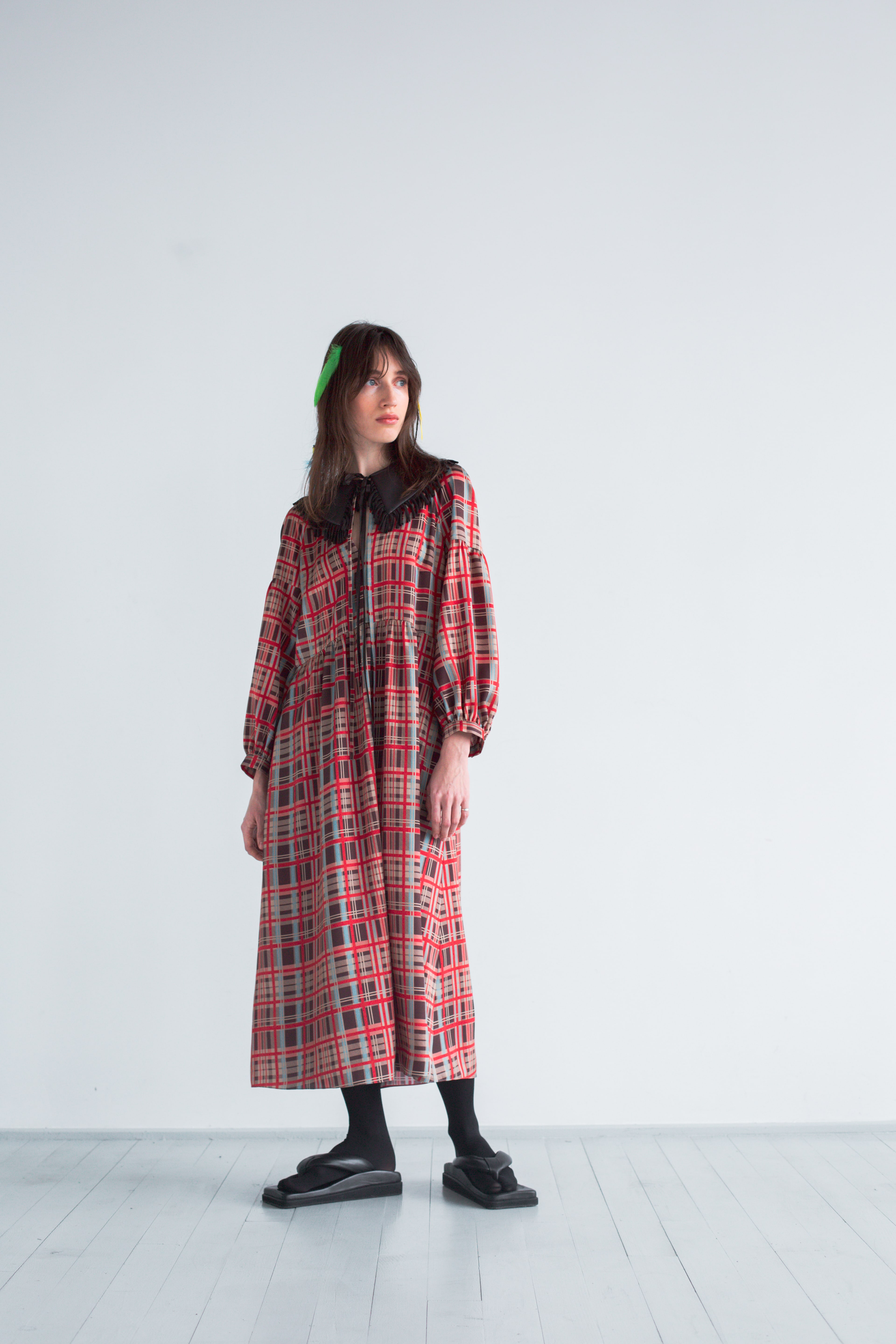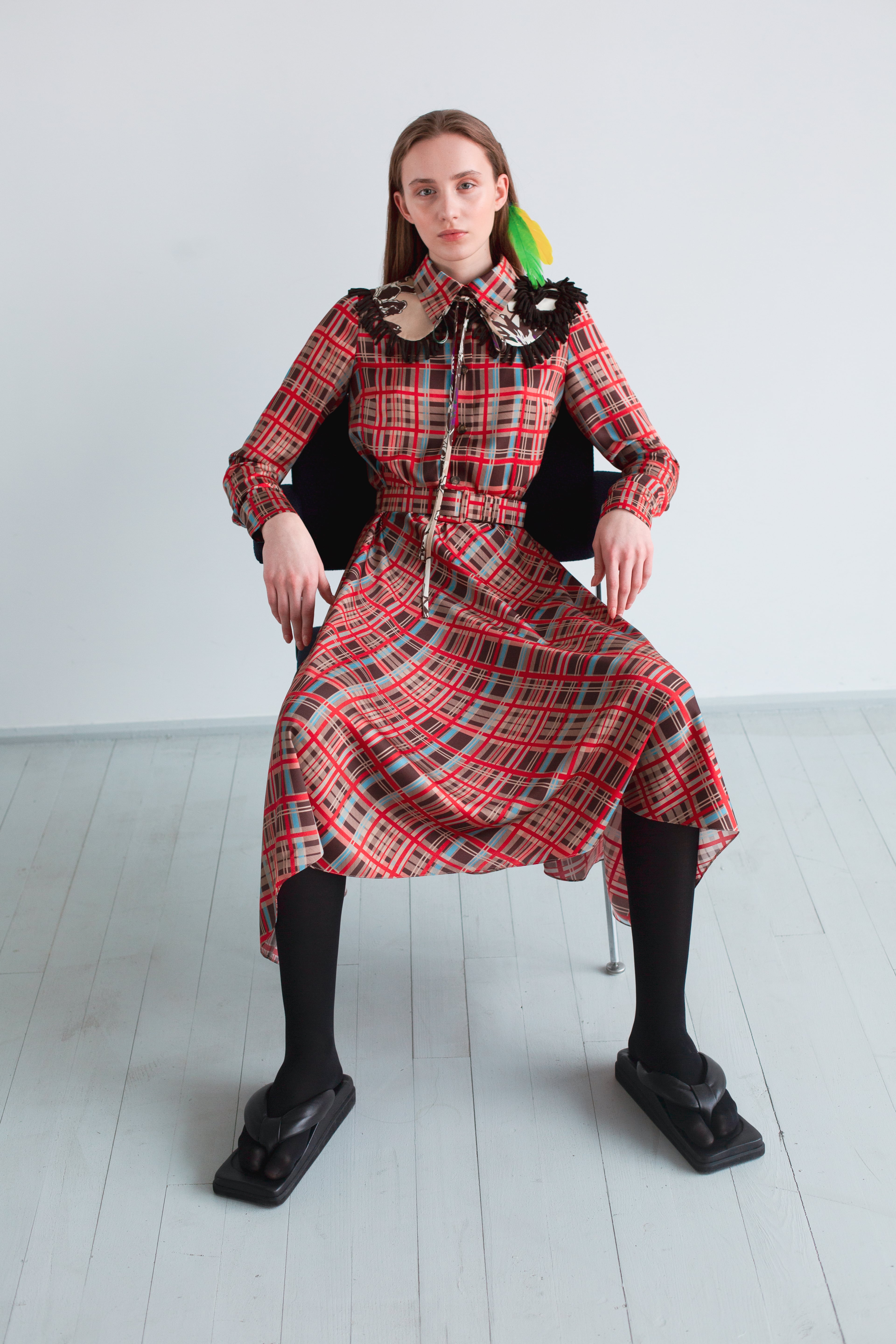 В новой коллекции дизайнер Лилия Пустовит объединила традиции косовской керамики, с её орнаментальным "древом жизни", и эстетику португальской этники — в частности декоративные приемы, которые встречаются на плитке "азулежу". Насыщенные осенние краски сочетаются с классической клеткой и знаковым для бренда цветочными принтом. Женственные платья дополнены отложными воротниками из экокожи, декорированными бахромой. Оставаясь верным своей ДНК, бренд Poustovit снова выдерживает грань между актуальностью и вневременной элегантностью.