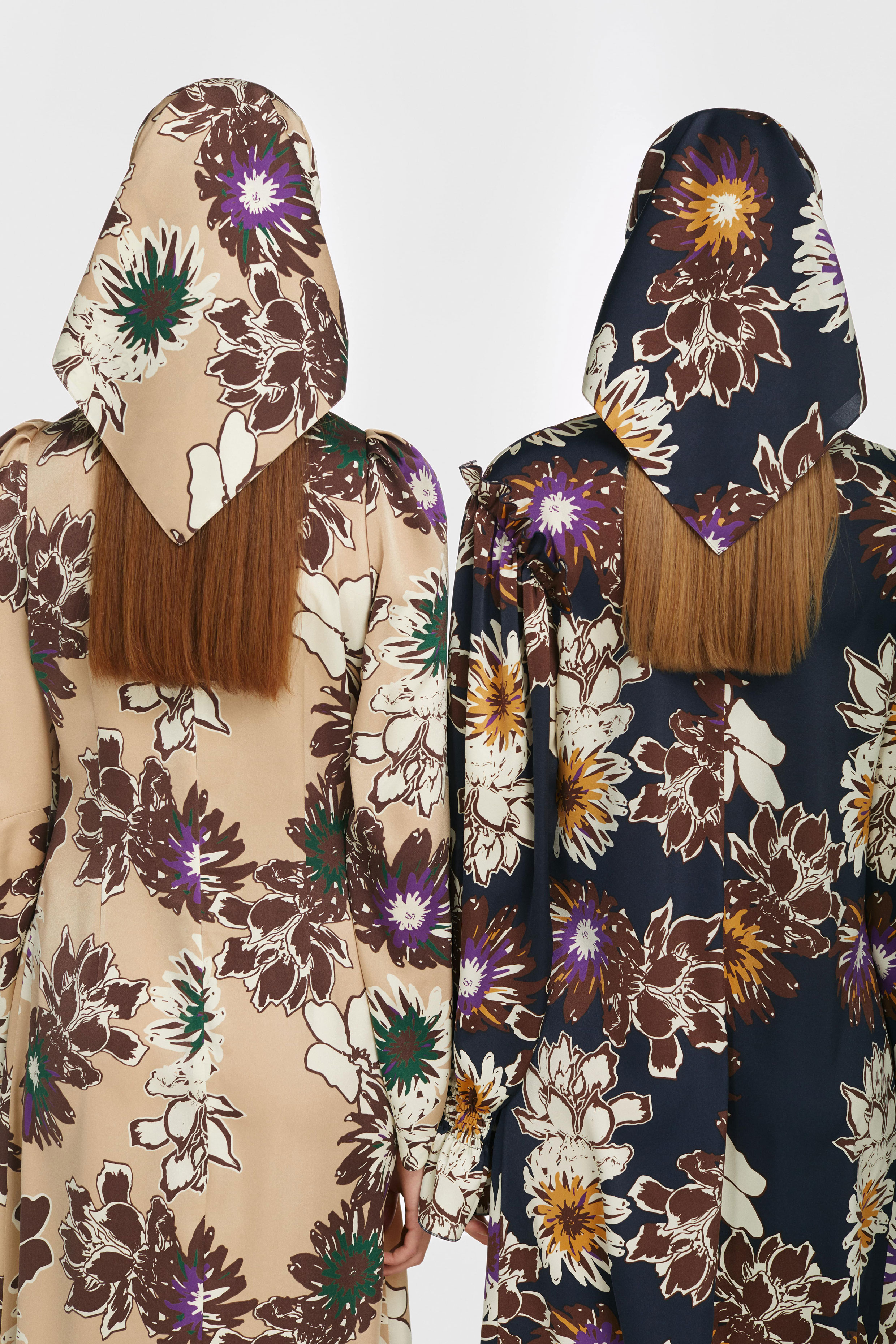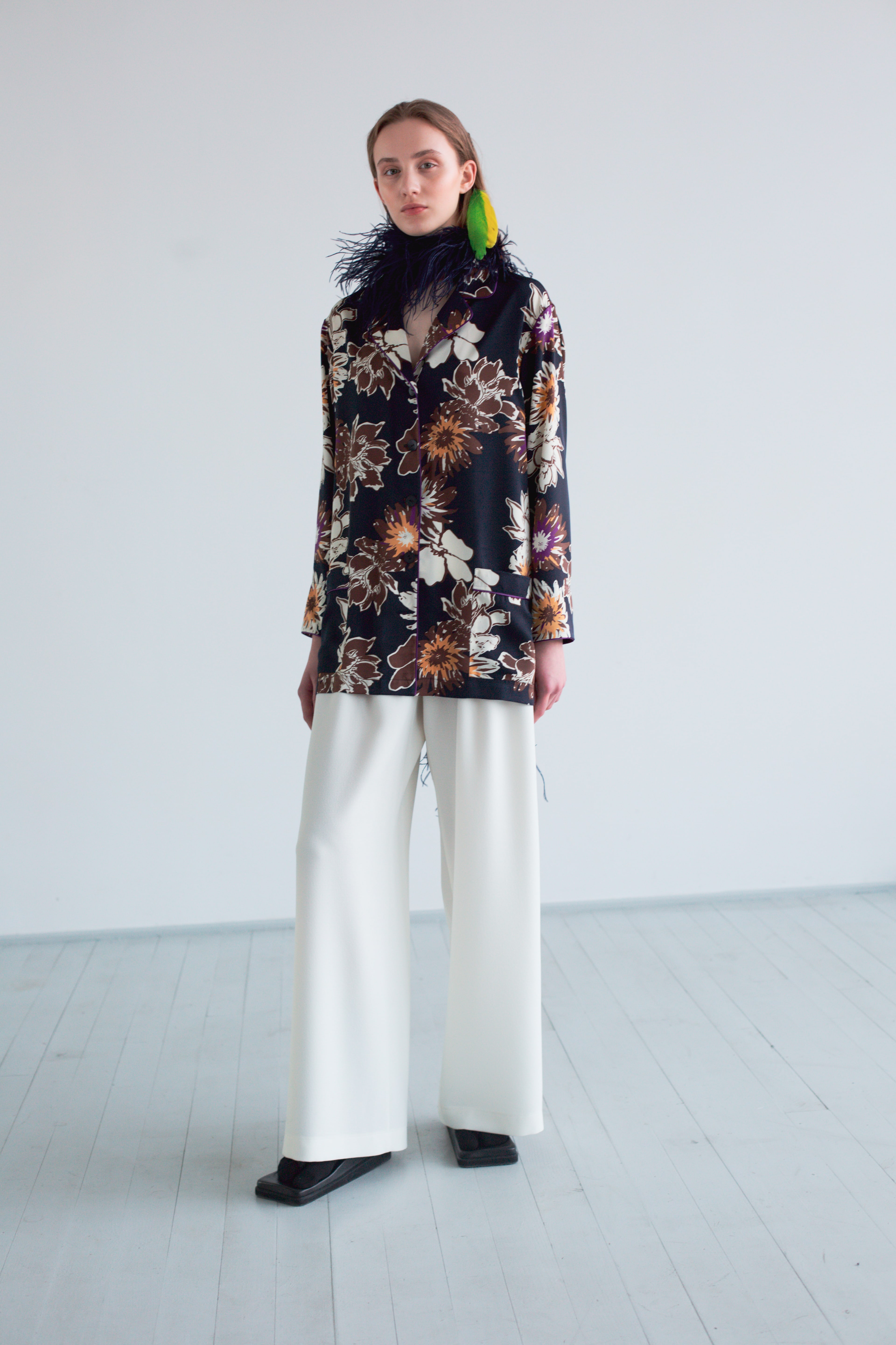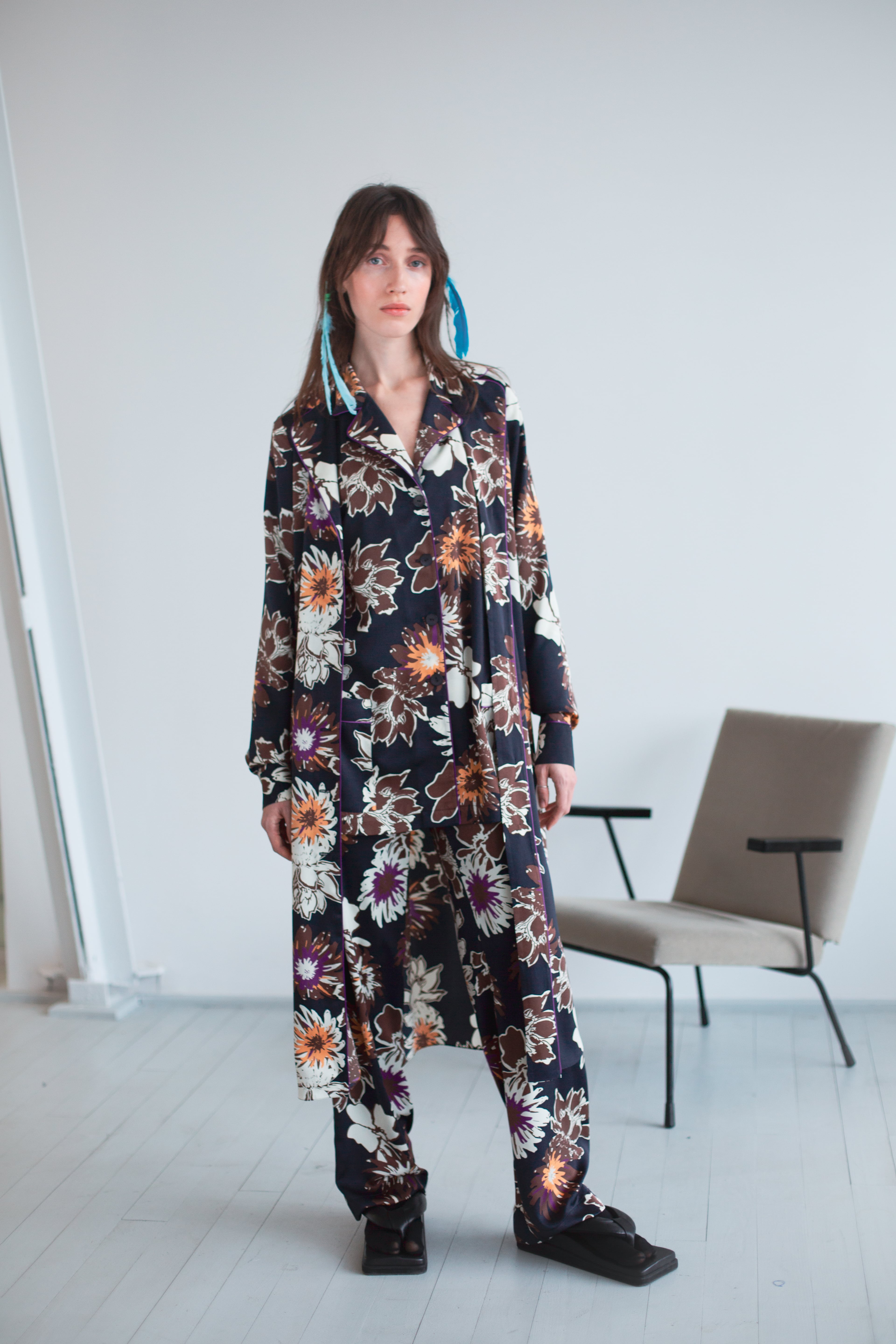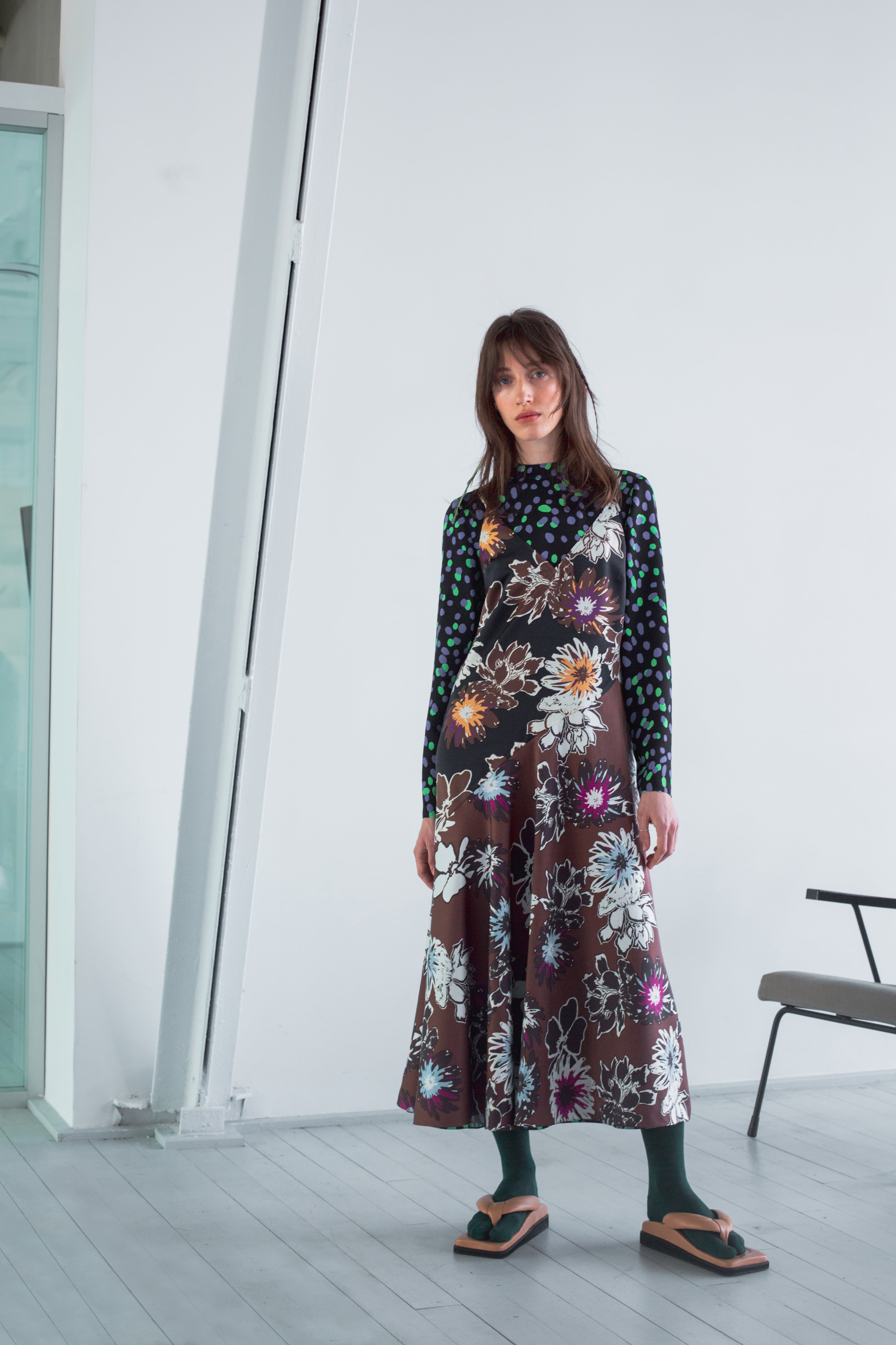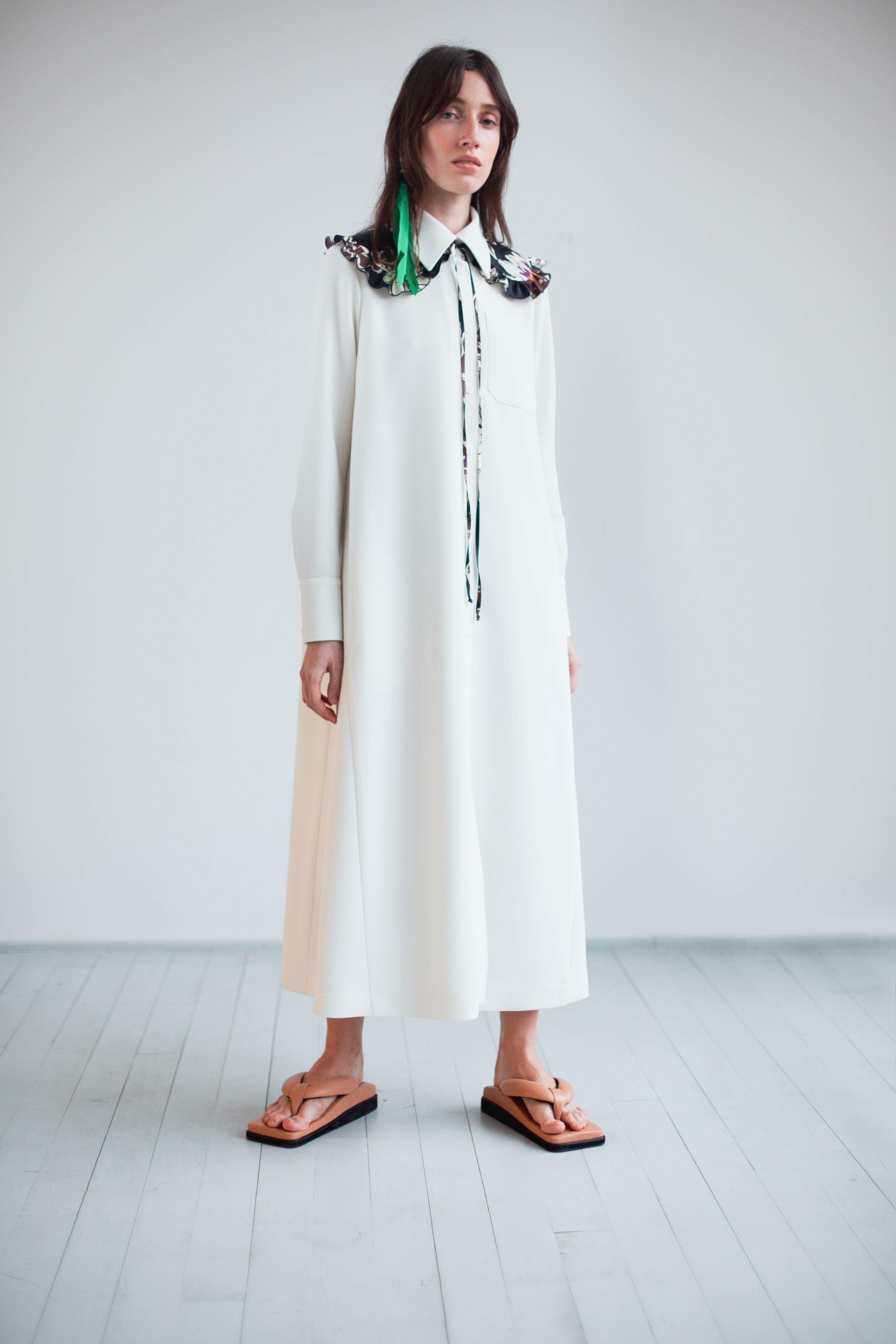 В новой коллекции дизайнер Лилия Пустовит объединила традиции косовской керамики, с её орнаментальным "древом жизни", и эстетику португальской этники — в частности декоративные приемы, которые встречаются на плитке "азулежу". Насыщенные осенние краски сочетаются с классической клеткой и знаковым для бренда цветочными принтом. Женственные платья дополнены отложными воротниками из экокожи, декорированными бахромой. Оставаясь верным своей ДНК, бренд Poustovit снова выдерживает грань между актуальностью и вневременной элегантностью.