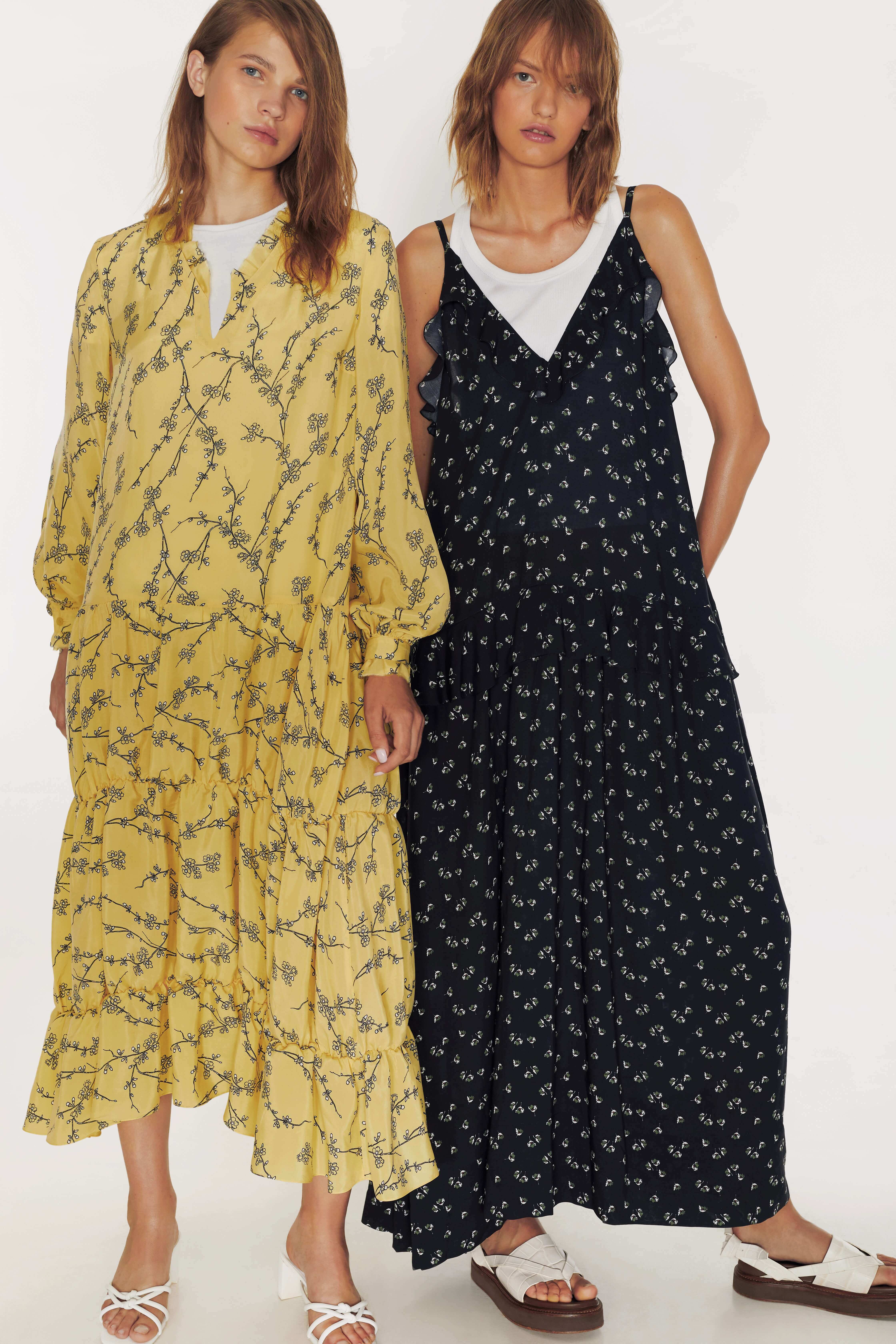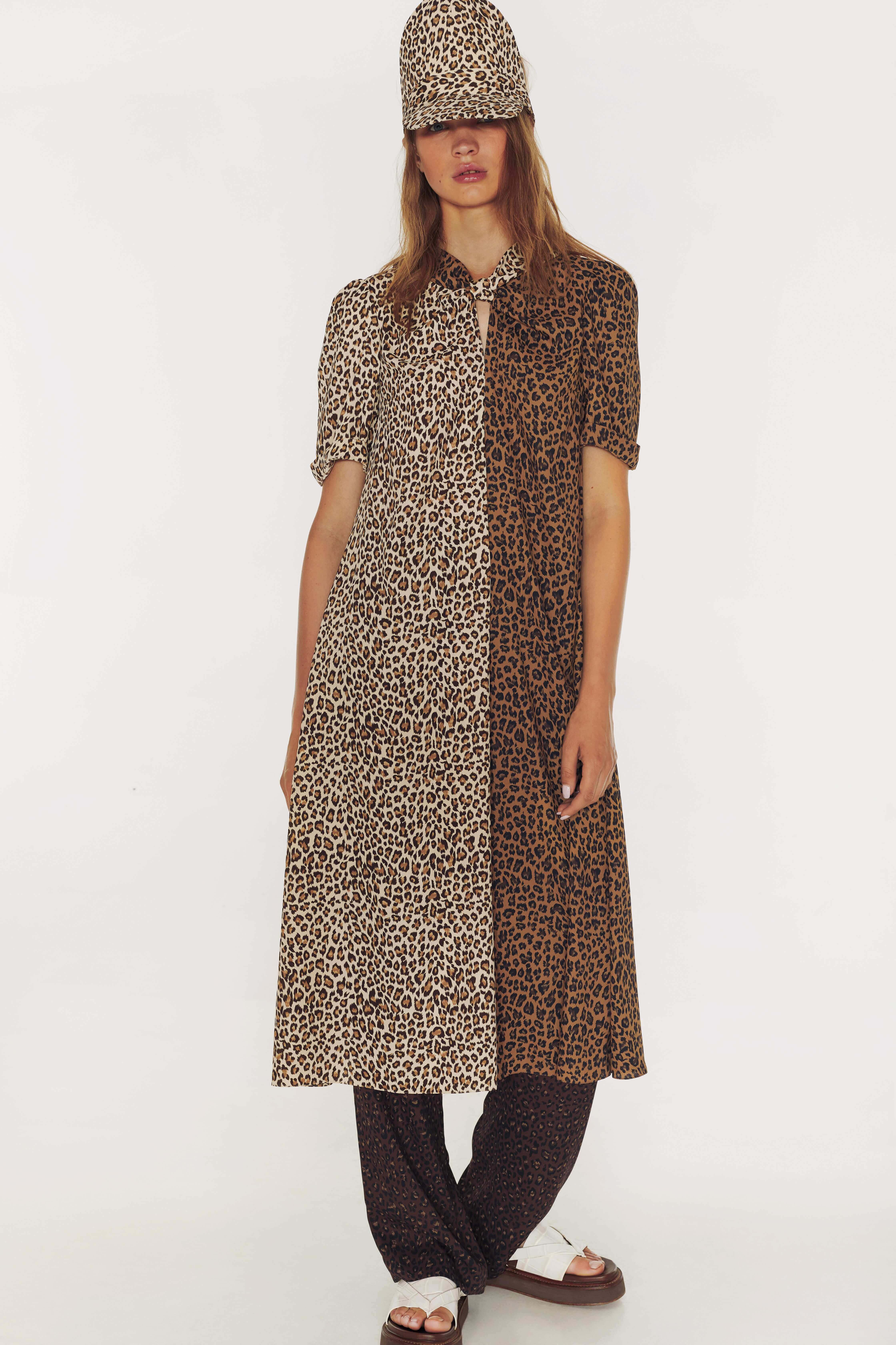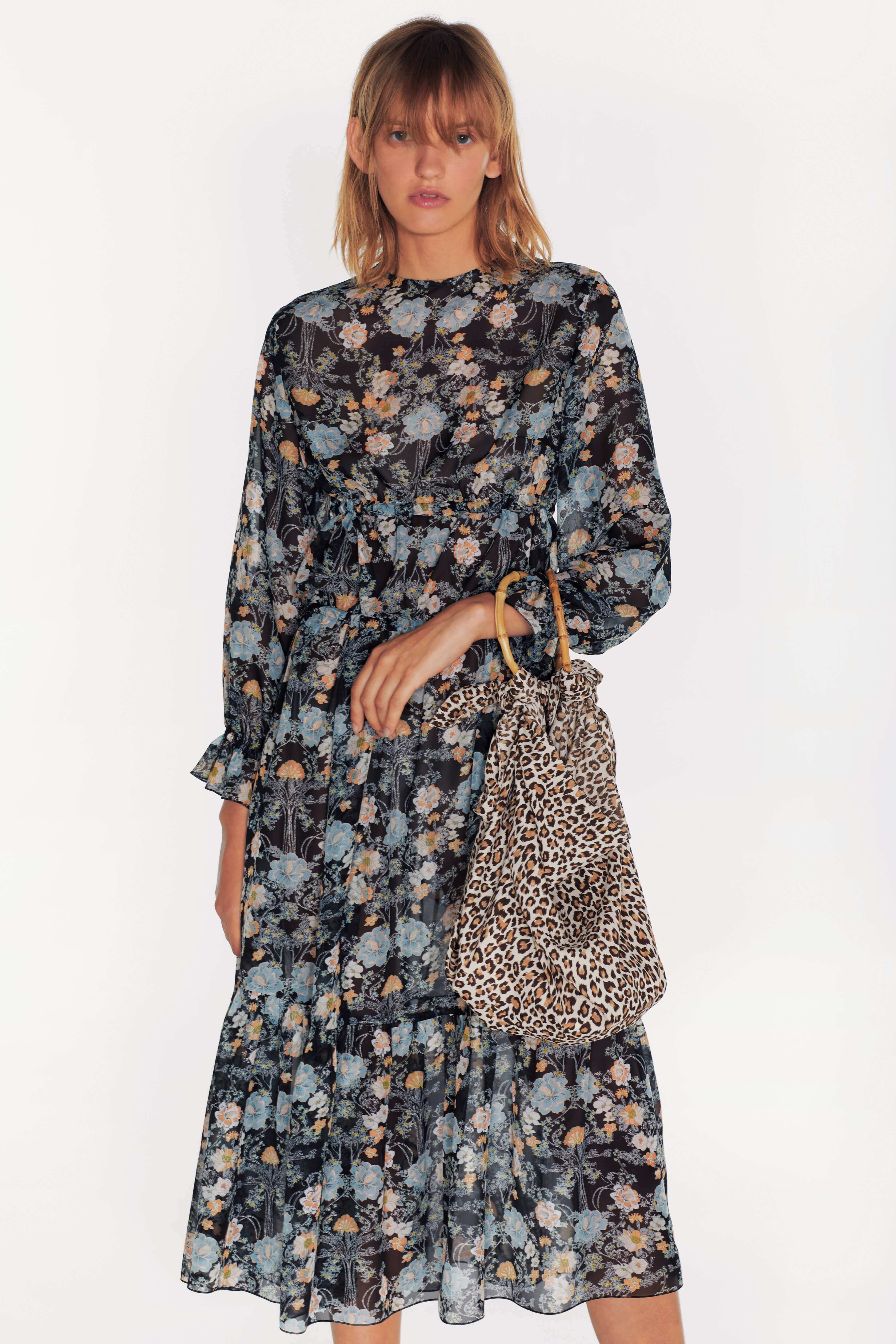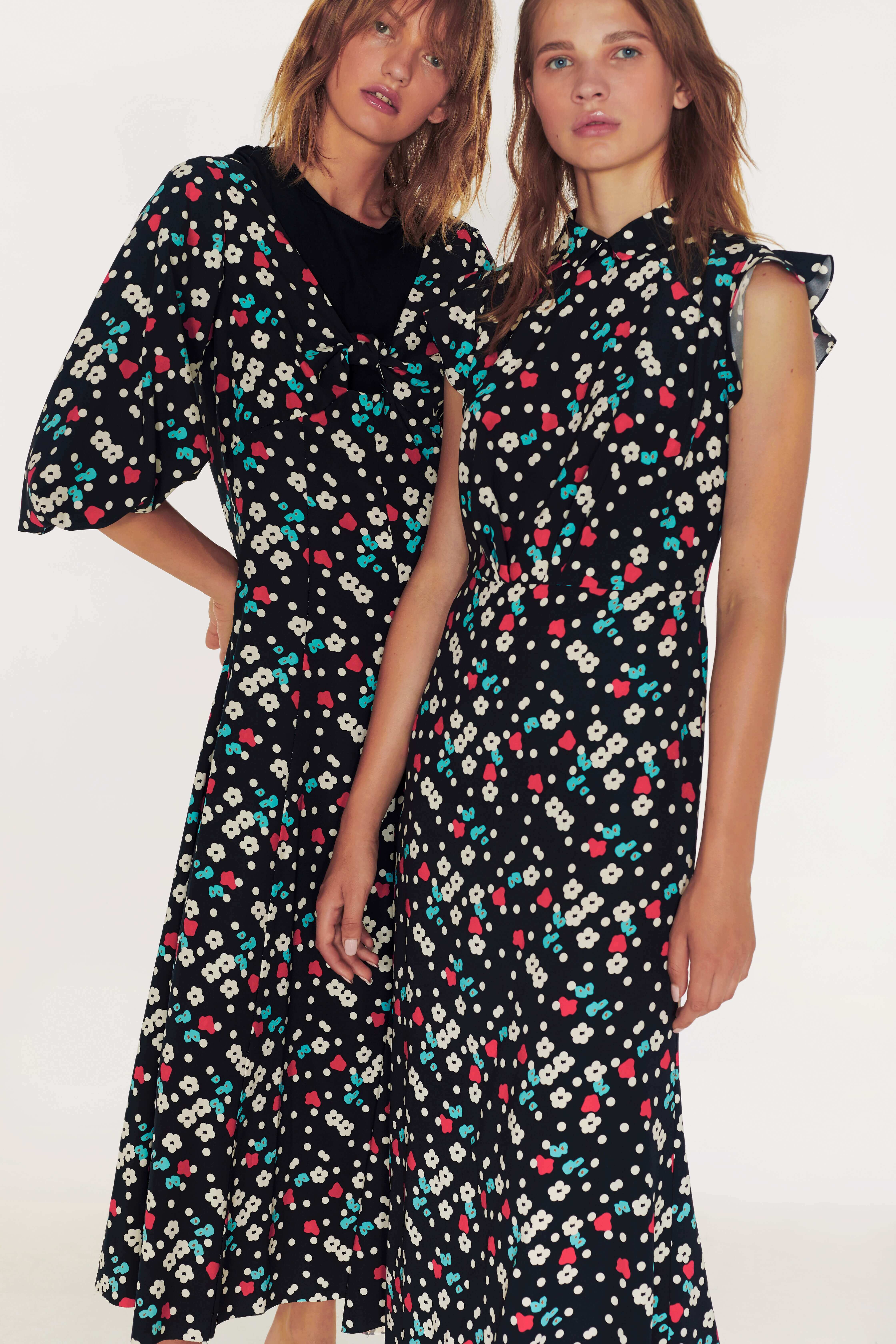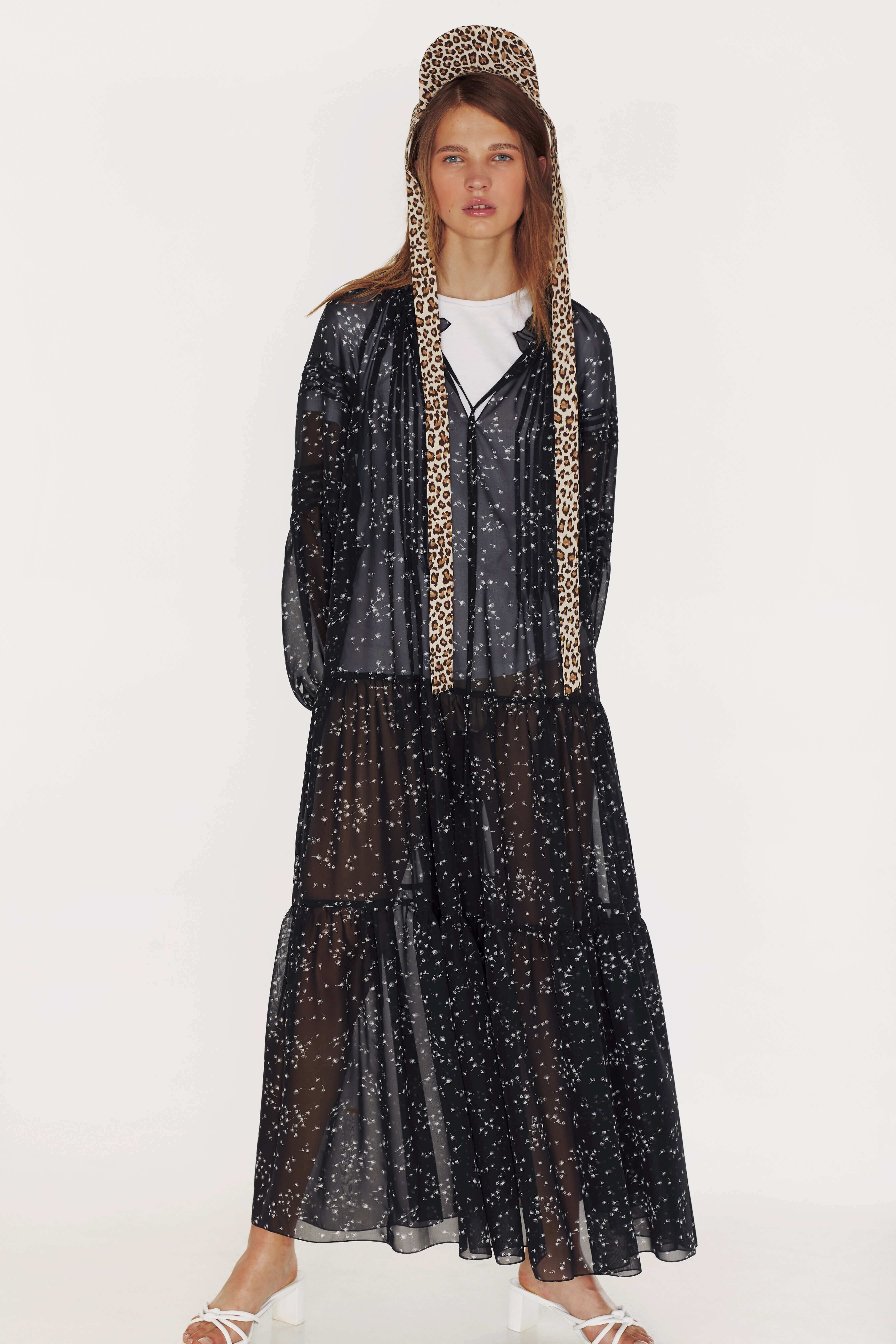 В новой коллекции дизайнер сочетает леопард с цветочными принтами в нежно-голубом и ярко-желтом оттенках. Также в моделях прослеживается влияние 80-х годов: собранные на кулисках пояса, объемные рукава и пышные многоярусные юбки с воланами.