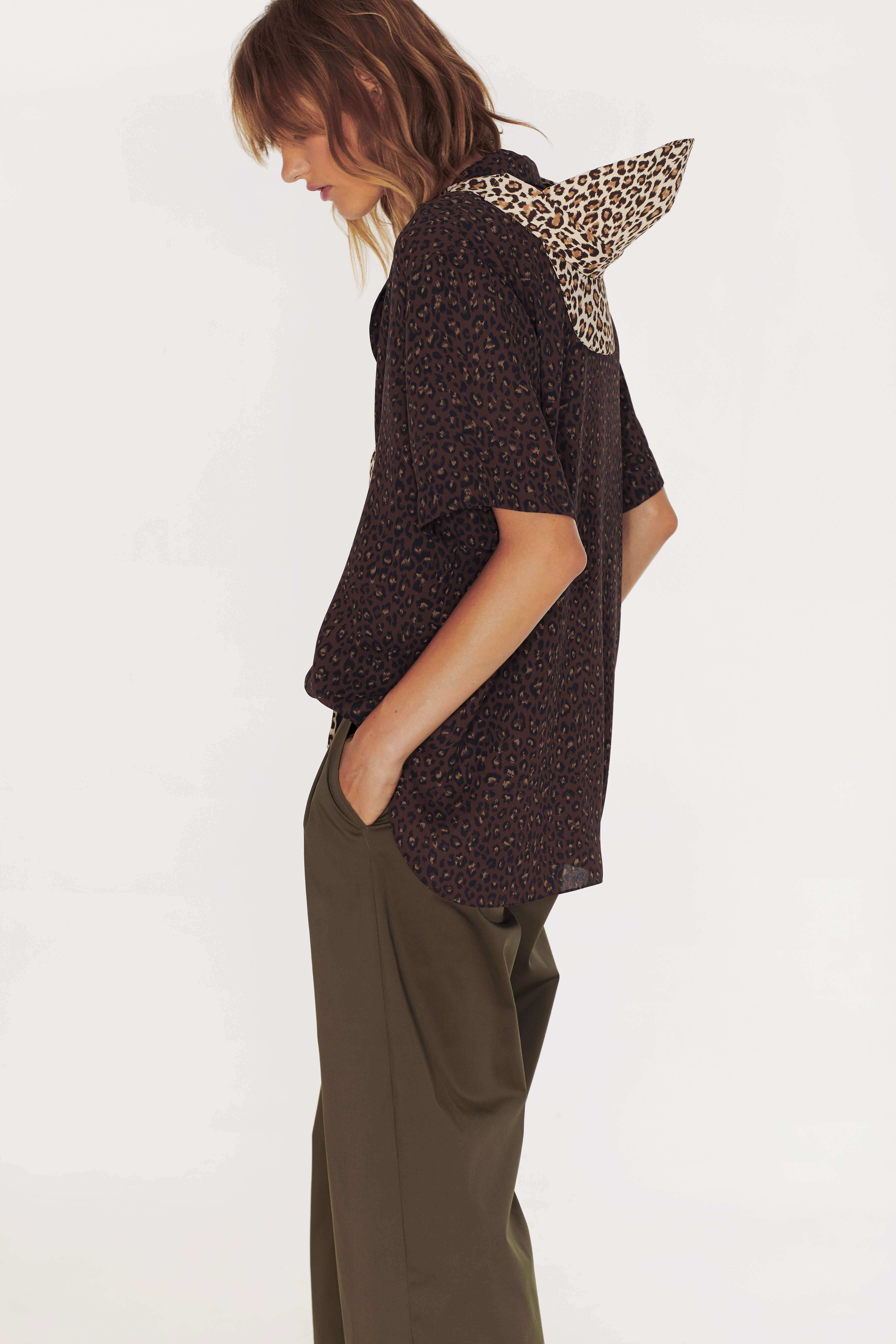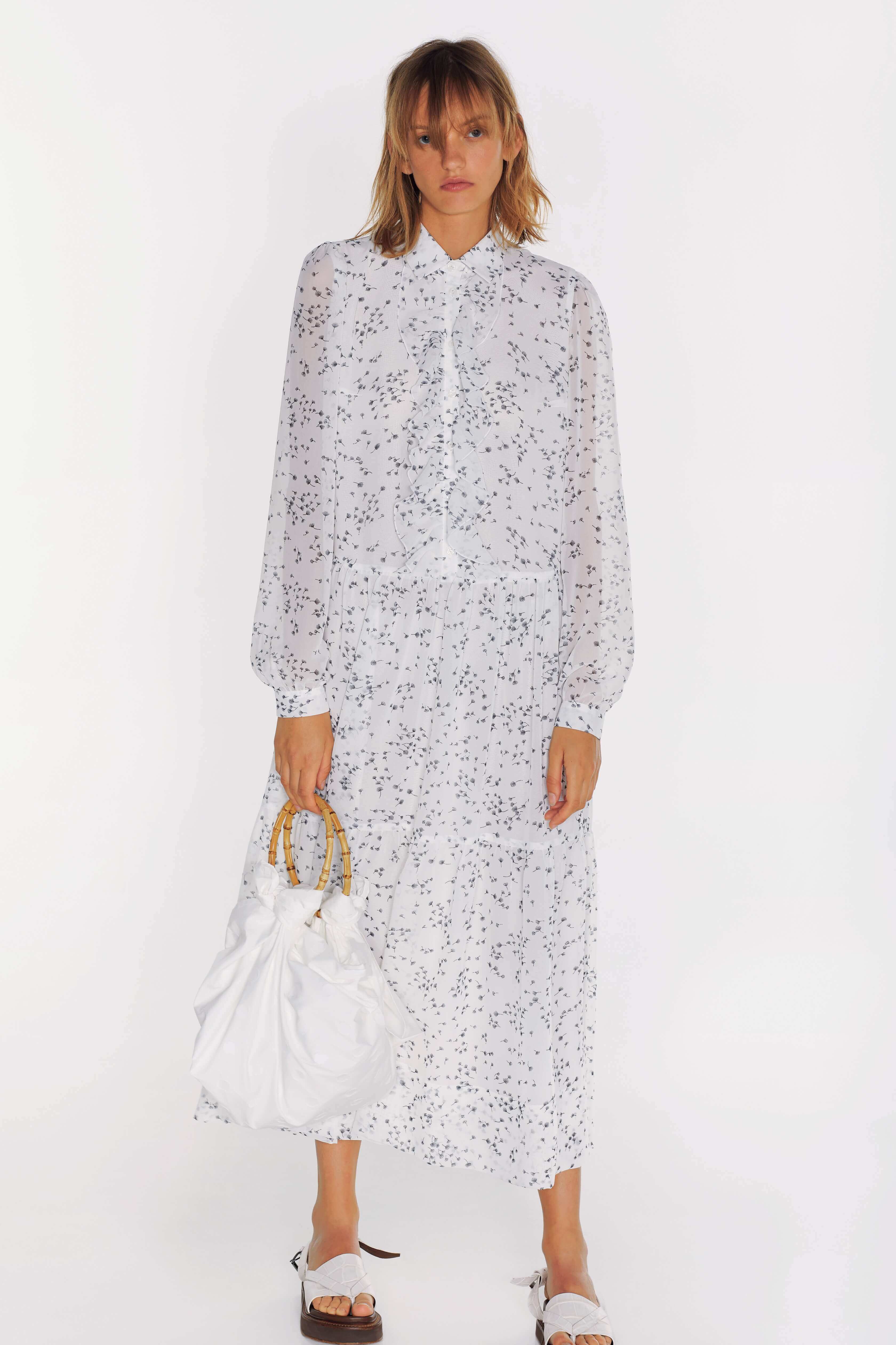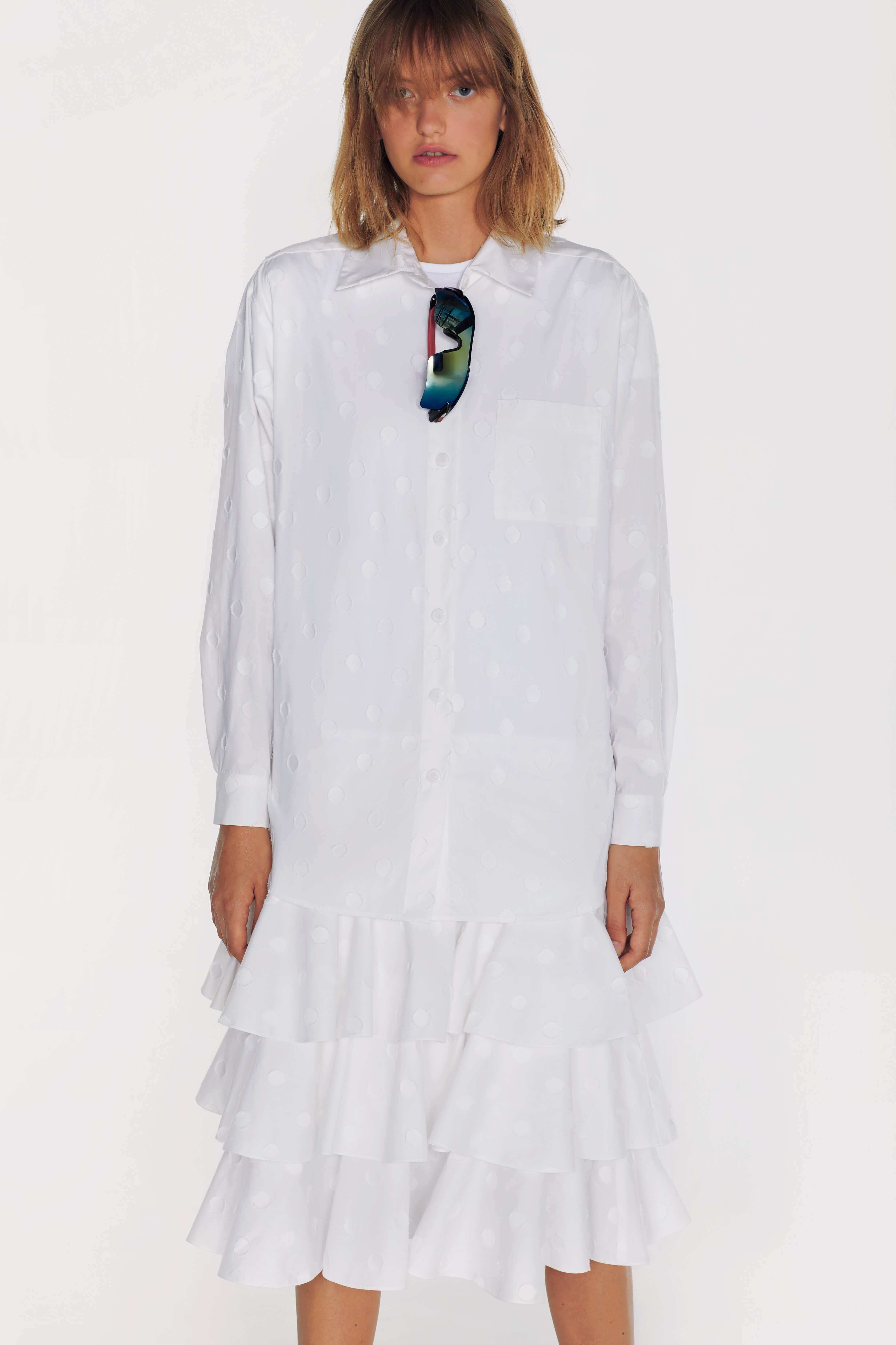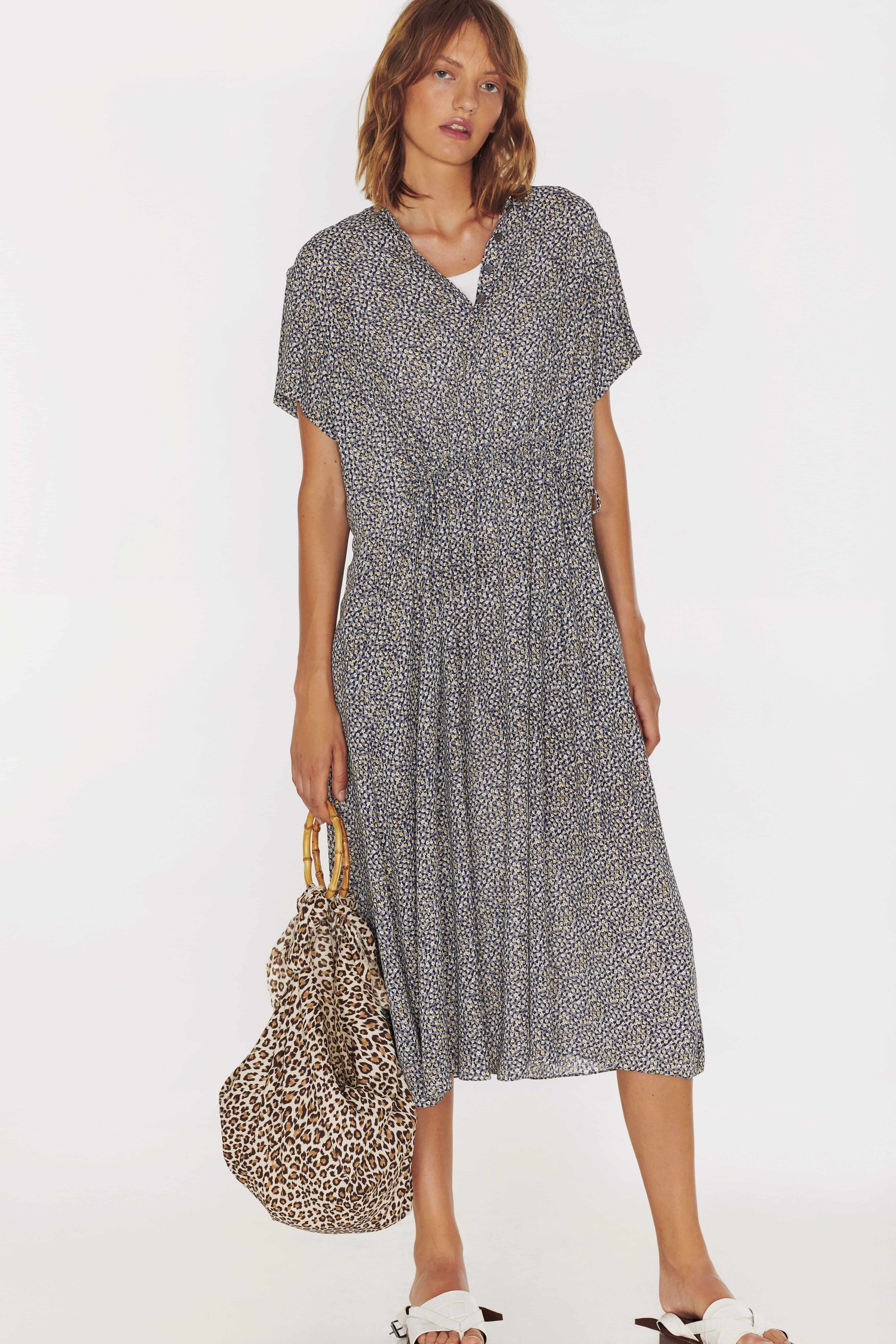 В новой коллекции дизайнер сочетает леопард с цветочными принтами в нежно-голубом и ярко-желтом оттенках. Также в моделях прослеживается влияние 80-х годов: собранные на кулисках пояса, объемные рукава и пышные многоярусные юбки с воланами.