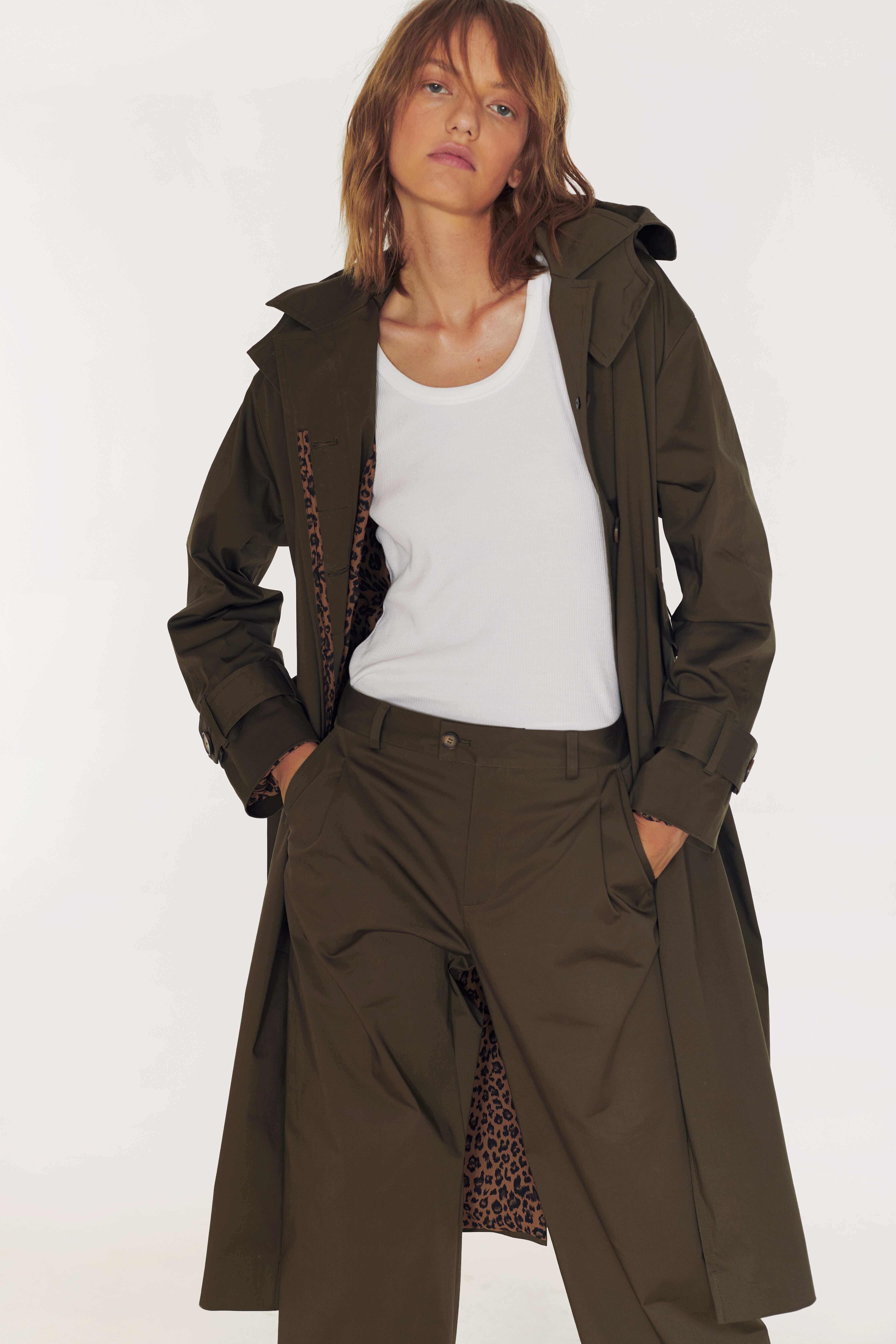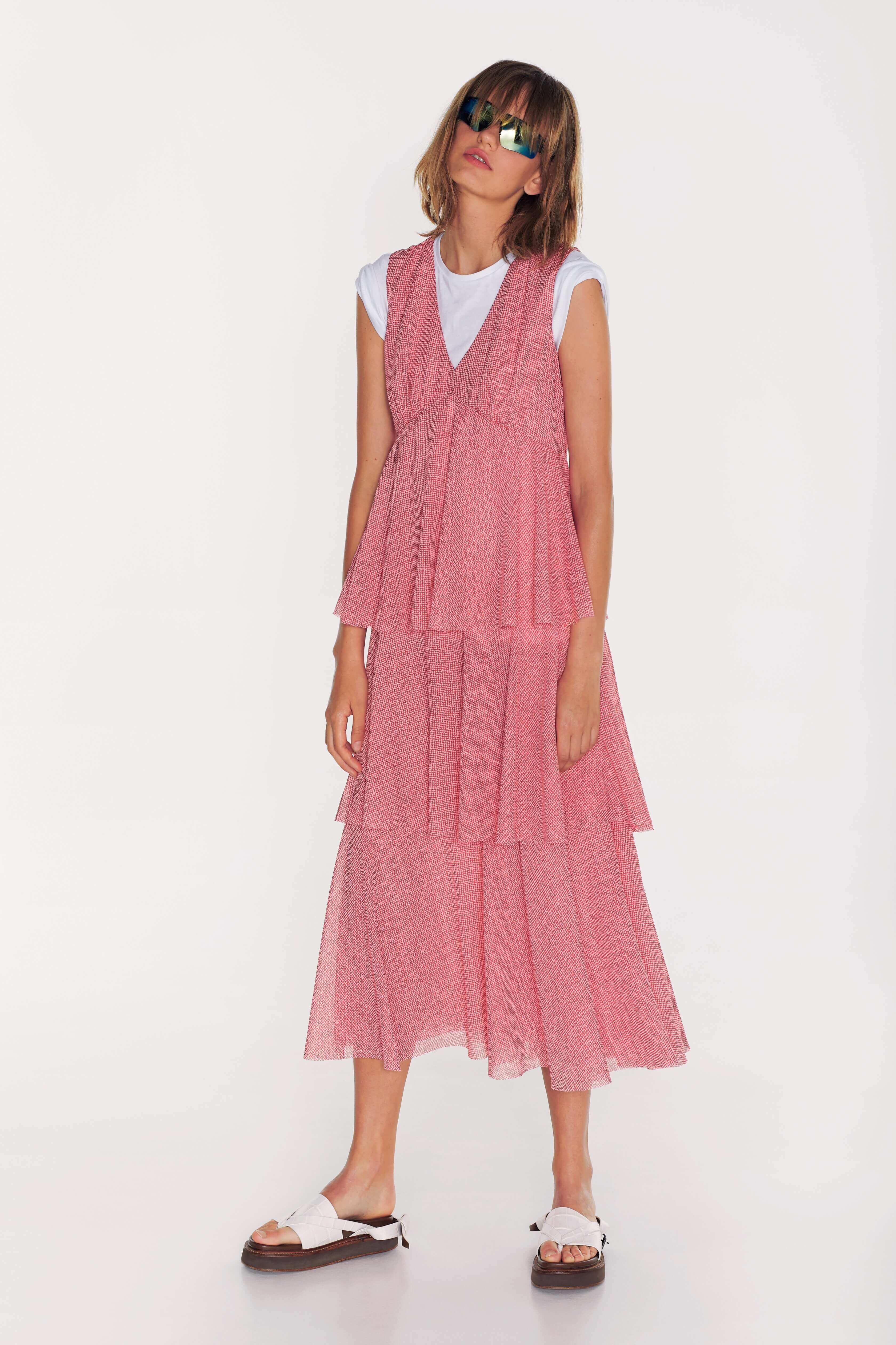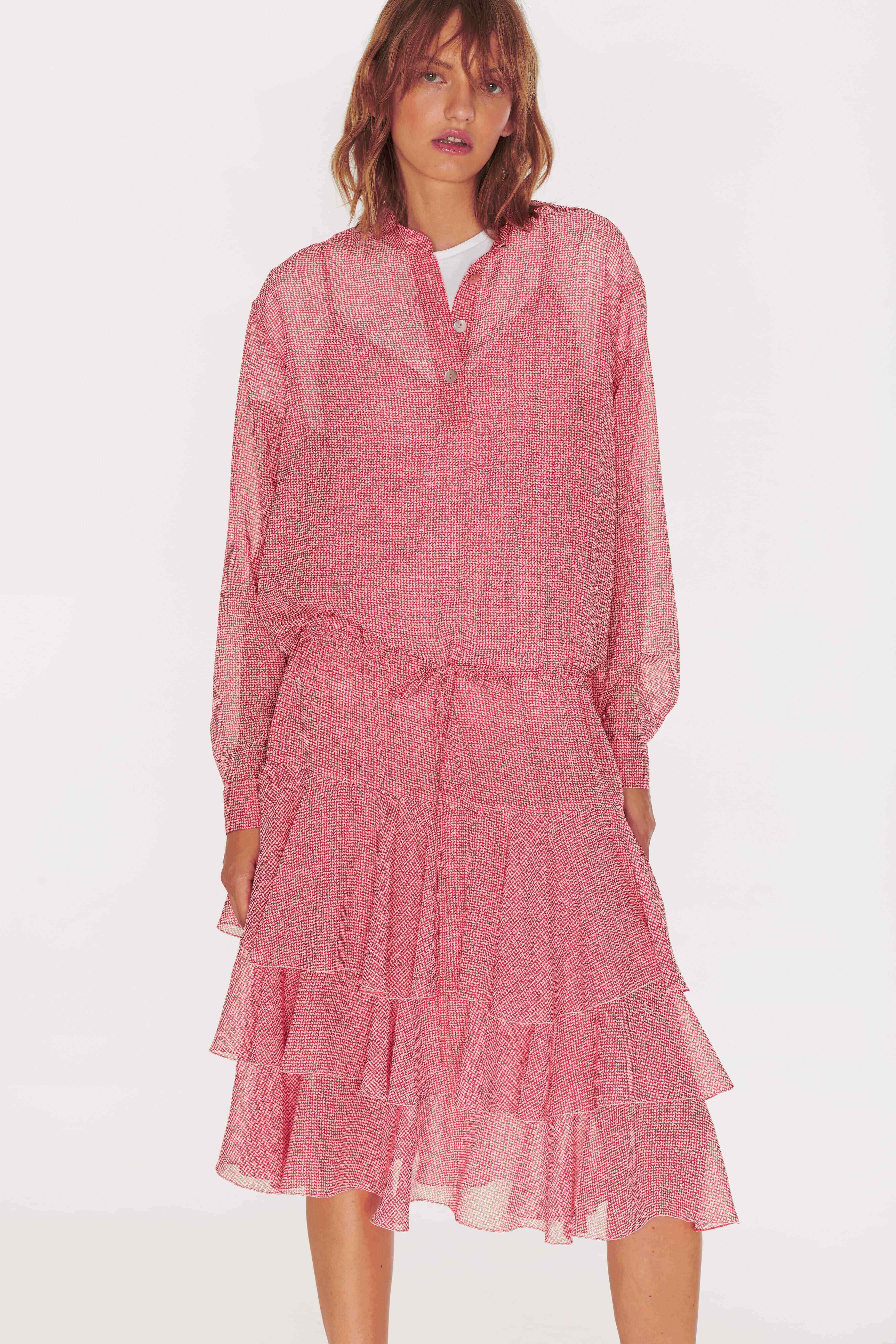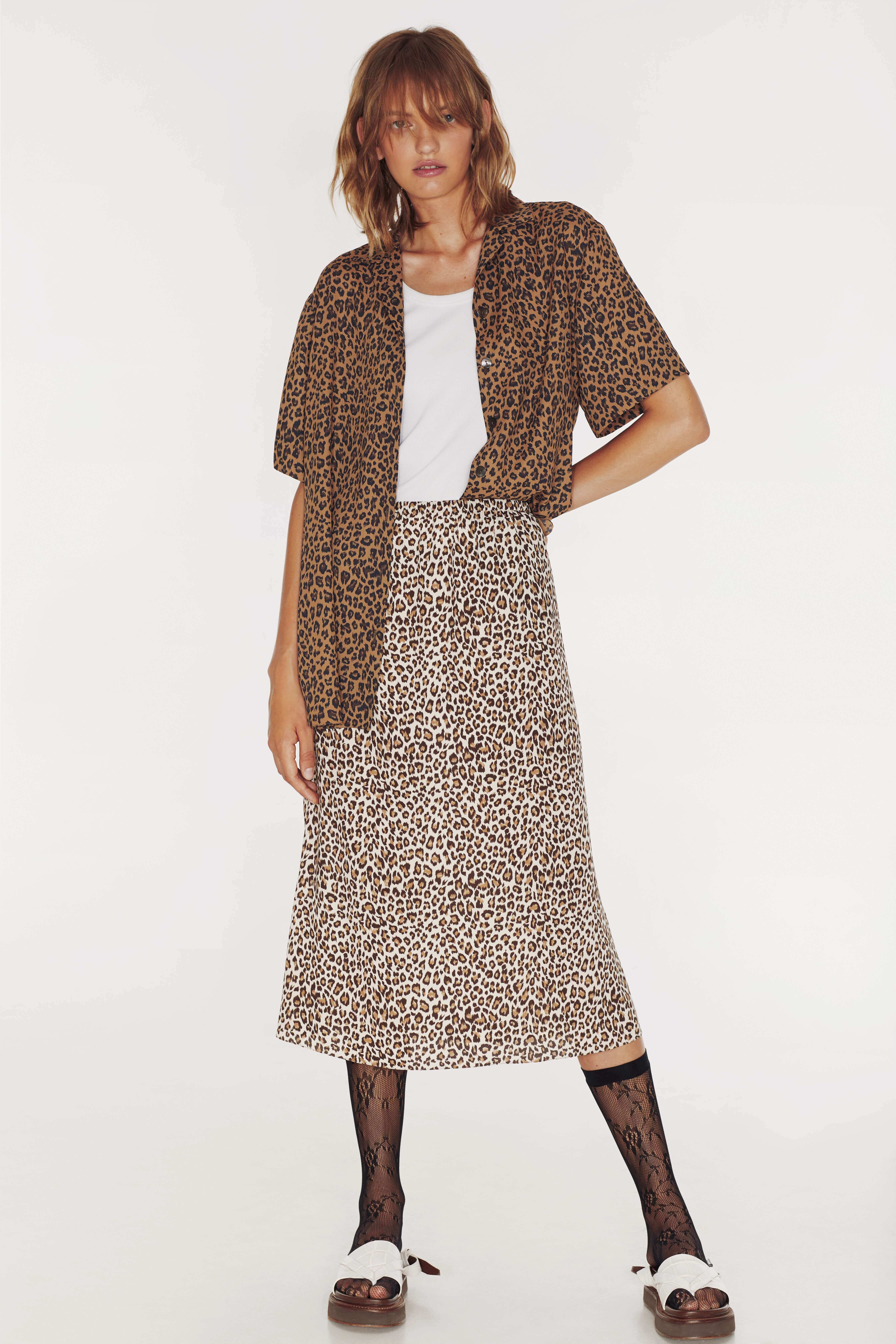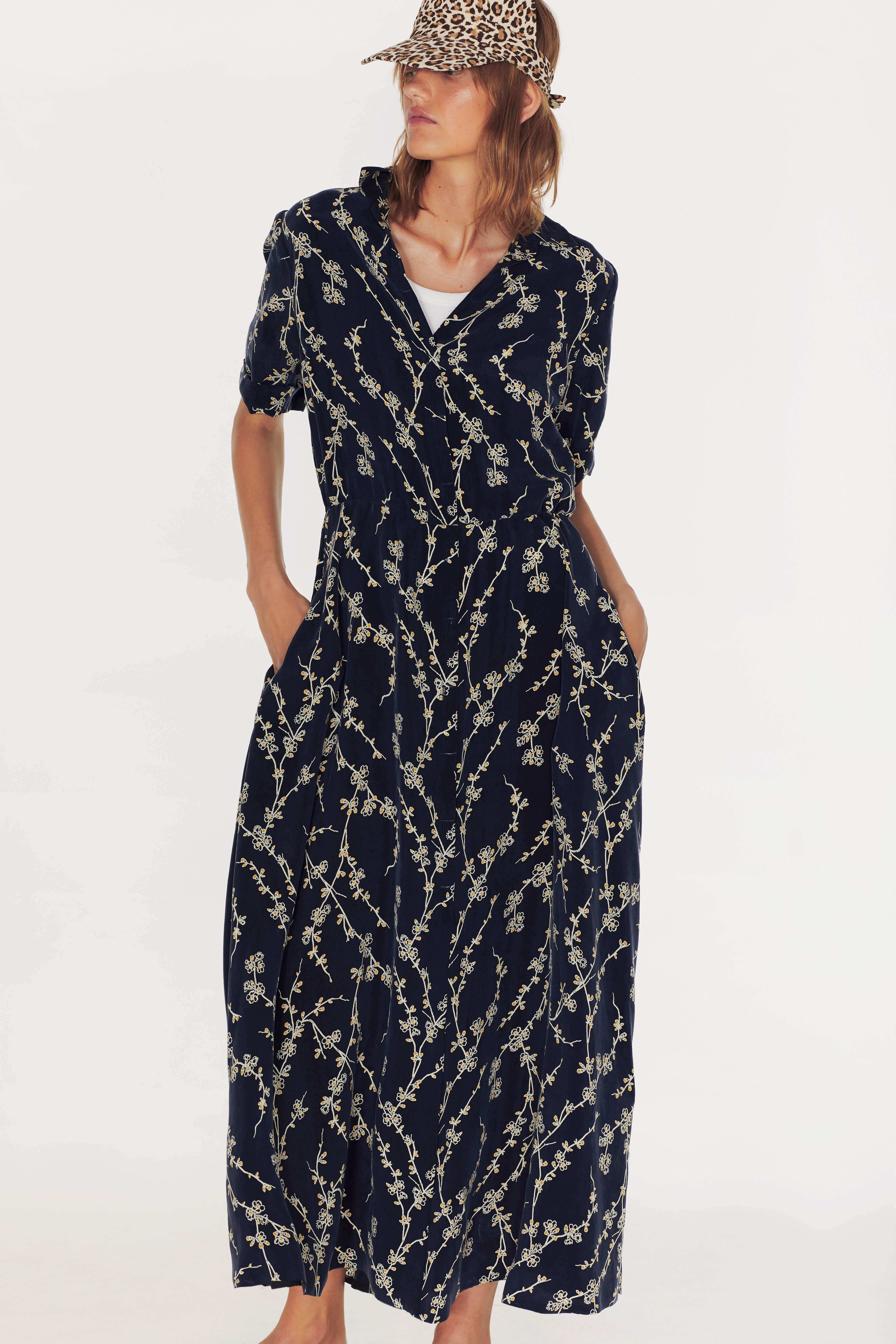 В новой коллекции дизайнер сочетает леопард с цветочными принтами в нежно-голубом и ярко-желтом оттенках. Также в моделях прослеживается влияние 80-х годов: собранные на кулисках пояса, объемные рукава и пышные многоярусные юбки с воланами.