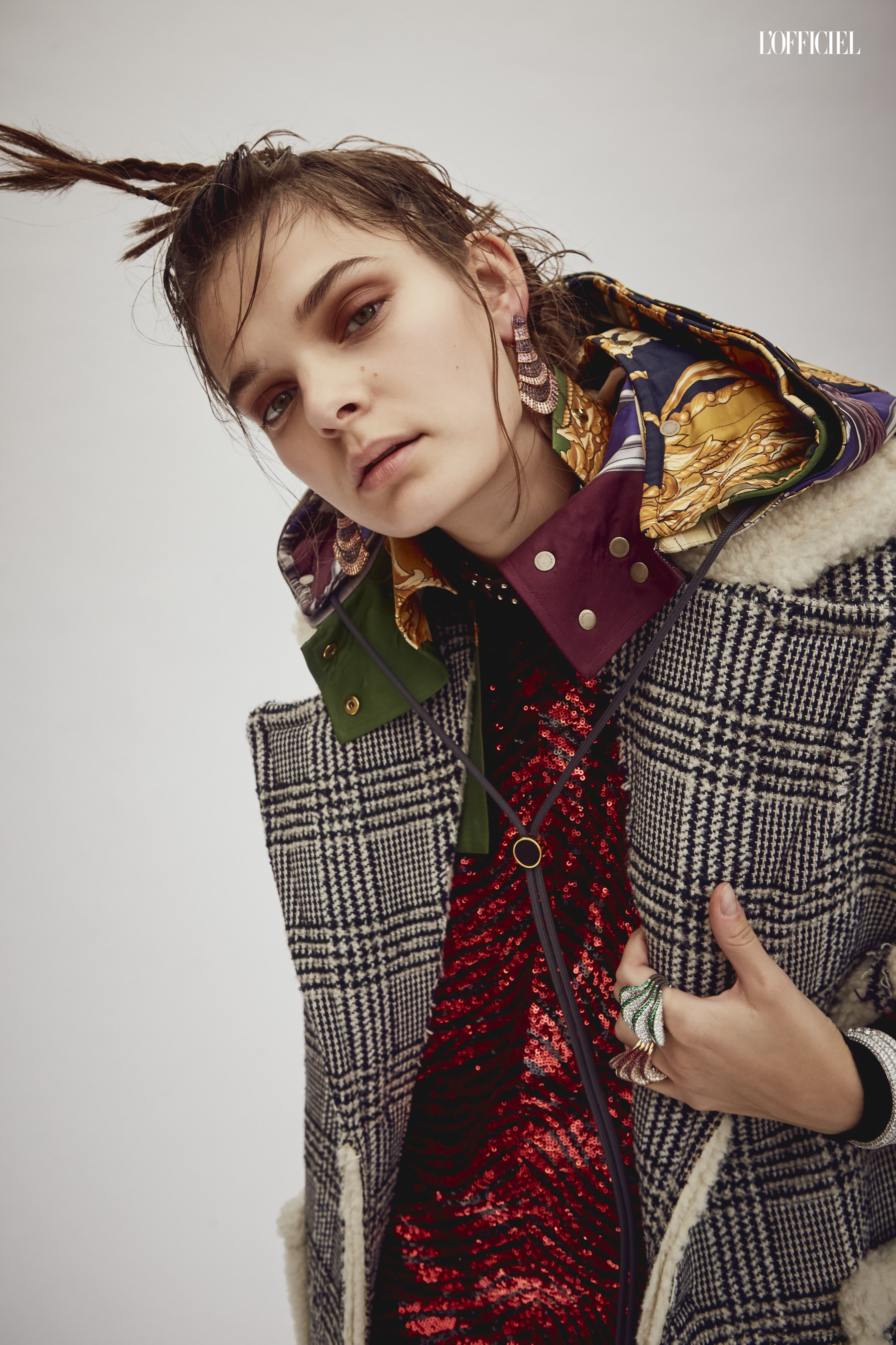 Свитер Alexandre Vauthier, худи и принтованное пальто Salvatore Ferragamo, пальто Zadig & Voltaire, чокер Zana Bayne, украшения De Grisogono